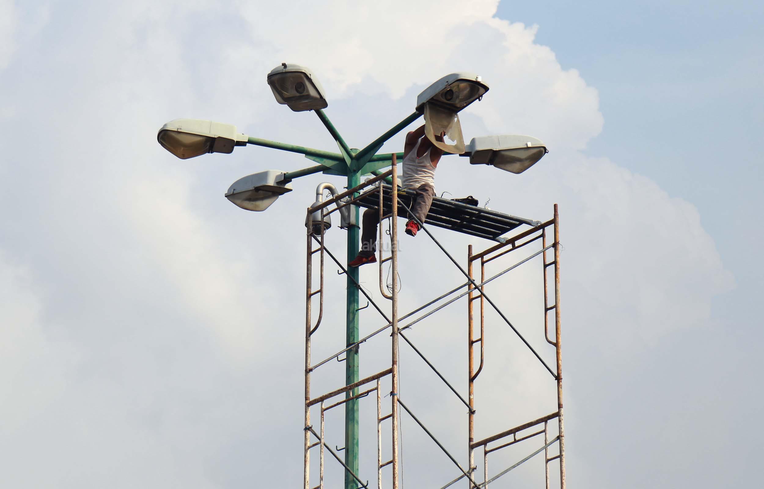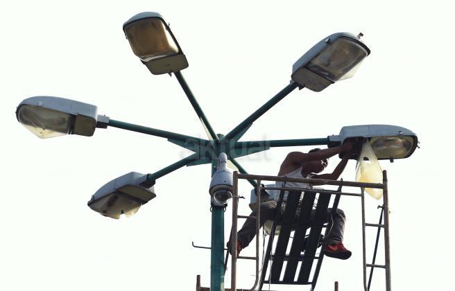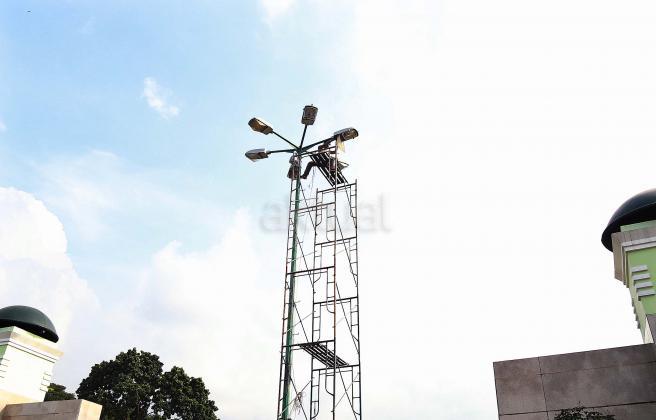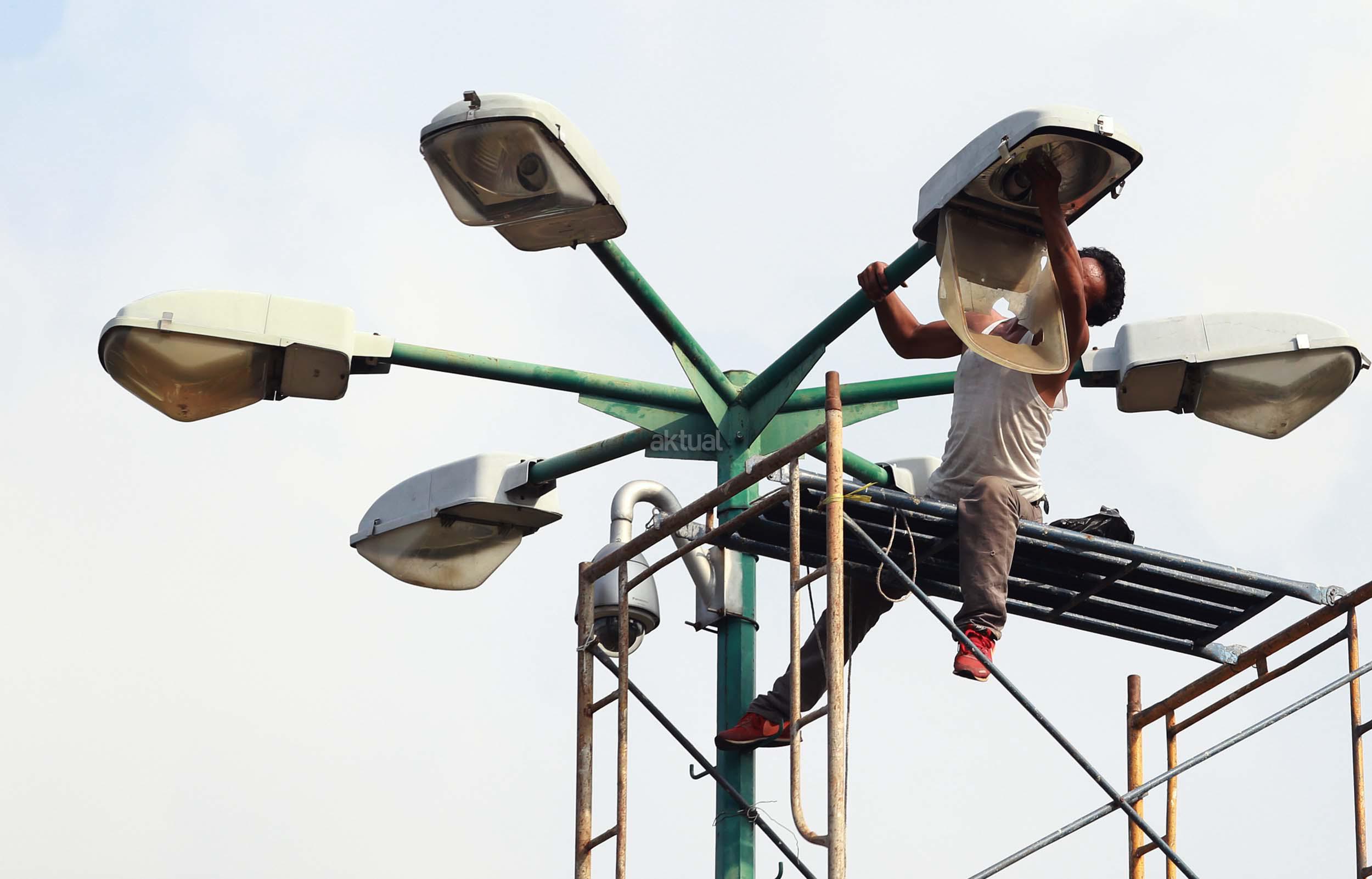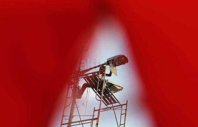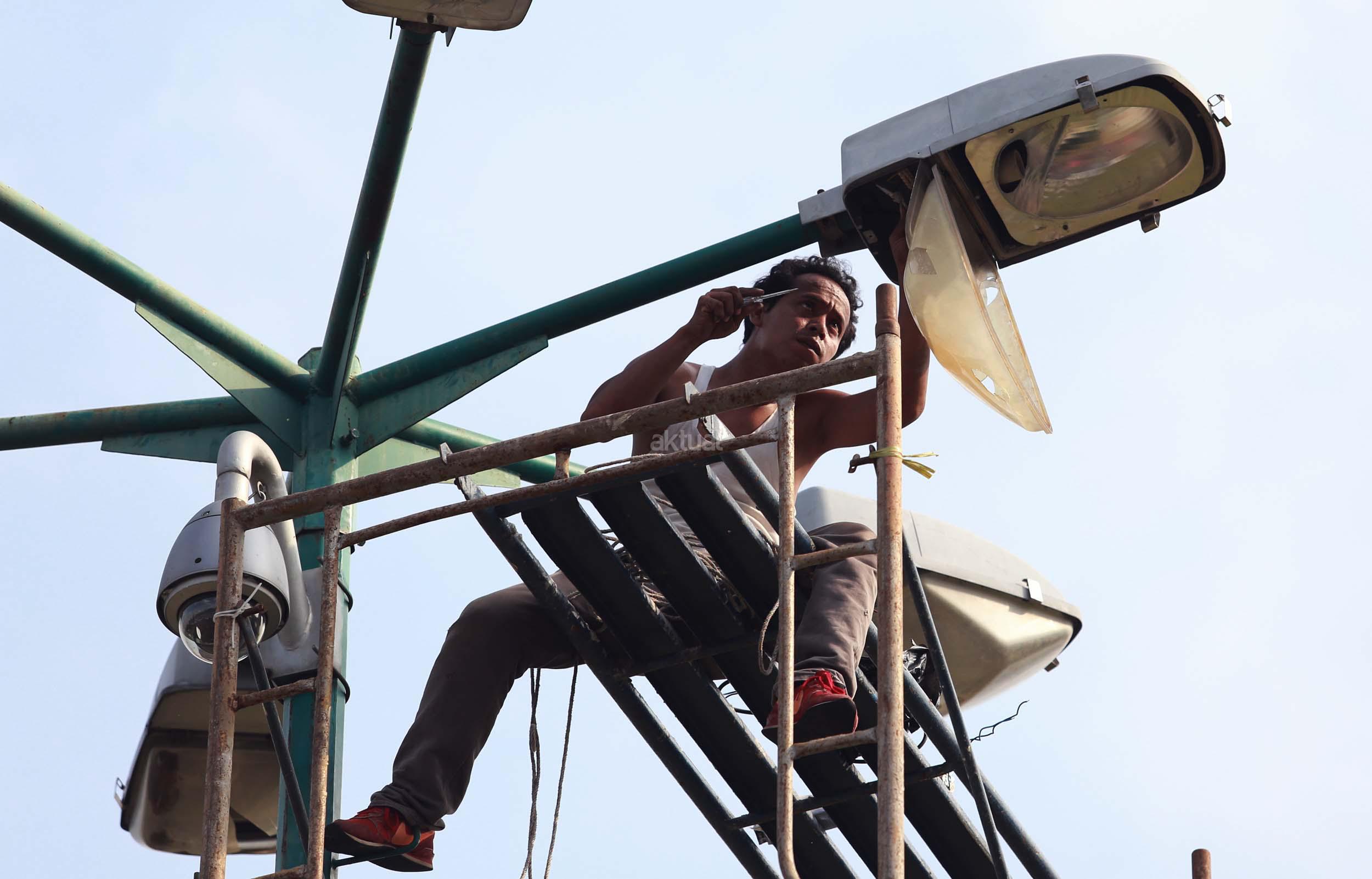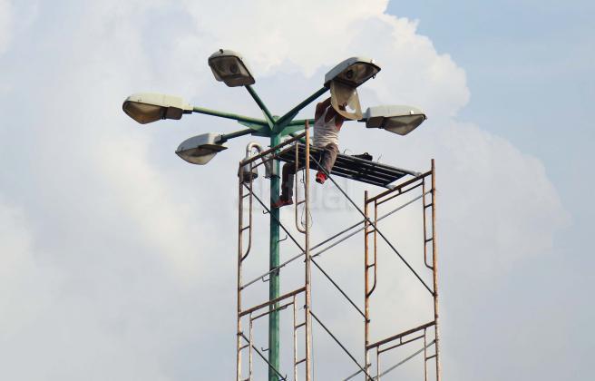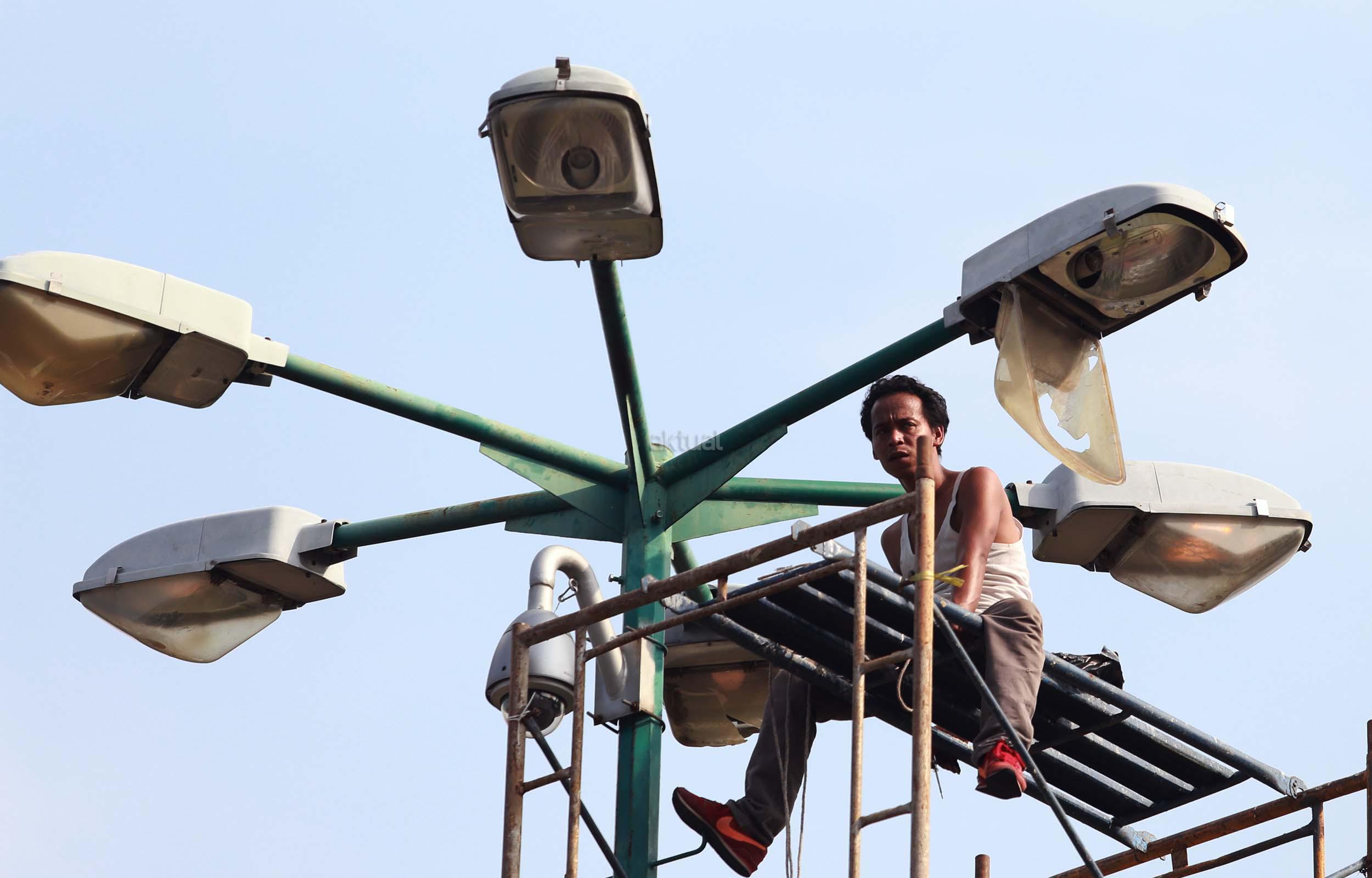 Pekerja melakukan perawatan lampu penerangan jalan di Komplek Parlemen, Senayan, Jakarta, Jumat (13/5/2016). Perawatan lampu secara berkala dilakukan guna mengecek kelayakan lampu penerangan di lokasi tersebut.
