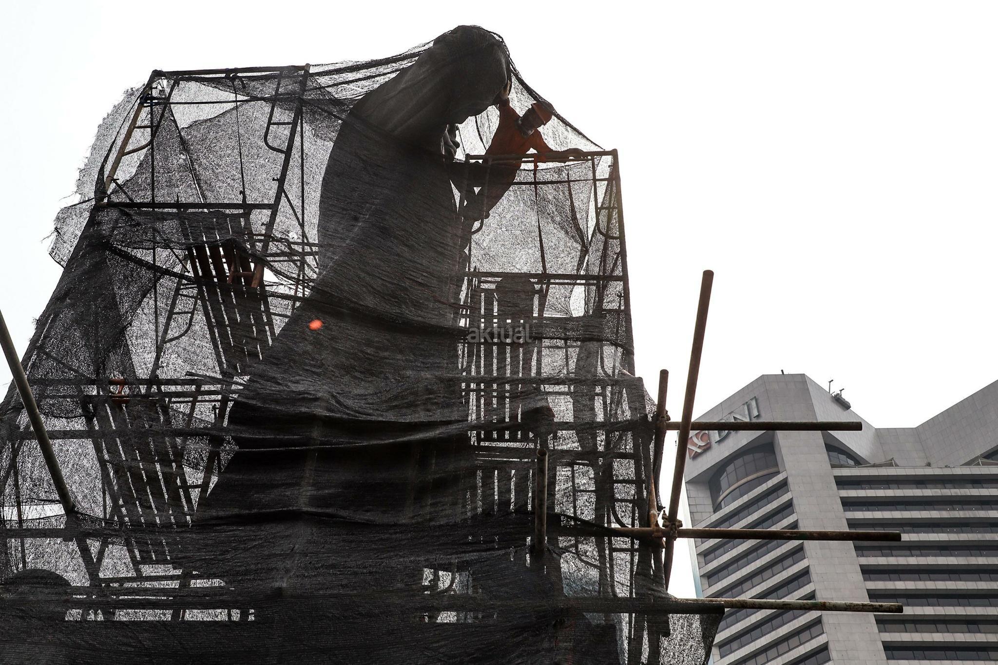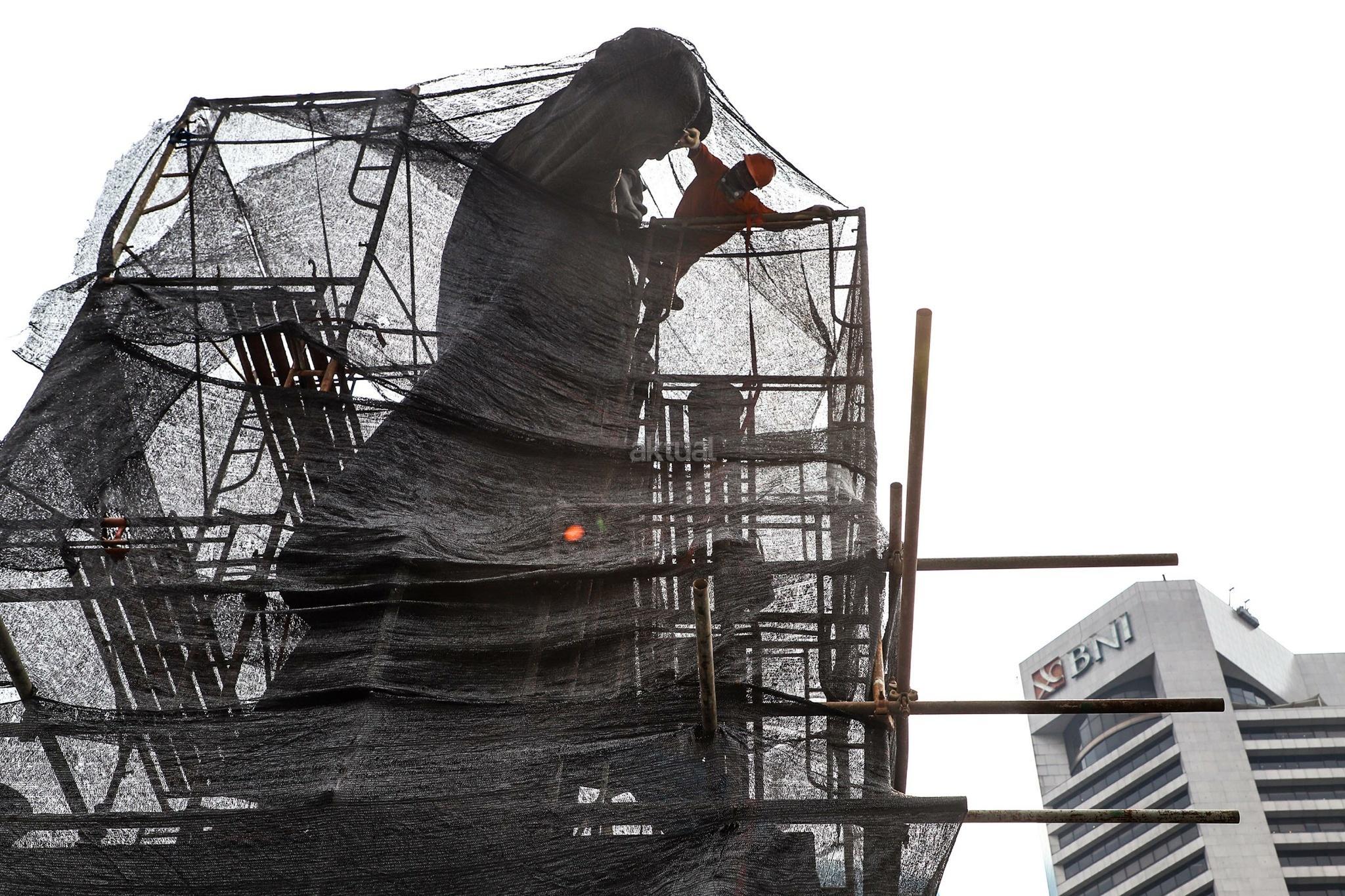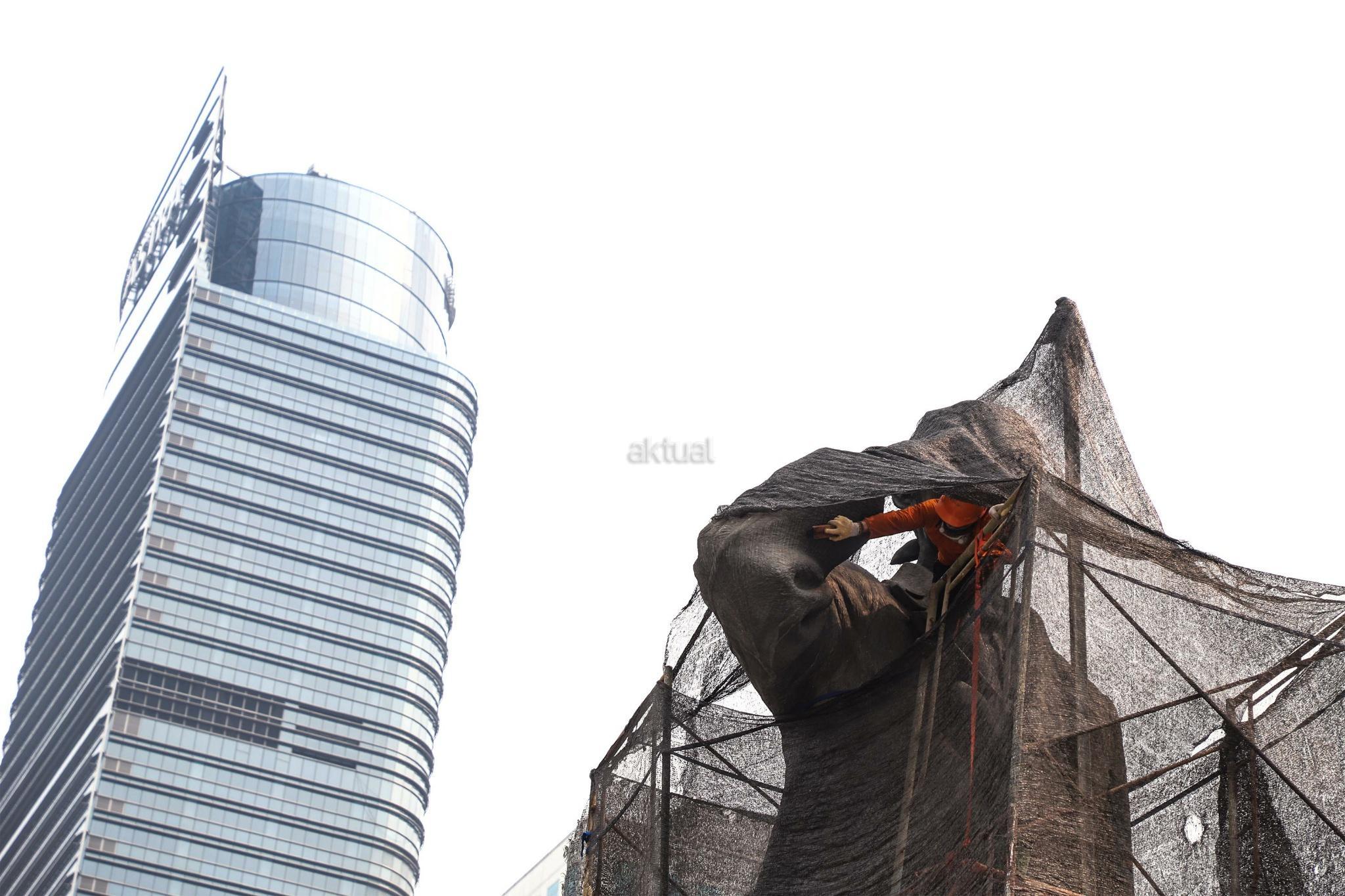 Pekerja melakukan perawatan patung Jenderal Sudirman di Jakarta, Senin (16/4). Perawatan tersebut dilakukan agar patung yang menjadi salah satu ikon kota Jakarta itu tetap bersih, terjaga dan terpelihara dari kerusakan yang disebabkan polutan serta cuaca. AKTUAL/Tino Okraviano