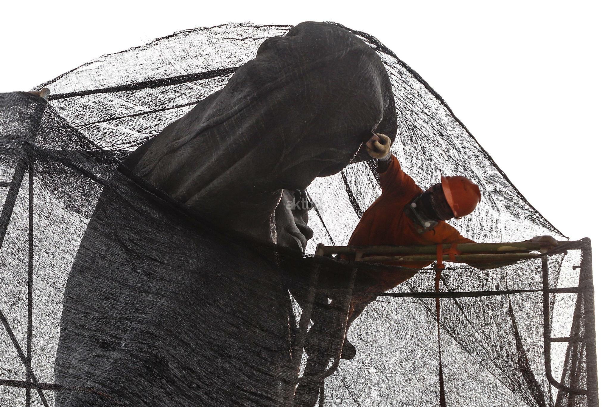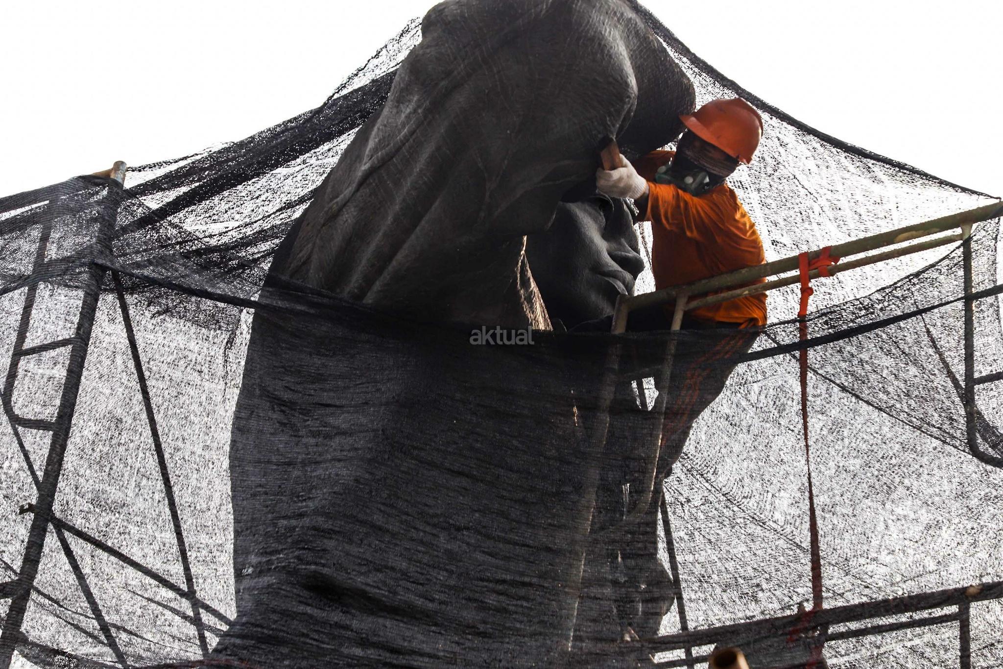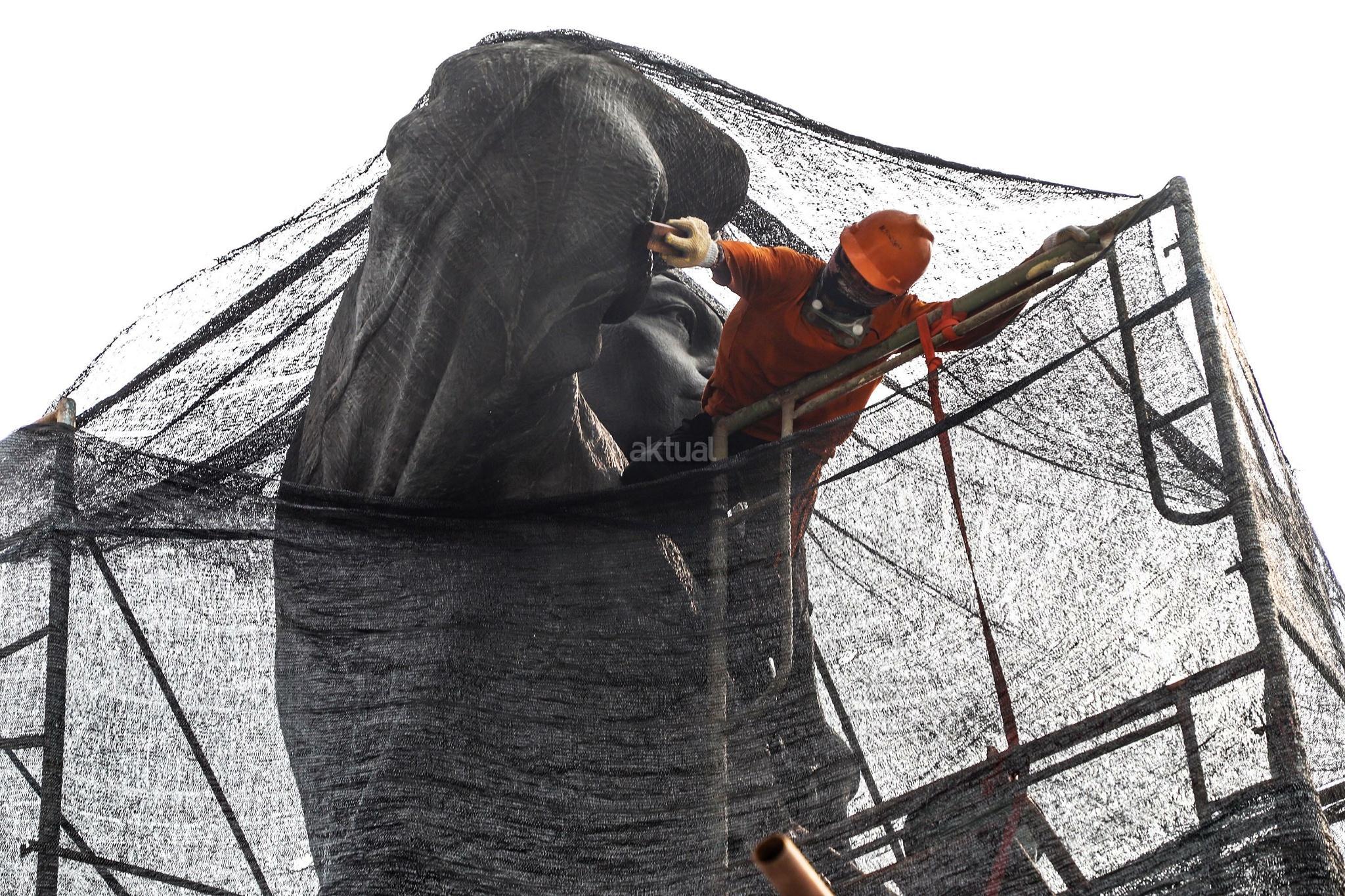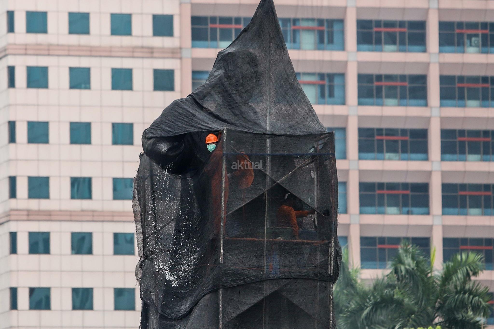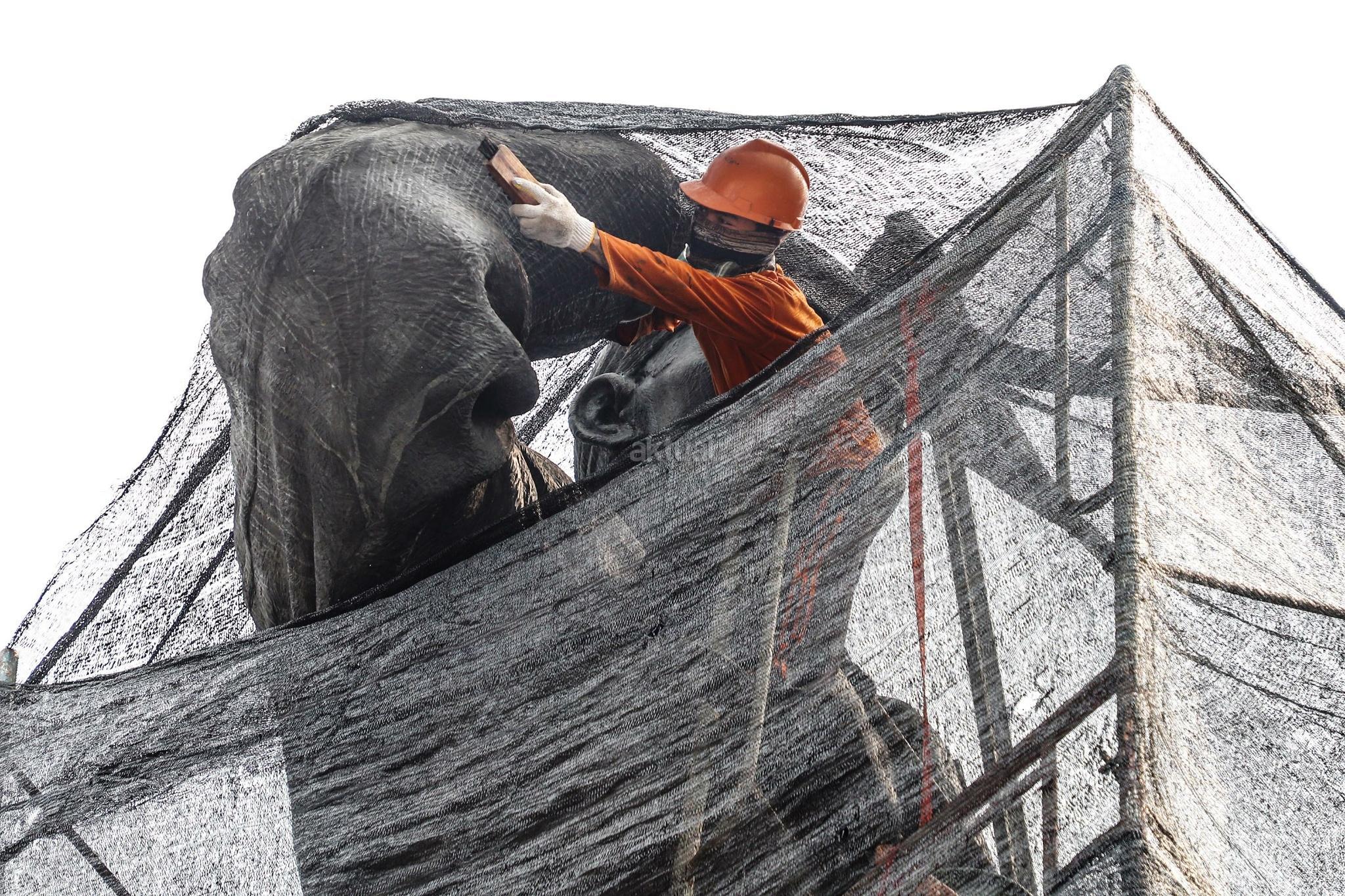 Pekerja melakukan perawatan patung Jenderal Sudirman di Jakarta, Selasa (16/4). Perawatan tersebut dilakukan agar patung yang menjadi salah satu ikon kota Jakarta itu tetap bersih, terjaga dan terpelihara dari kerusakan yang disebabkan polutan serta cuaca. AKTUAL/Tino Okraviano