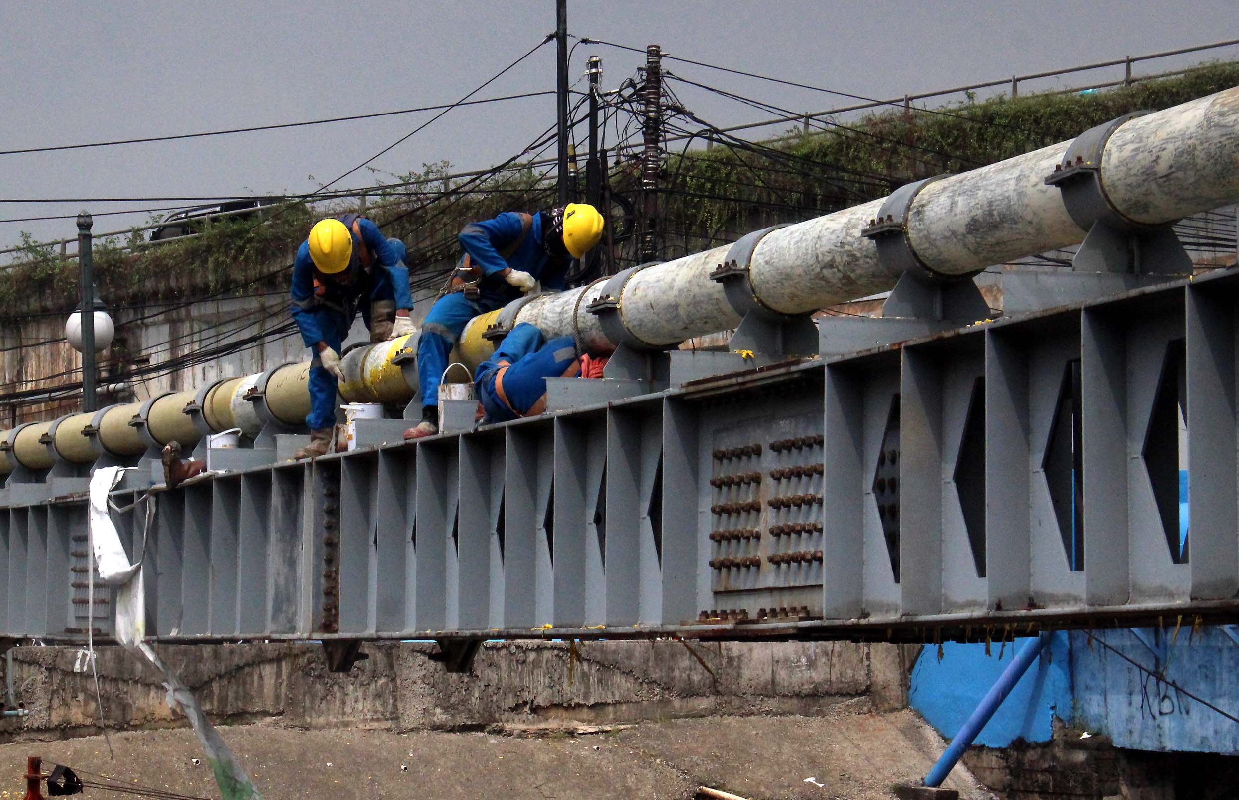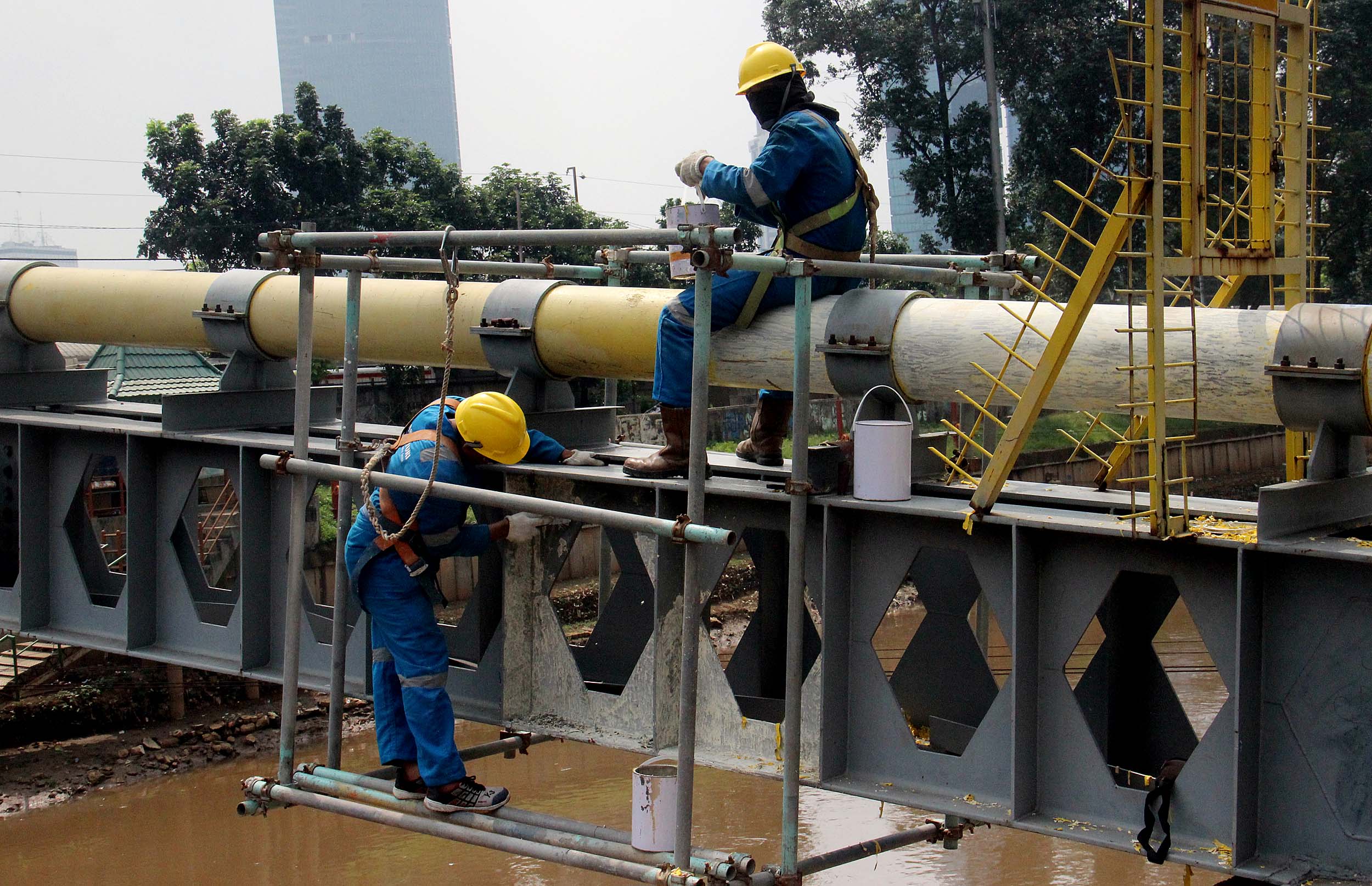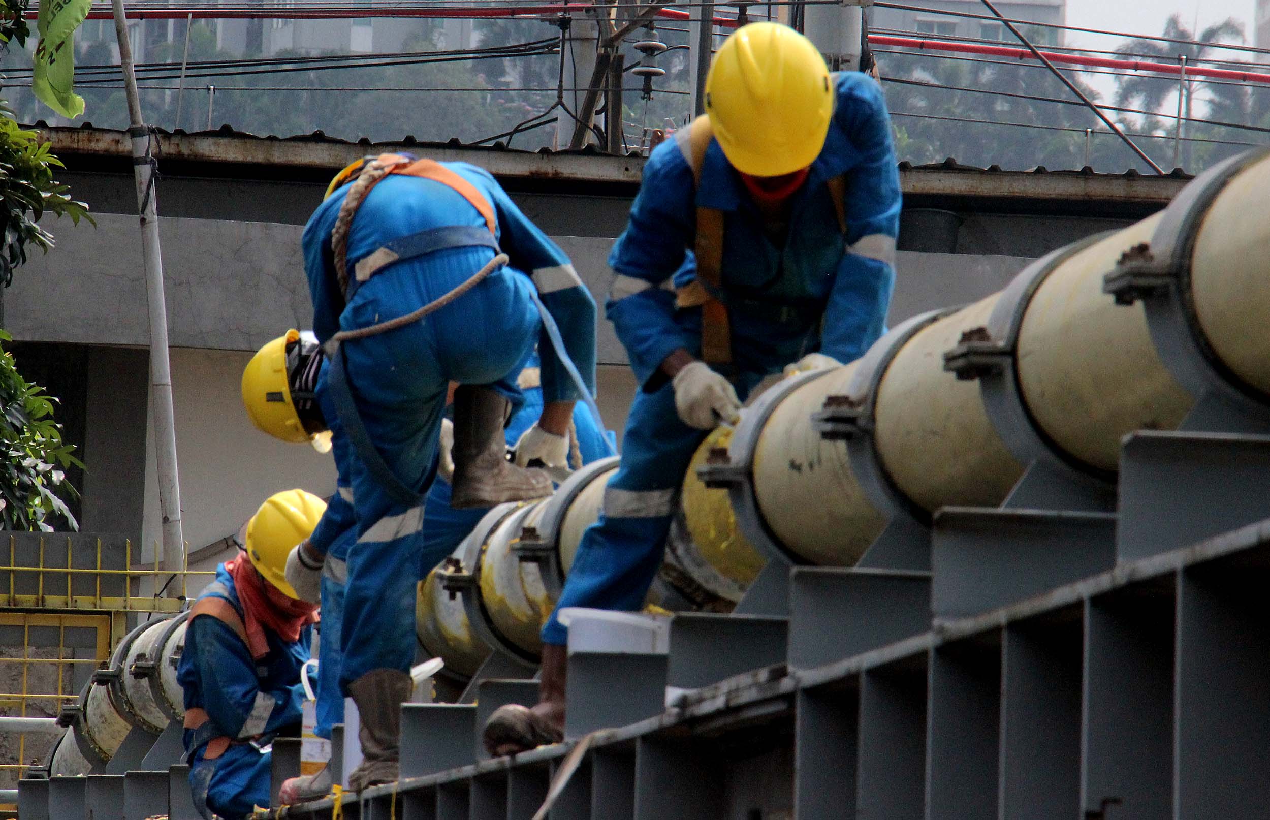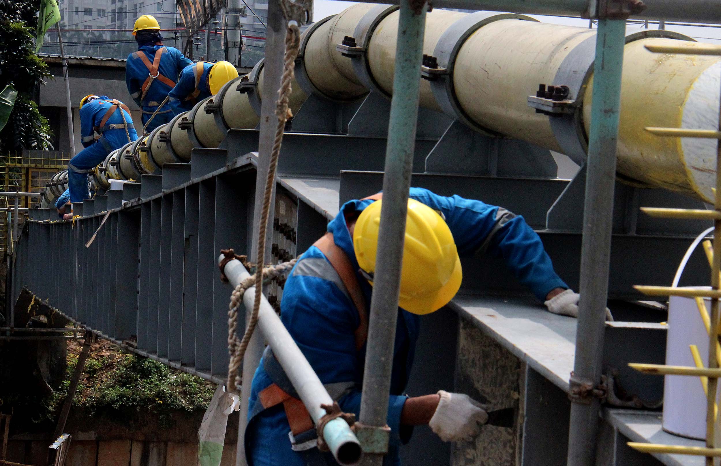 Para petugas Perusahaan Gas Negara (PGN) melakukan perawatan rutin dan pengecatan terhadap pipa gas yang melintasi Kanal Banjir Barat (KBB) di wilayah Karet Bivak, Jakarta, Kamis (11/8/2016). PGN menargetkan satu juta sambungan distribusi gas rumah tangga yang dimulai pada tahun ini.