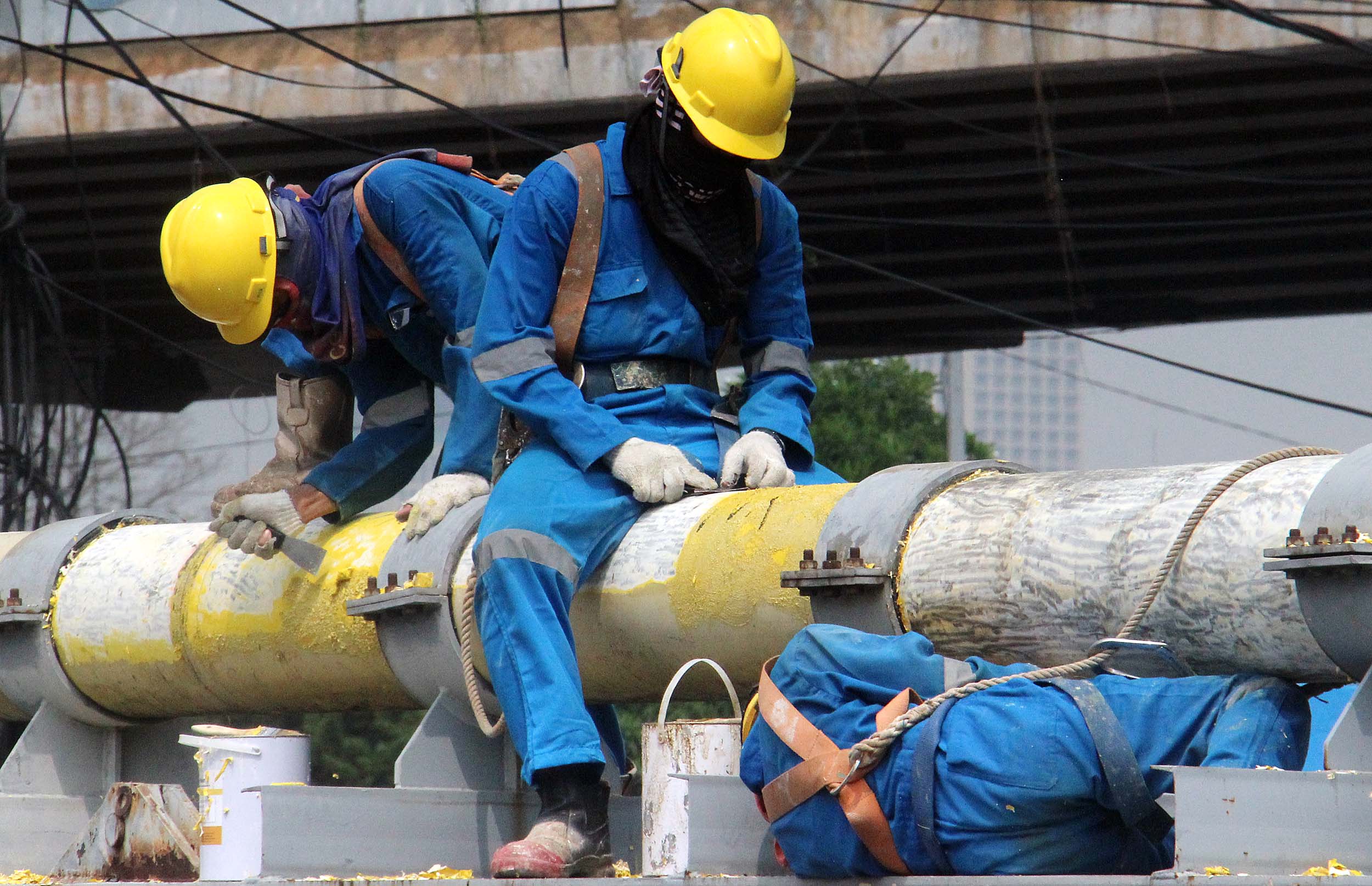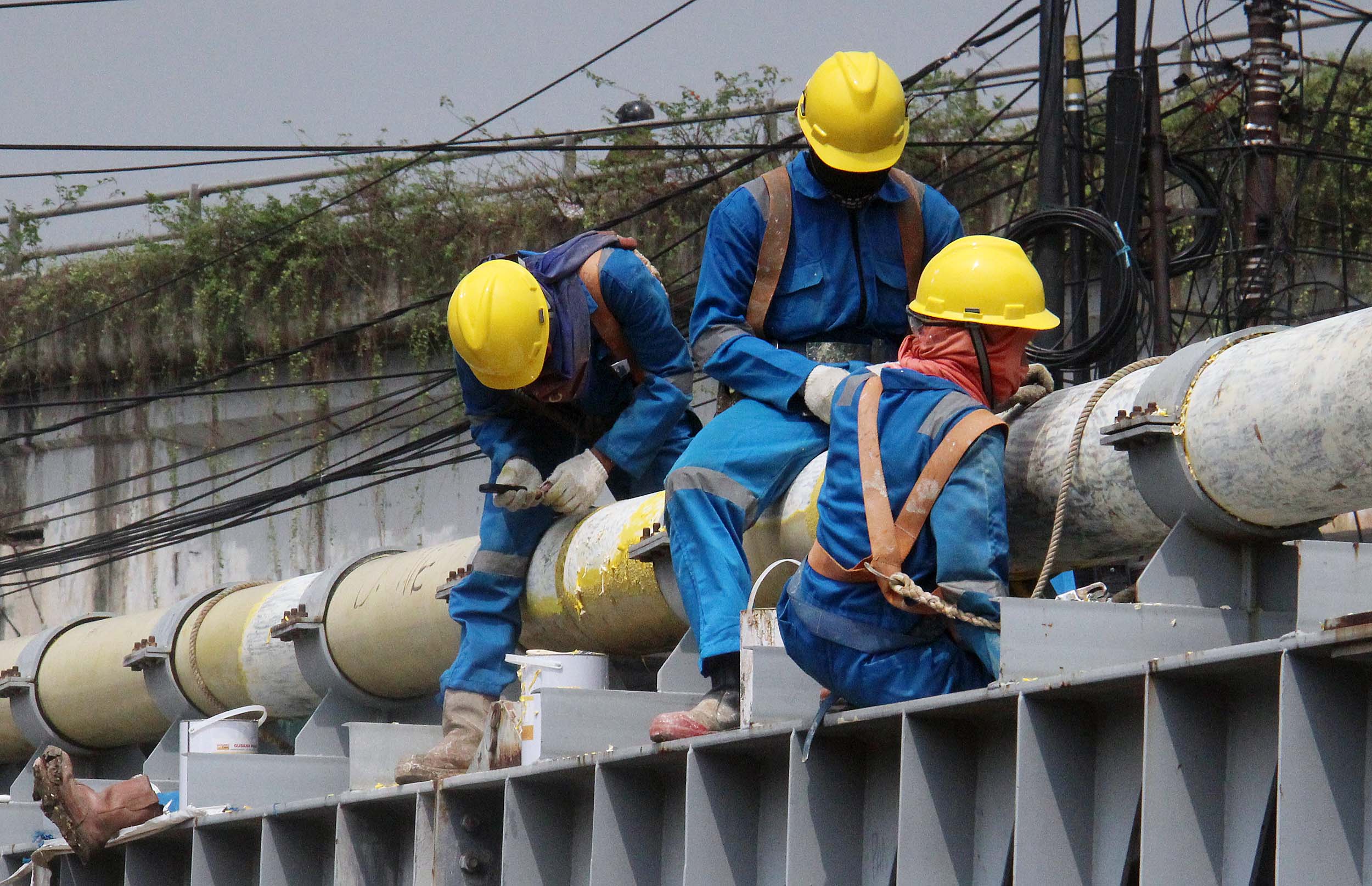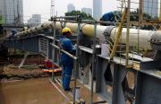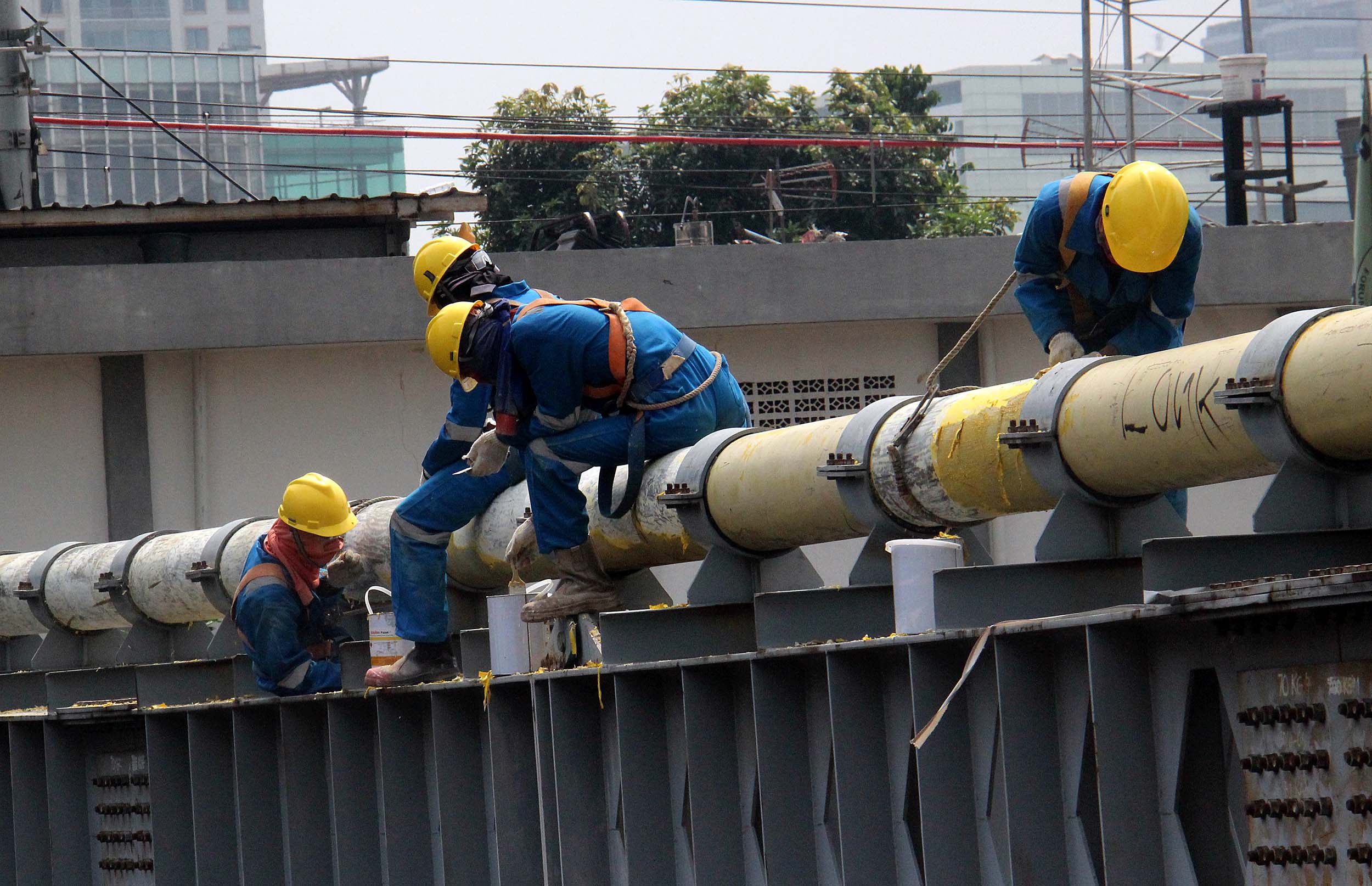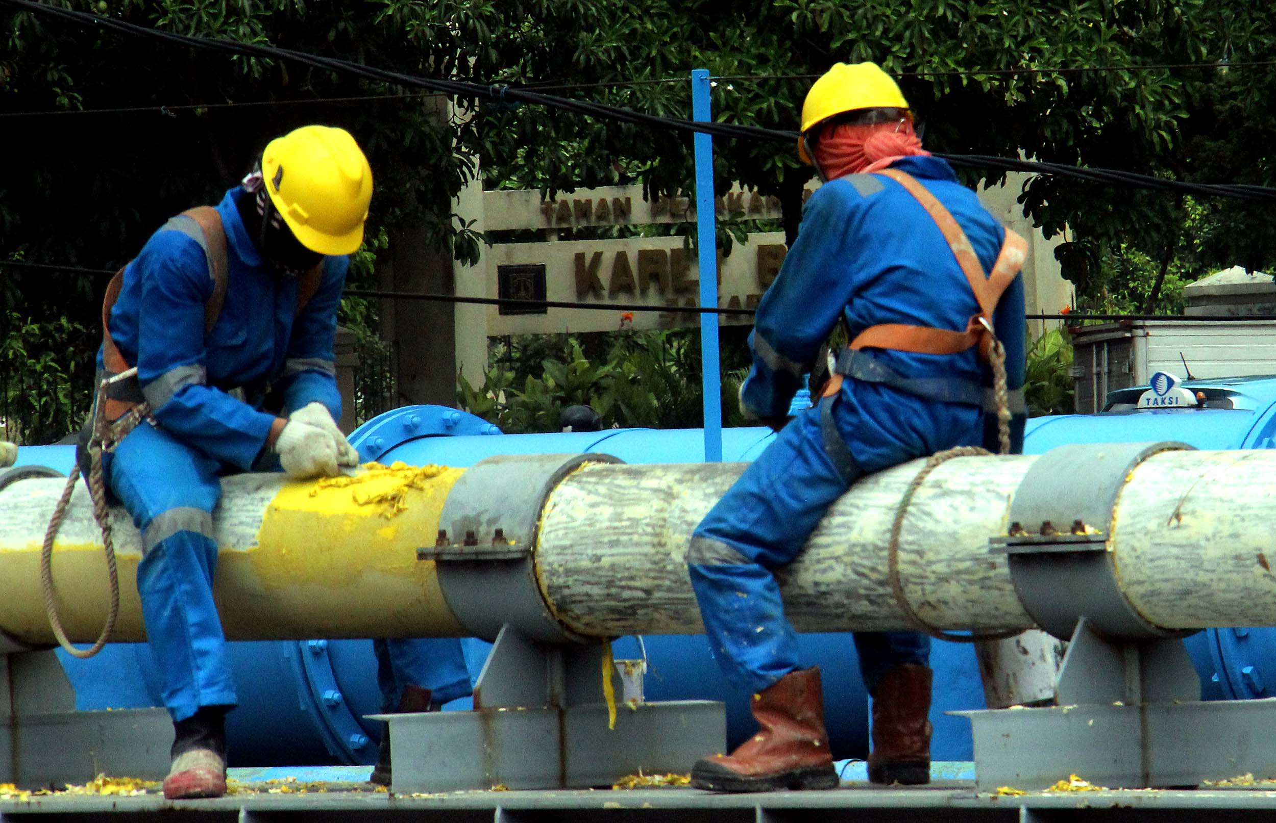 Para petugas Perusahaan Gas Negara (PGN) melakukan perawatan rutin dan pengecatan terhadap pipa gas yang melintasi Kanal Banjir Barat (KBB) di wilayah Karet Bivak, Jakarta, Kamis (11/8/2016). PGN menargetkan satu juta sambungan distribusi gas rumah tangga yang dimulai pada tahun ini.