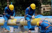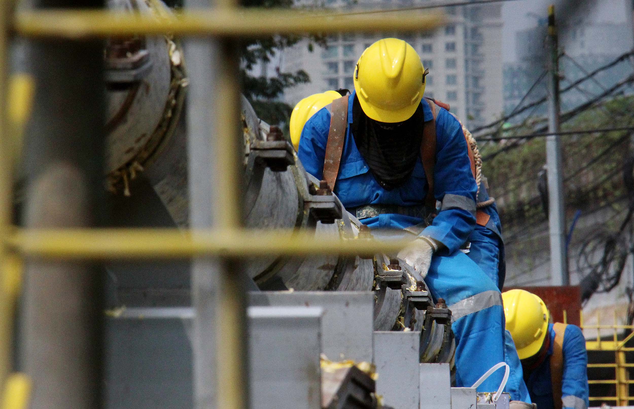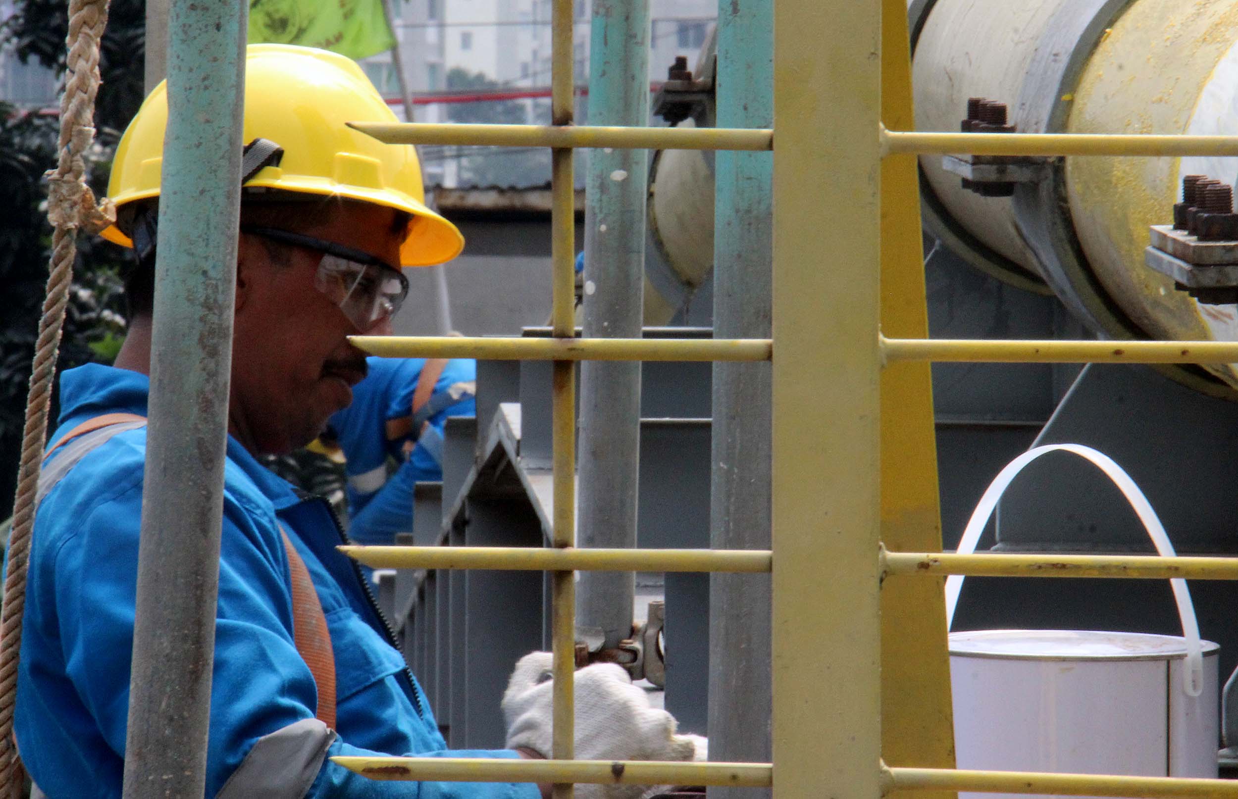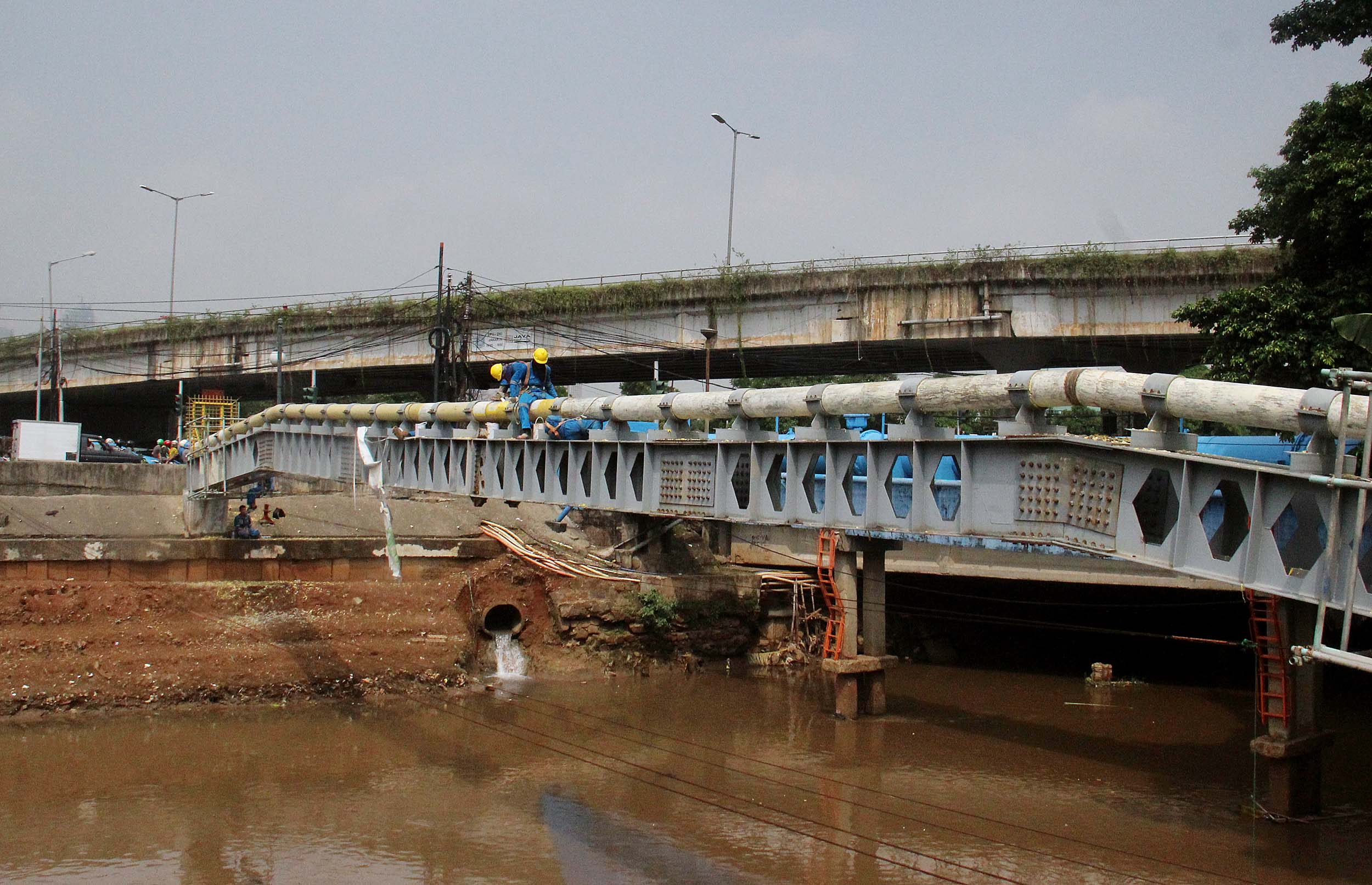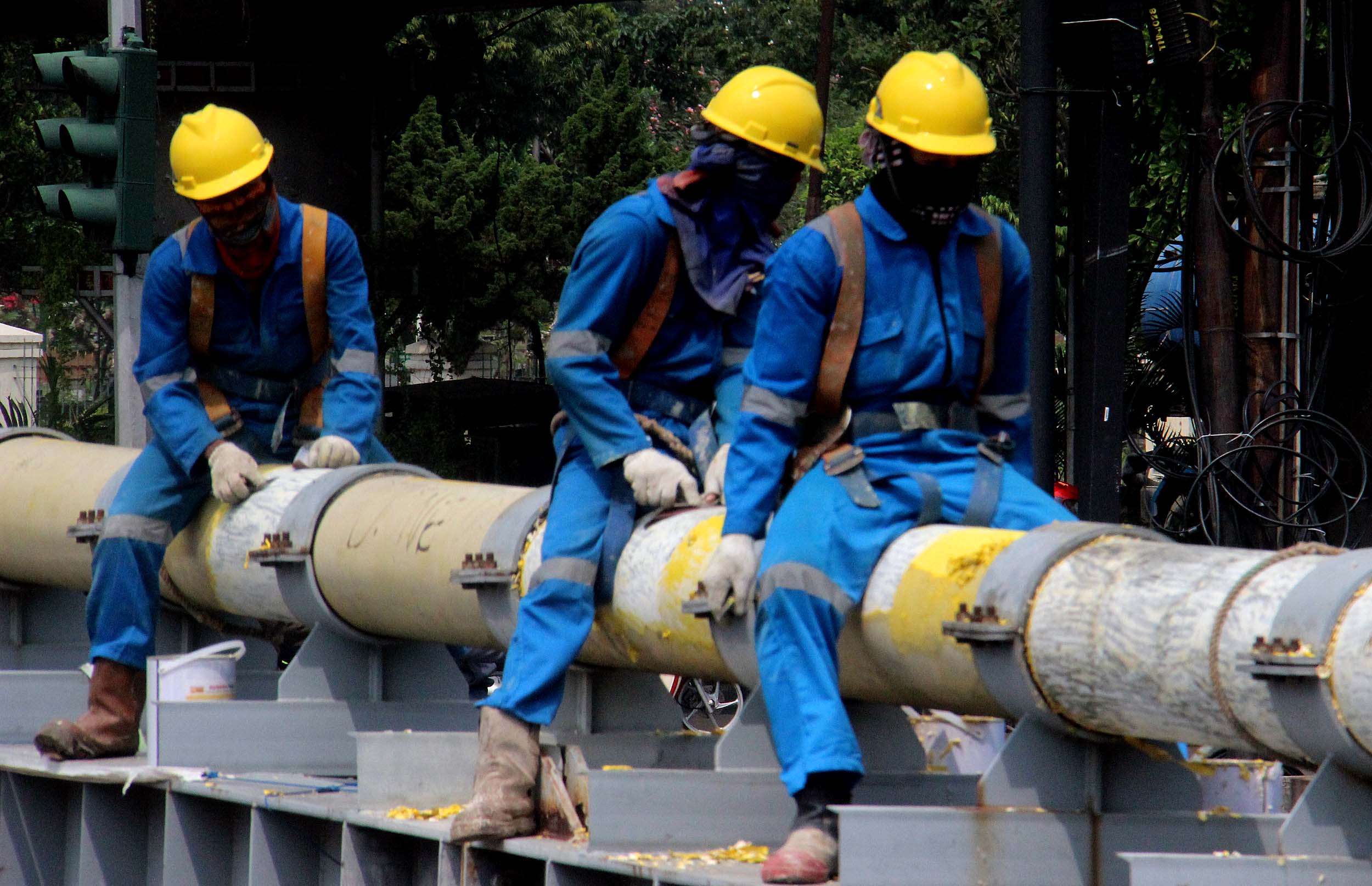 Para petugas Perusahaan Gas Negara (PGN) melakukan perawatan rutin dan pengecatan terhadap pipa gas yang melintasi Kanal Banjir Barat (KBB) di wilayah Karet Bivak, Jakarta, Kamis (11/8/2016). PGN menargetkan satu juta sambungan distribusi gas rumah tangga yang dimulai pada tahun ini.