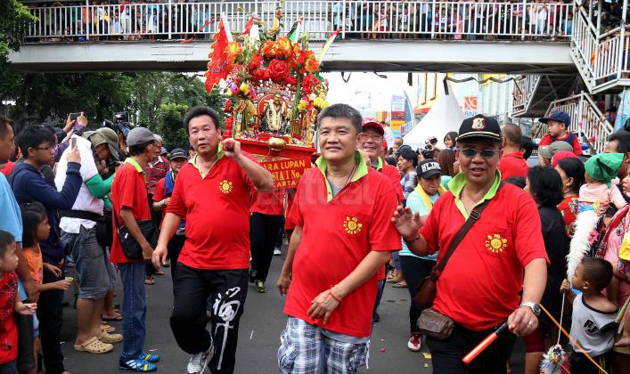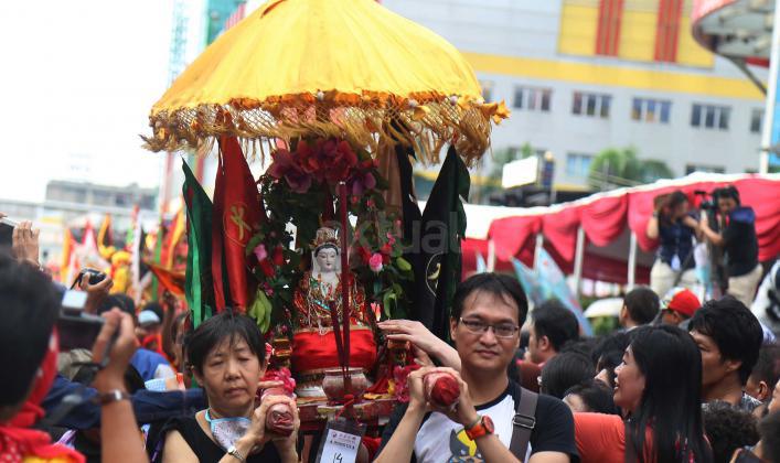 Peserta membawa patung dewa pada karnaval perayaan Cap Go Meh, di Jakarta, Minggu (21/2/2016). Perayaan Cap Go Meh yang merupakan rangkaian terakhir masa perayaan Imlek itu diikuti 1477 peserta dengan menampilkan berbagai kesenian.