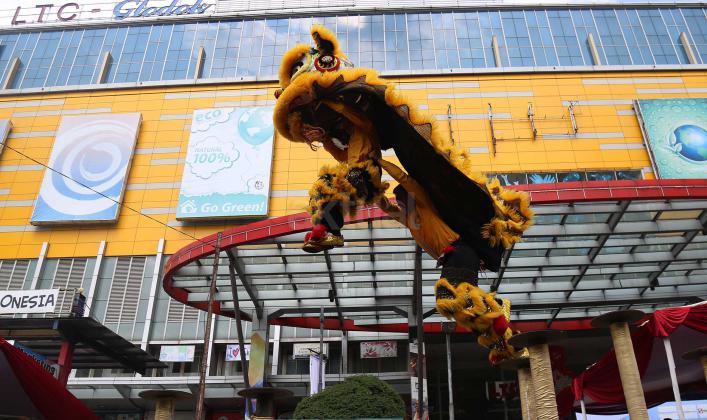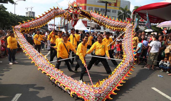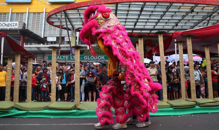 Peserta melakukan atraksi barongsai dan liong pada karnaval perayaan Cap Go Meh, di Jakarta, Minggu (21/2/2016). Perayaan Cap Go Meh yang merupakan rangkaian terakhir masa perayaan Imlek itu diikuti 1477 peserta dengan menampilkan berbagai kesenian.