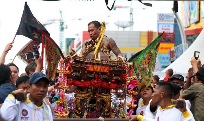 Tatung menuliskan aksara Tiongkoka saat karnaval Cap Go Meh di Jalan Gajah Mada, Jakarta, Minggu (21/2/2016). Dalam acara Cap Go Meh ini juga menampilkan 70 Joli yang dikendarai oleh dewa-dewa dari masing-masing klenteng di Glodok, Jabotabek dan beberapa wilayah dari pesisir utara Jawa.