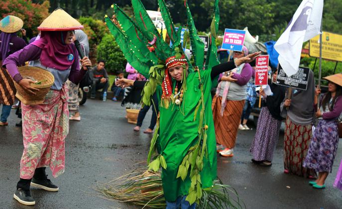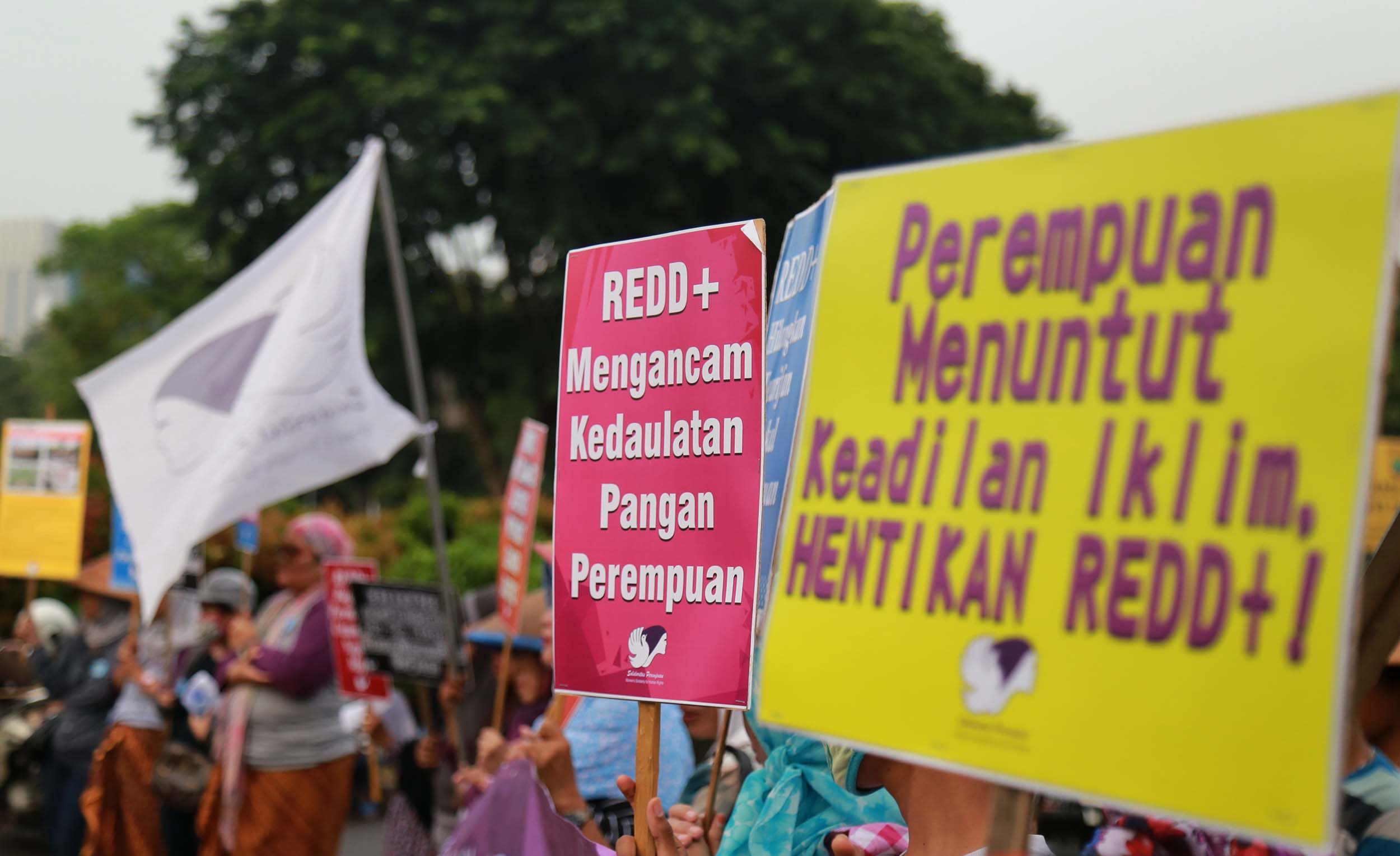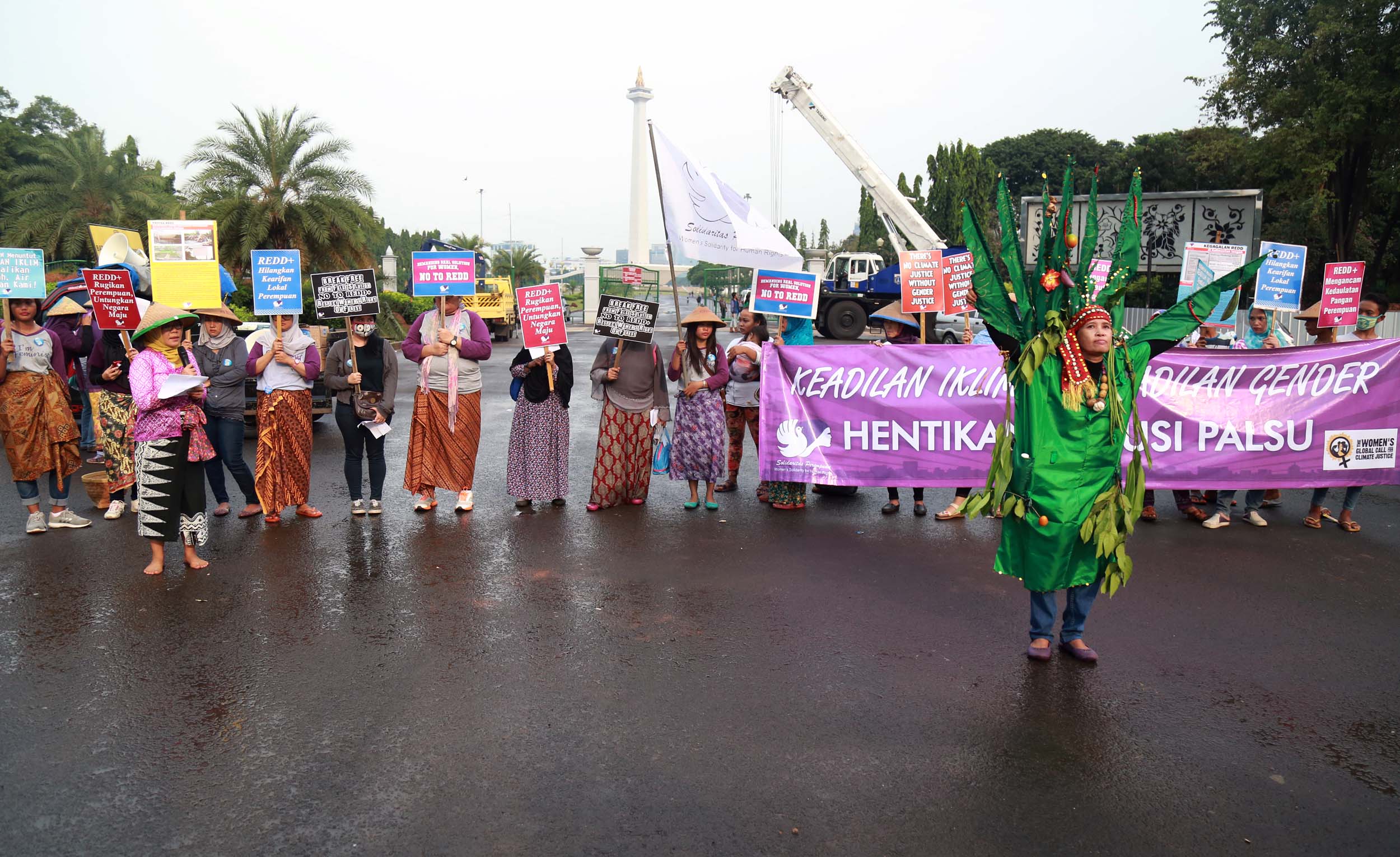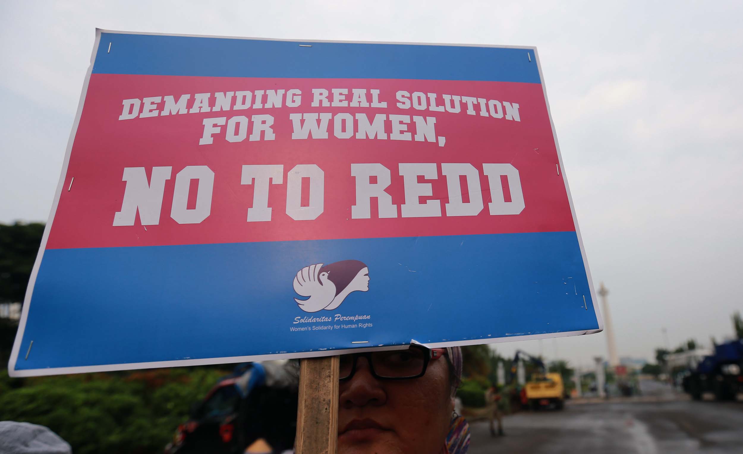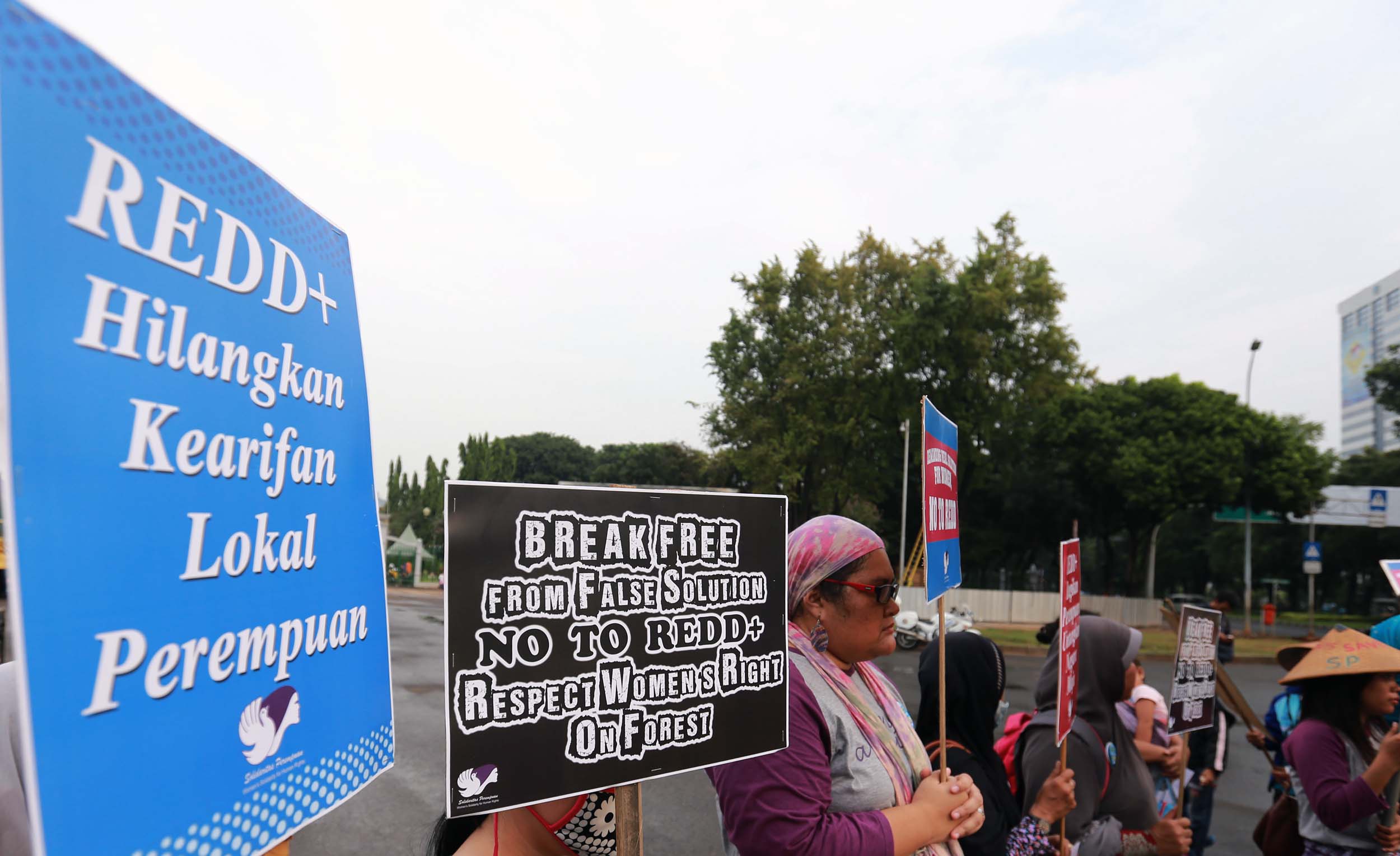 Puluhan perempuan yang tergabung dalam Solidaritas Perempuan (SP) melakukan aksi di depan Istana Negara, Jakarta, Selasa (17/5/2016). Dalam aksinya Solidaritas Perempuan (SP) mendesak Pemerintahan Jokowi/JK untuk menghentikan REDD + yang selama ini palsu bagi perubahan iklim.