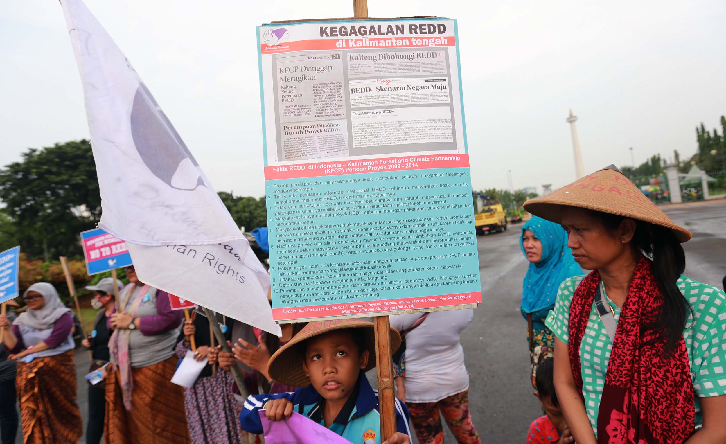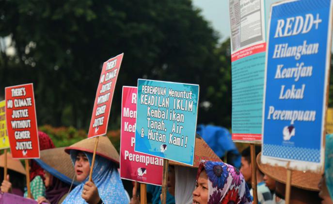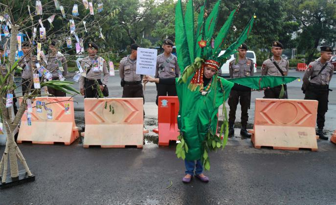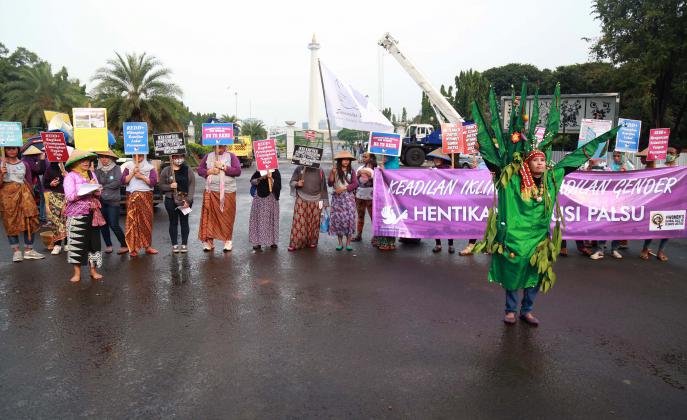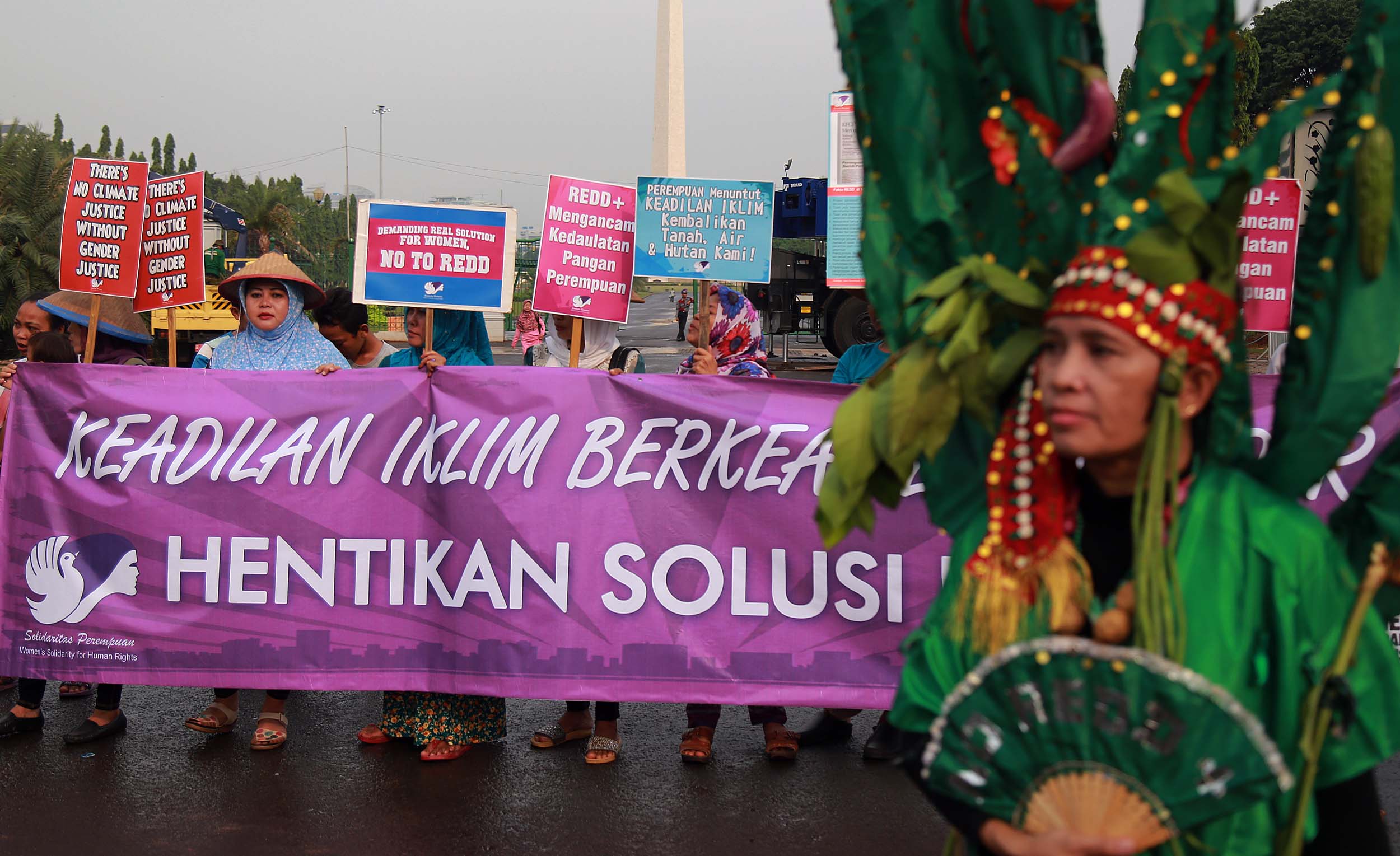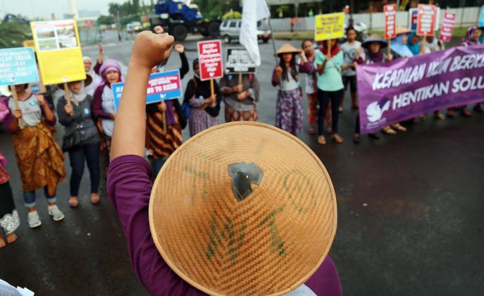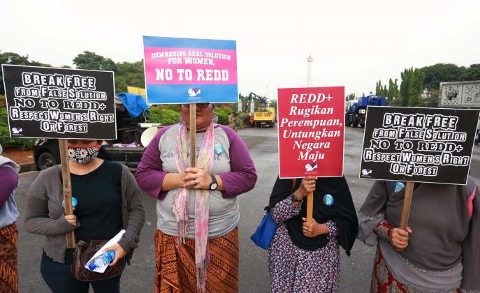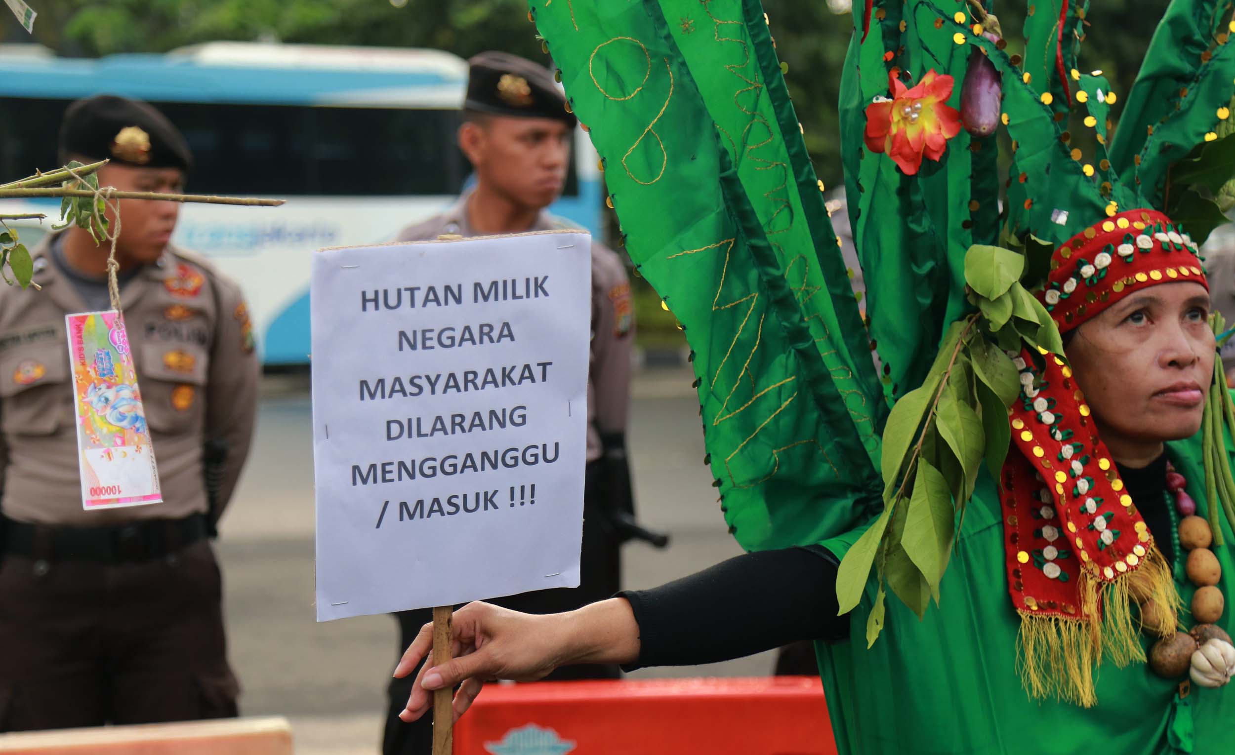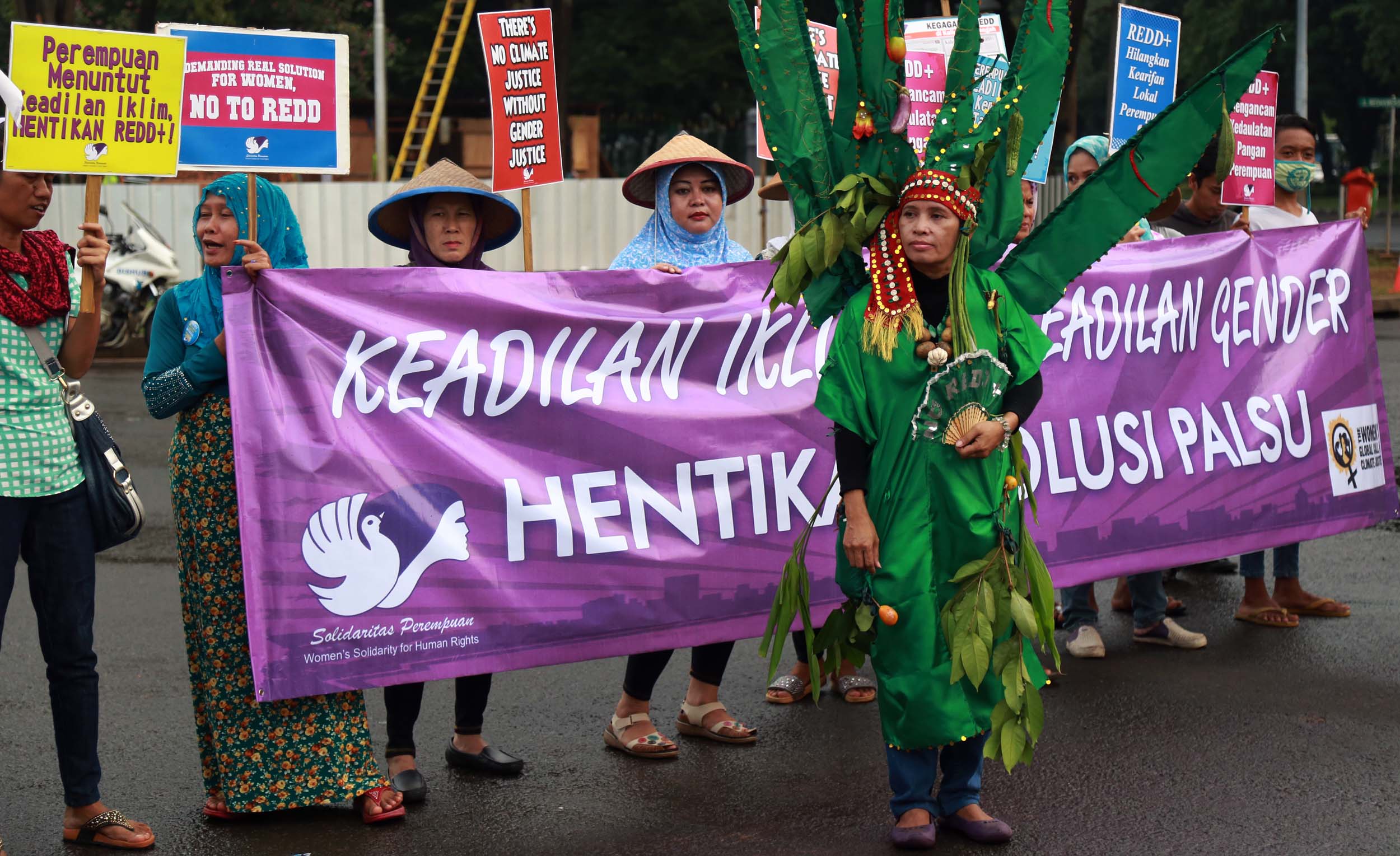 Puluhan perempuan yang tergabung dalam Solidaritas Perempuan (SP) melakukan aksi di depan Istana Negara, Jakarta, Selasa (17/5/2016). Dalam aksinya Solidaritas Perempuan (SP) mendesak Pemerintahan Jokowi/JK untuk menghentikan REDD + yang selama ini palsu bagi perubahan iklim.