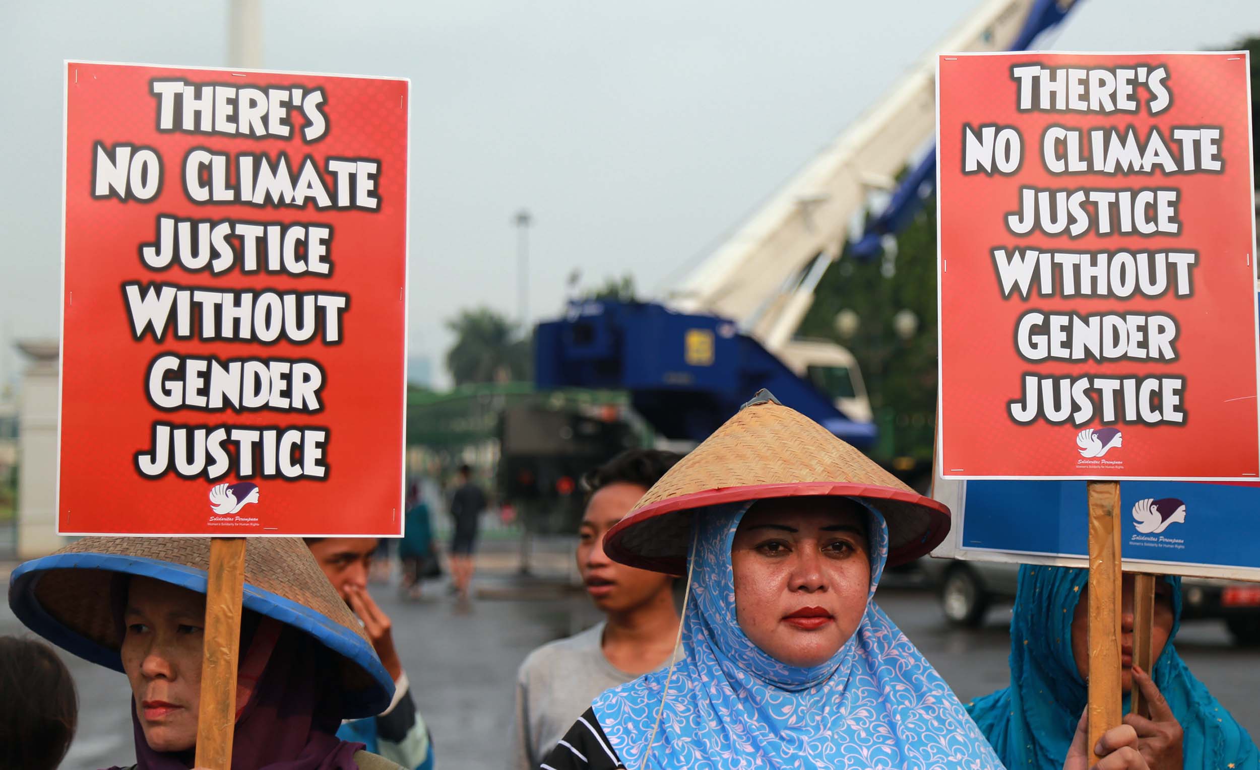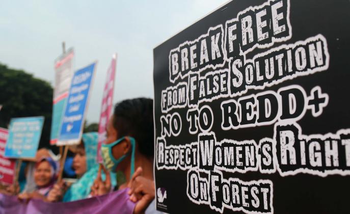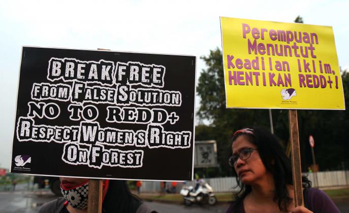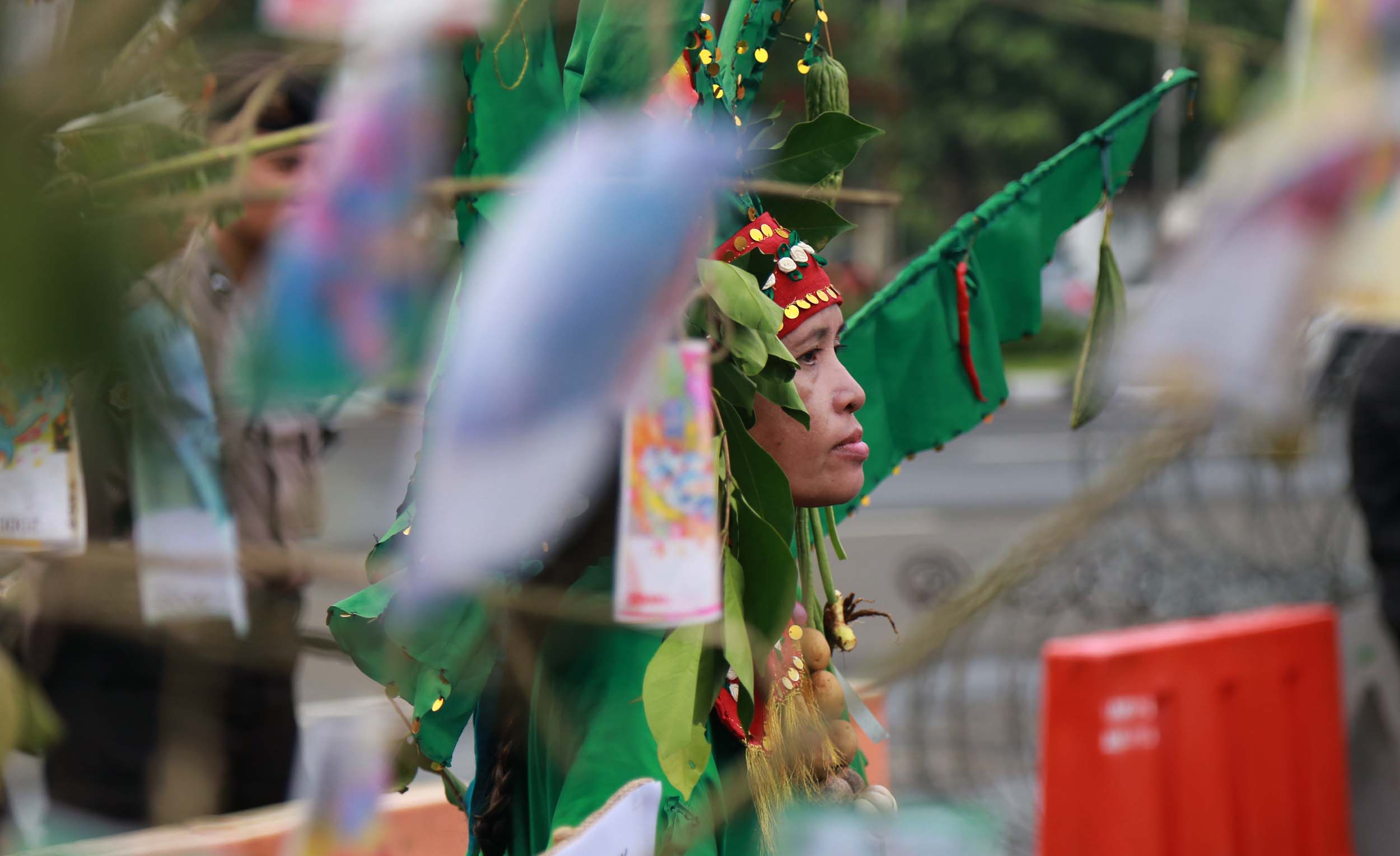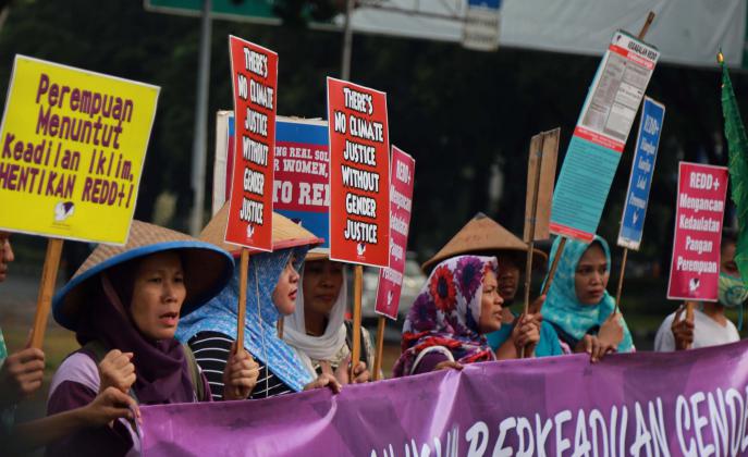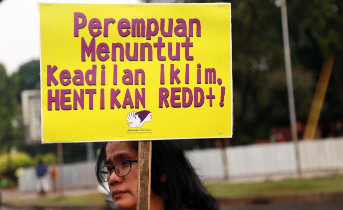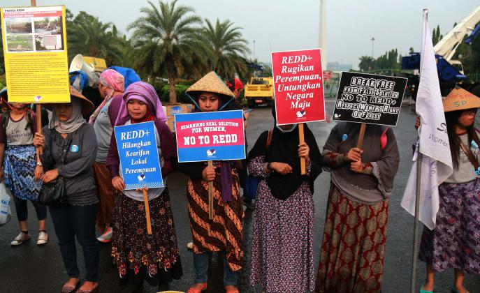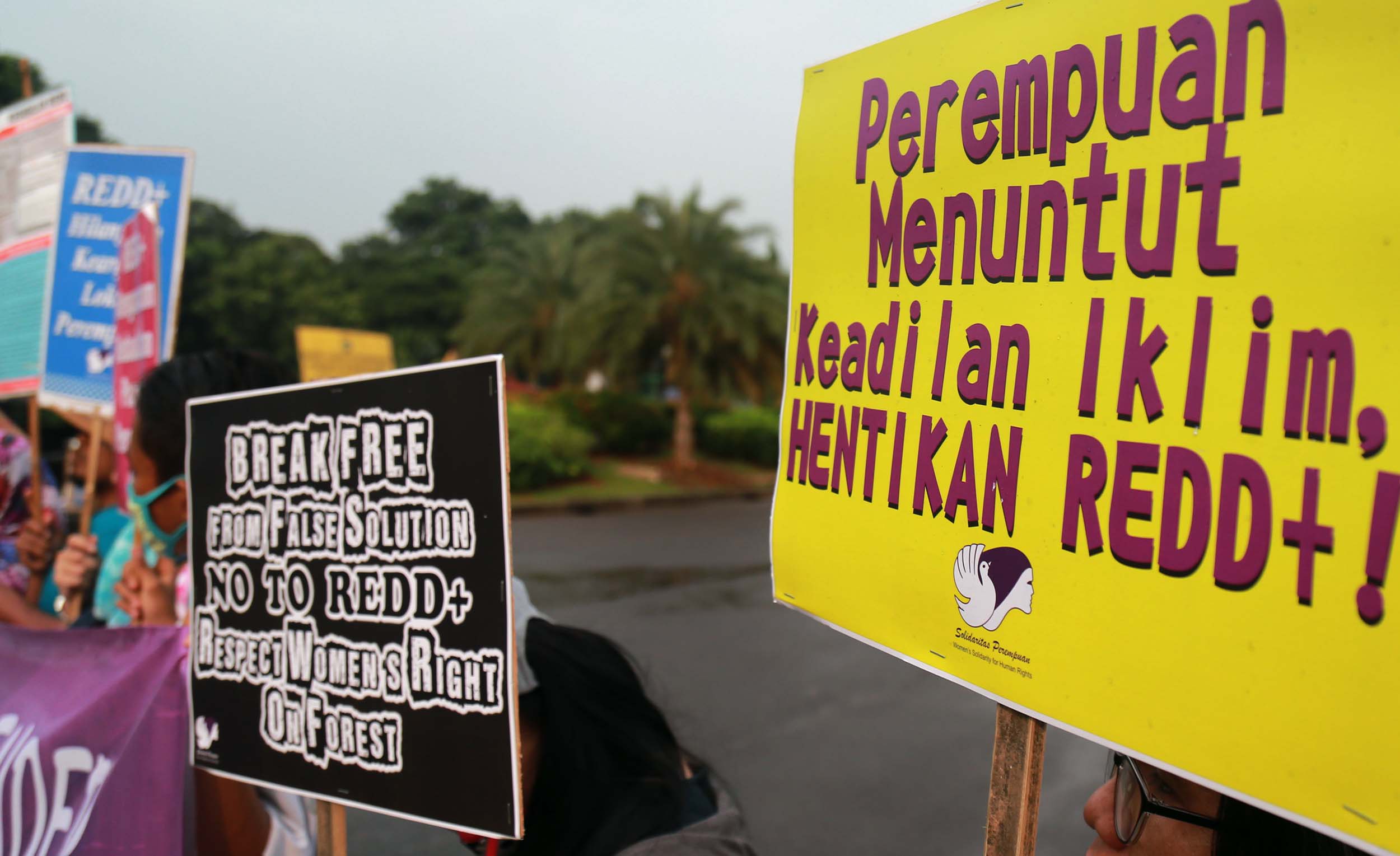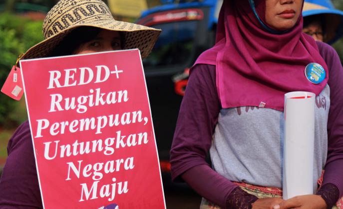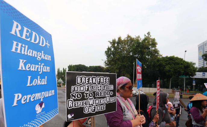 Puluhan perempuan yang tergabung dalam Solidaritas Perempuan (SP) melakukan aksi di depan Istana Negara, Jakarta, Selasa (17/5/2016). Dalam aksinya Solidaritas Perempuan (SP) mendesak Pemerintahan Jokowi/JK untuk menghentikan REDD + yang selama ini palsu bagi perubahan iklim.