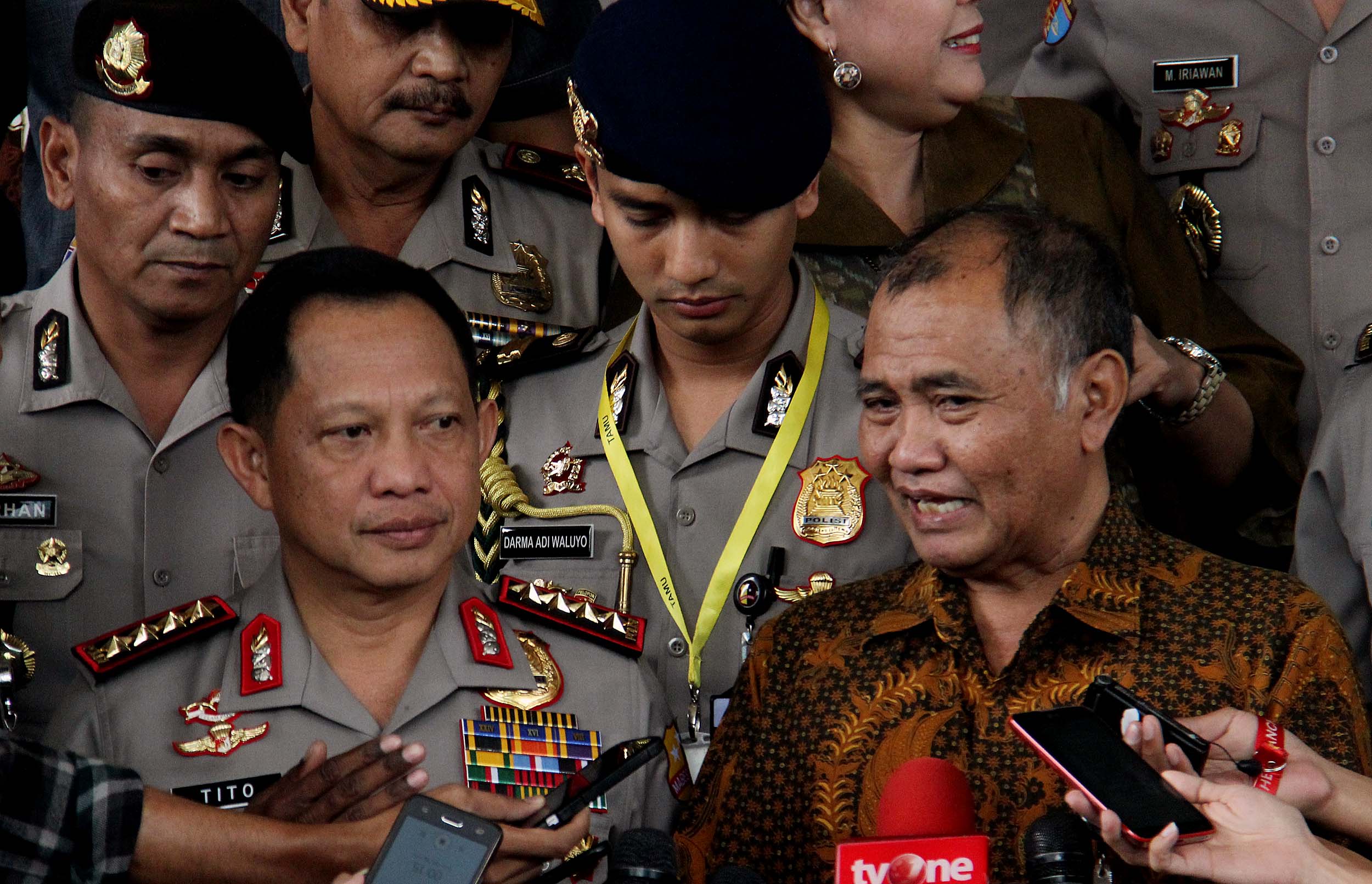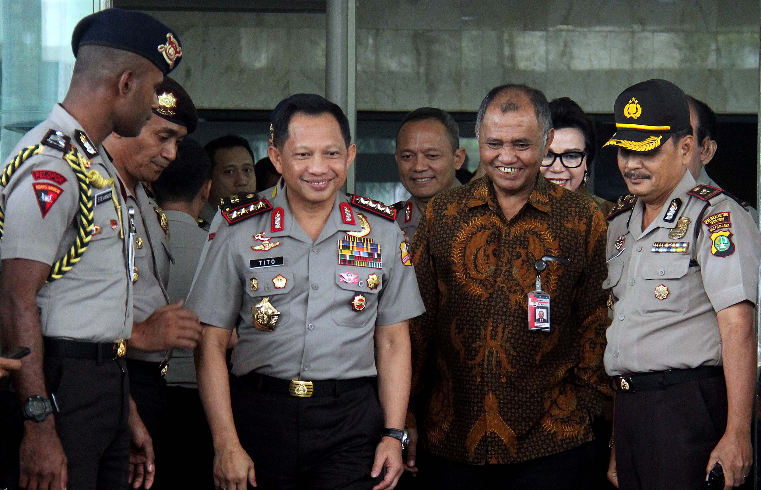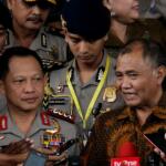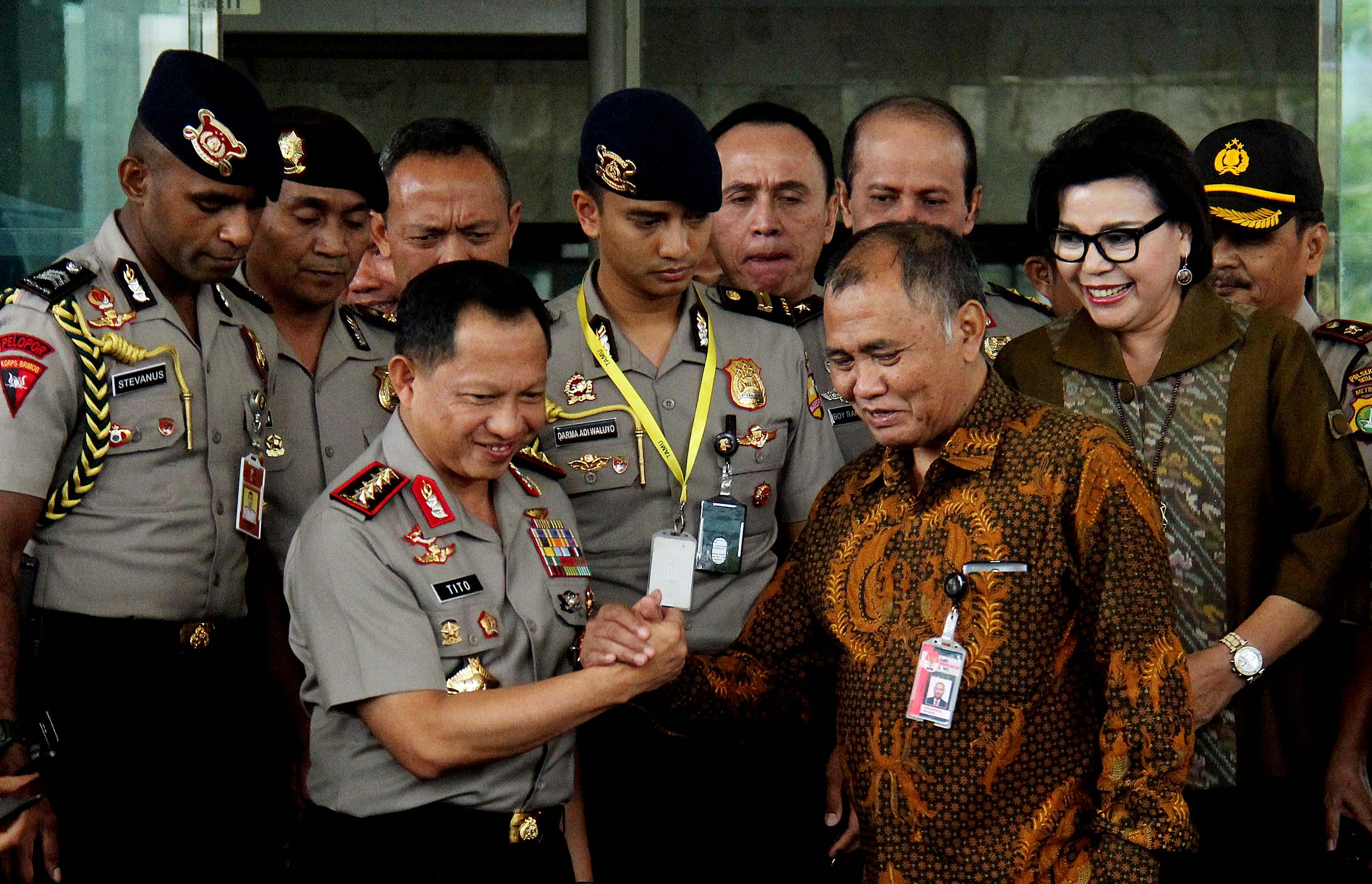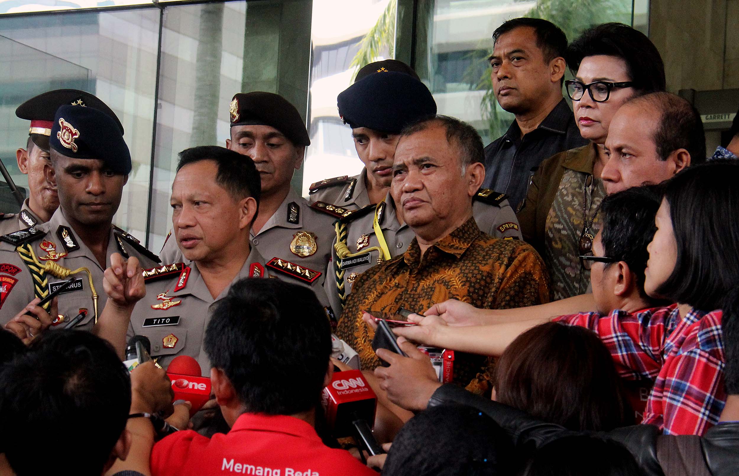 Kapolri Jenderal Tito Karnavian, bersama Ketua KPK Agus Rahardjo, memberikan keterangan usai menggelar pertemuan di Gedung KPK, Jakarta, Jumat (19/8/2016). Kunjungan pertama Tito semenjak dilantik menjadi Kapolri ini terkait koordinasi kedua lembaga terkait penegakan hukum.