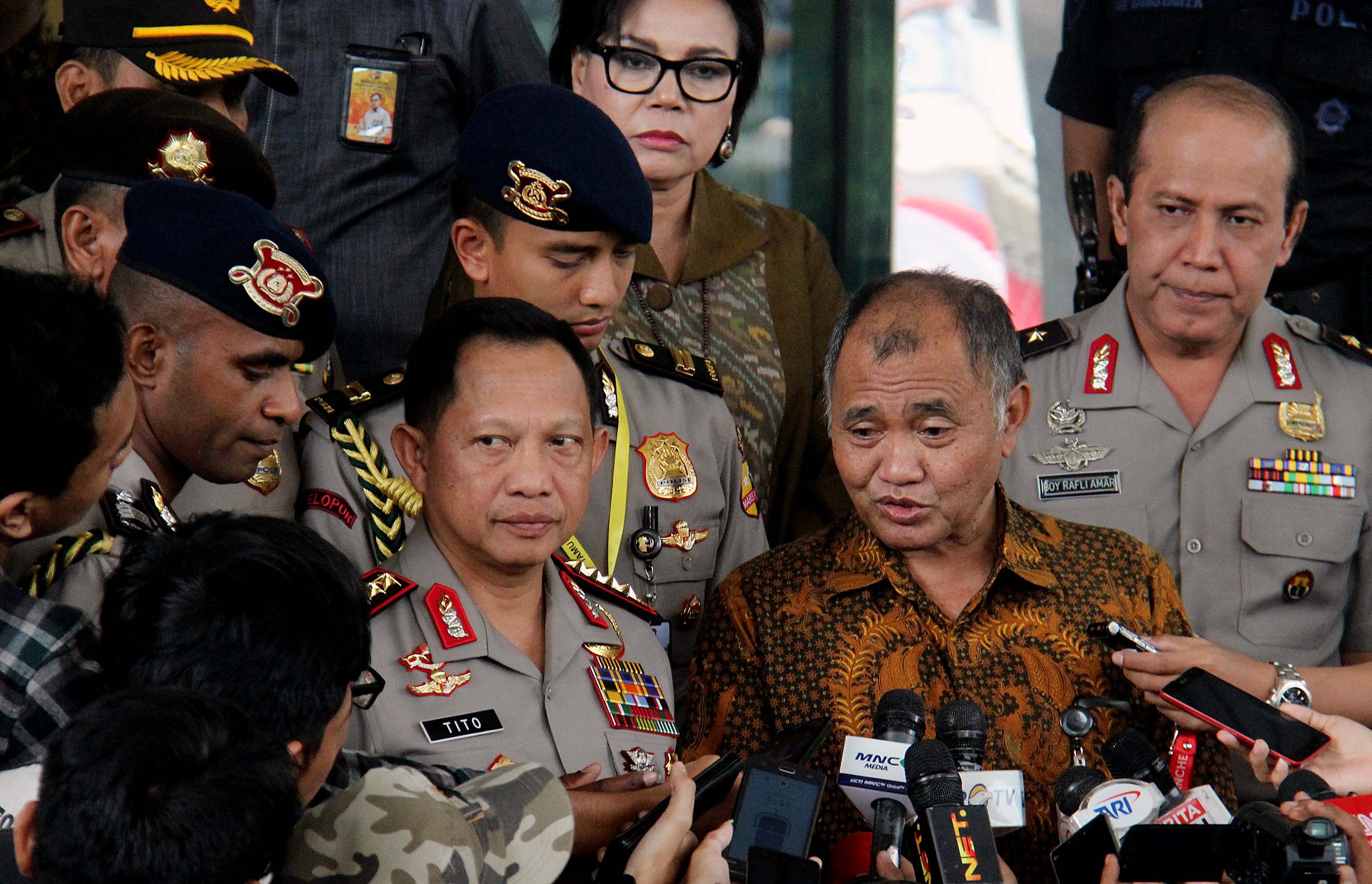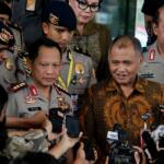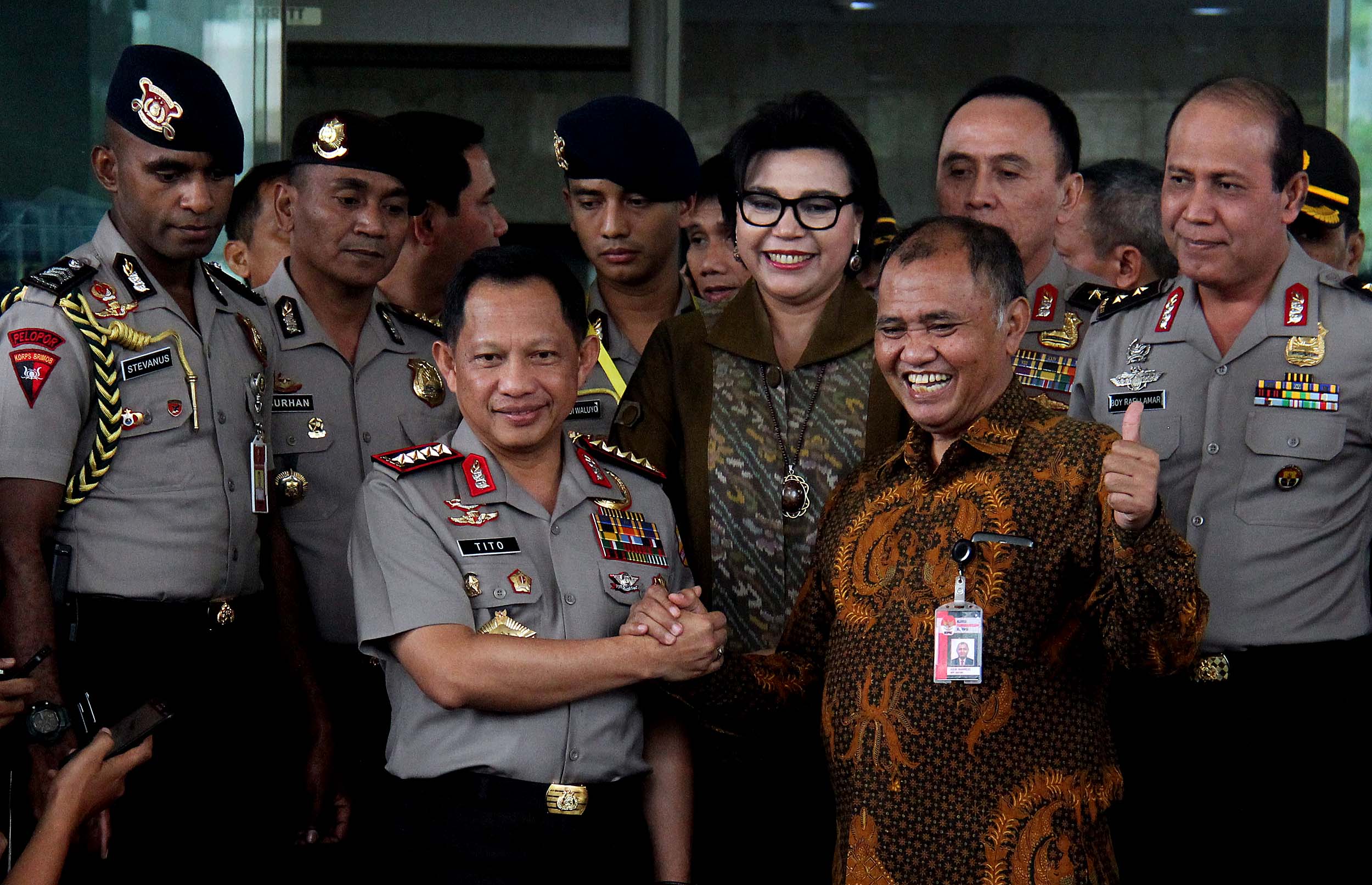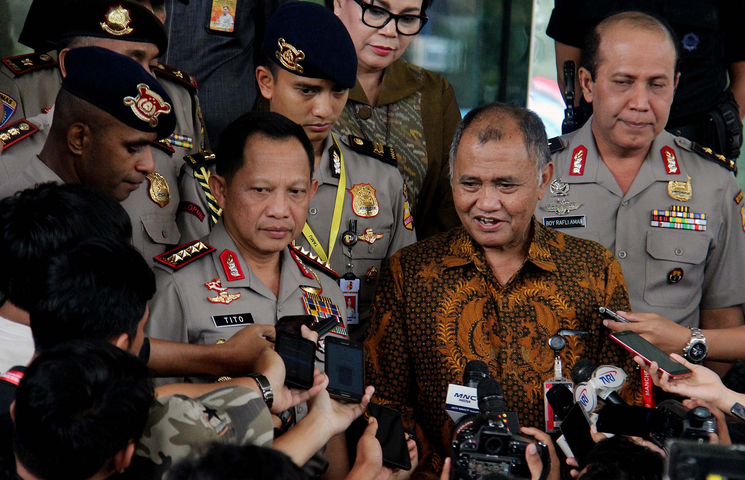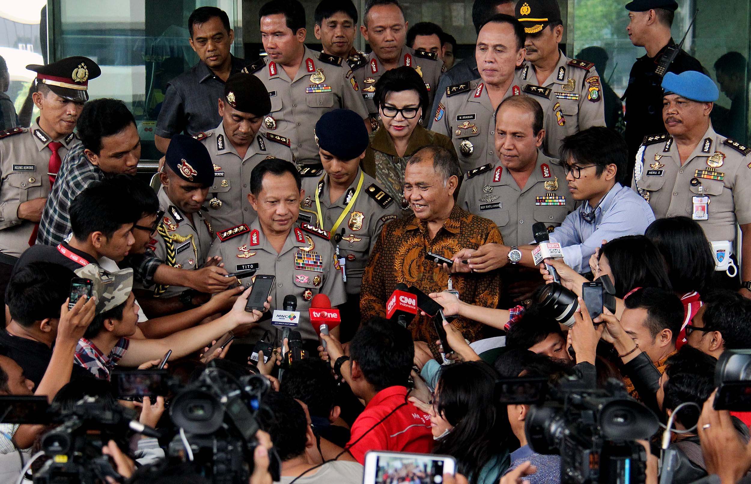 Kapolri Jenderal Tito Karnavian, bersama Ketua KPK Agus Rahardjo, memberikan keterangan usai menggelar pertemuan di Gedung KPK, Jakarta, Jumat (19/8/2016). Kunjungan pertama Tito semenjak dilantik menjadi Kapolri ini terkait koordinasi kedua lembaga terkait penegakan hukum.