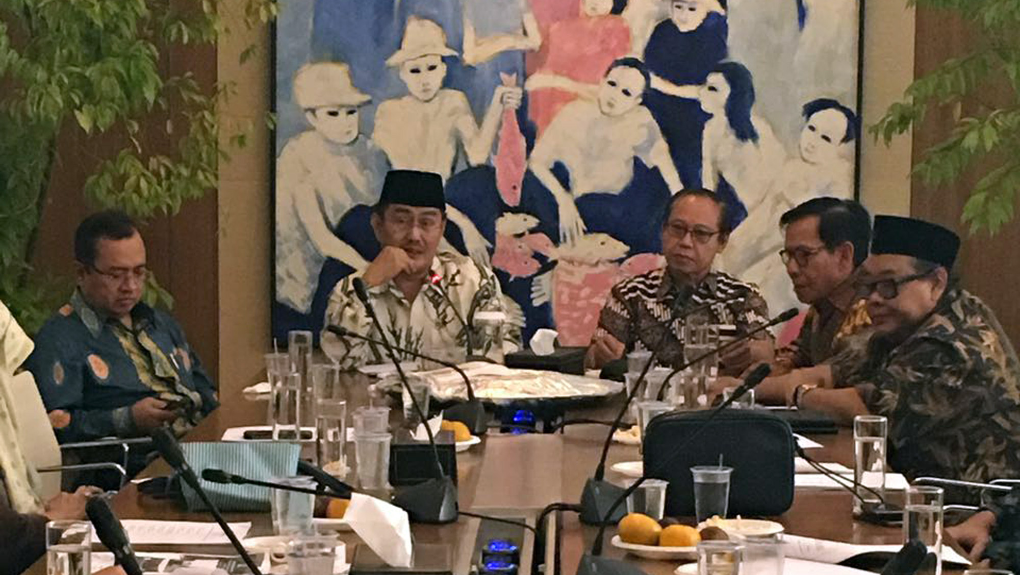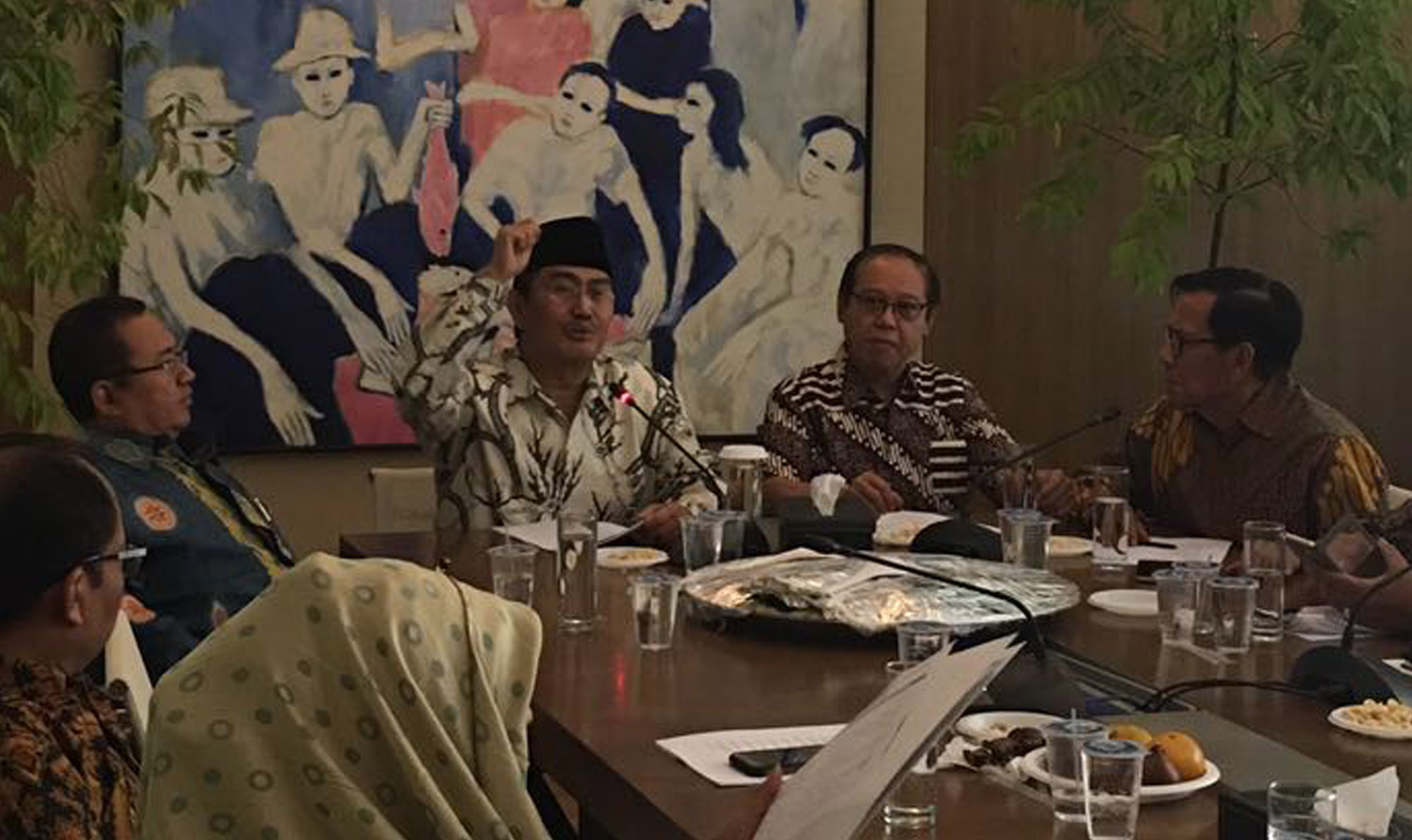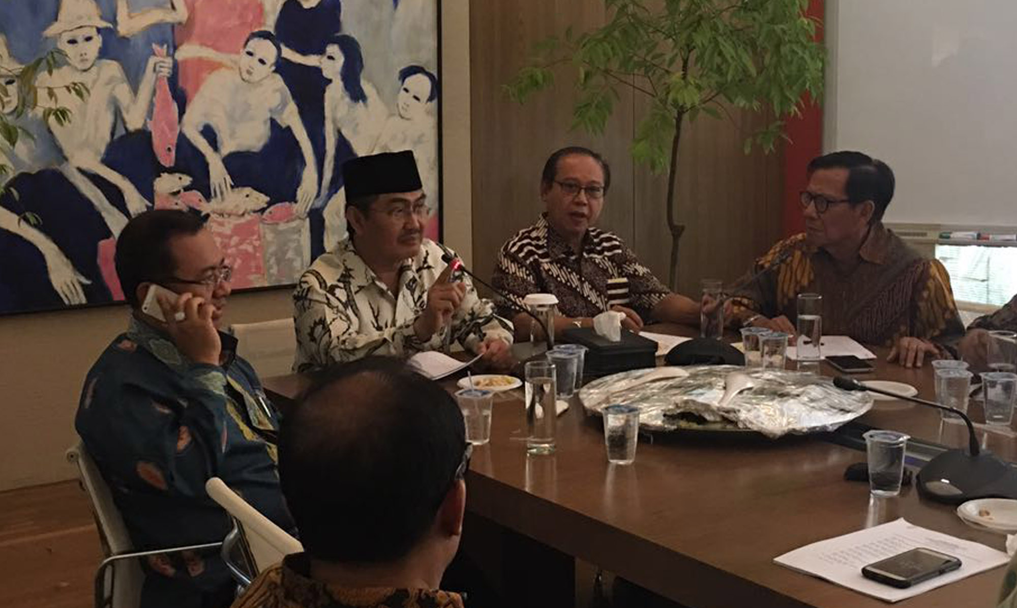 Wakil Ketua Dewan Penasehat Ikatan cendikiawan muslim Indonesia (ICMI) Djan Farid (ketiga dari kanan) bersalaman dengan ketua ICMI Jimly Asshiddiqie (kedua dari kiri) disaksikan Sekjen ICMI Djafar Hafsah (kanan) dan Presidium Ikatan Cendekiawan Muslim Indonesia Priyo Budi santoso (kiri) saat acara peresmian kantor pusat ICMI di Perkantoran Jl Proklamasi no 53, Jakarta, Jumat (2/9). ICMI akan mengembangkan program ekonomi bagi masyarakat menengah dan bekerjasama dengan berbagai lembaga untuk memaksimalkan kontribusi bagi bangsa dan negara.