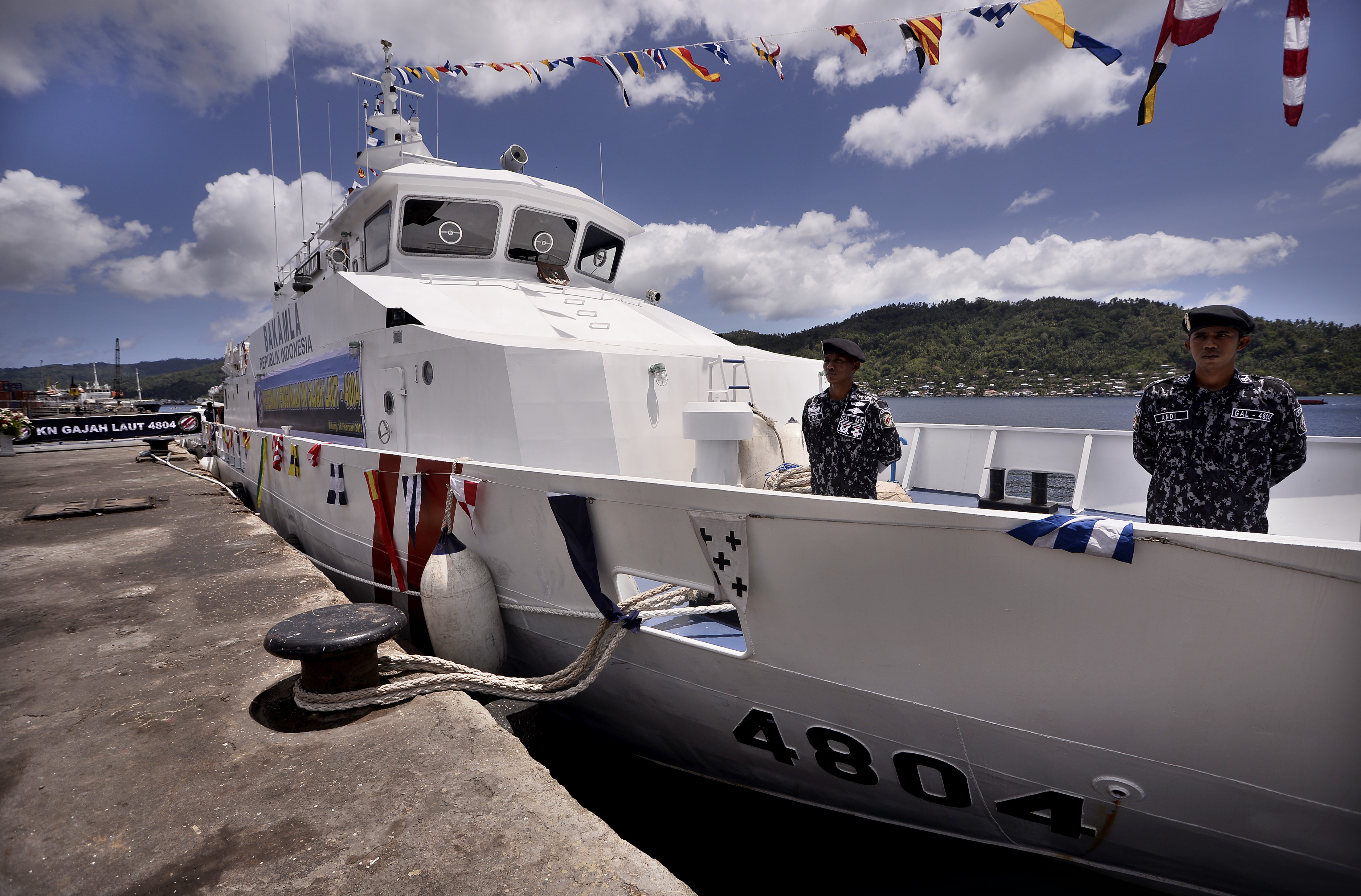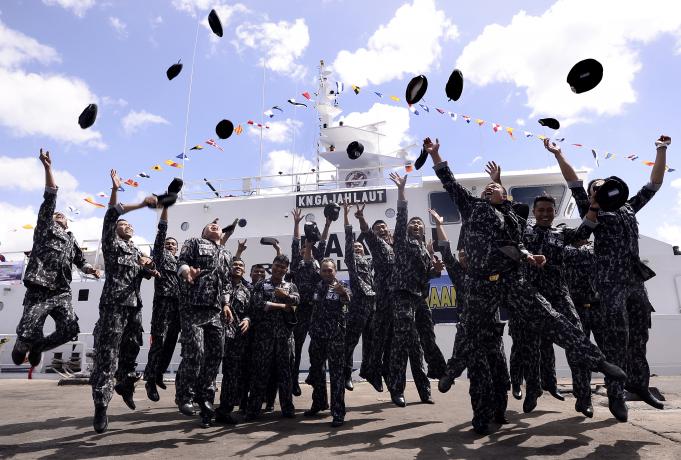 Anak Buah Kapal (ABK) melemparkan baret ke udara saat upacara peresmian kapal KN Gajah Laut-4804 di Dermaga Pelabuhan Samudera, Bitung, Sulawesi Utara, Kamis (18/2). KN Gajah Laut-4804 yang dibuat di Pangkal Pinang adalah kapal patroli perairan yang dioperasikan oleh Badan Keamanan Laut (BAKAMLA) Zona Maritim Tengah dengan cakupan wilayah perairan Nusa Tenggara hingga ke perairan bagian utara Sulawesi yang berbatasan dengan Filipina. ANTARA FOTO/Adwit B Pramono/kye/16.