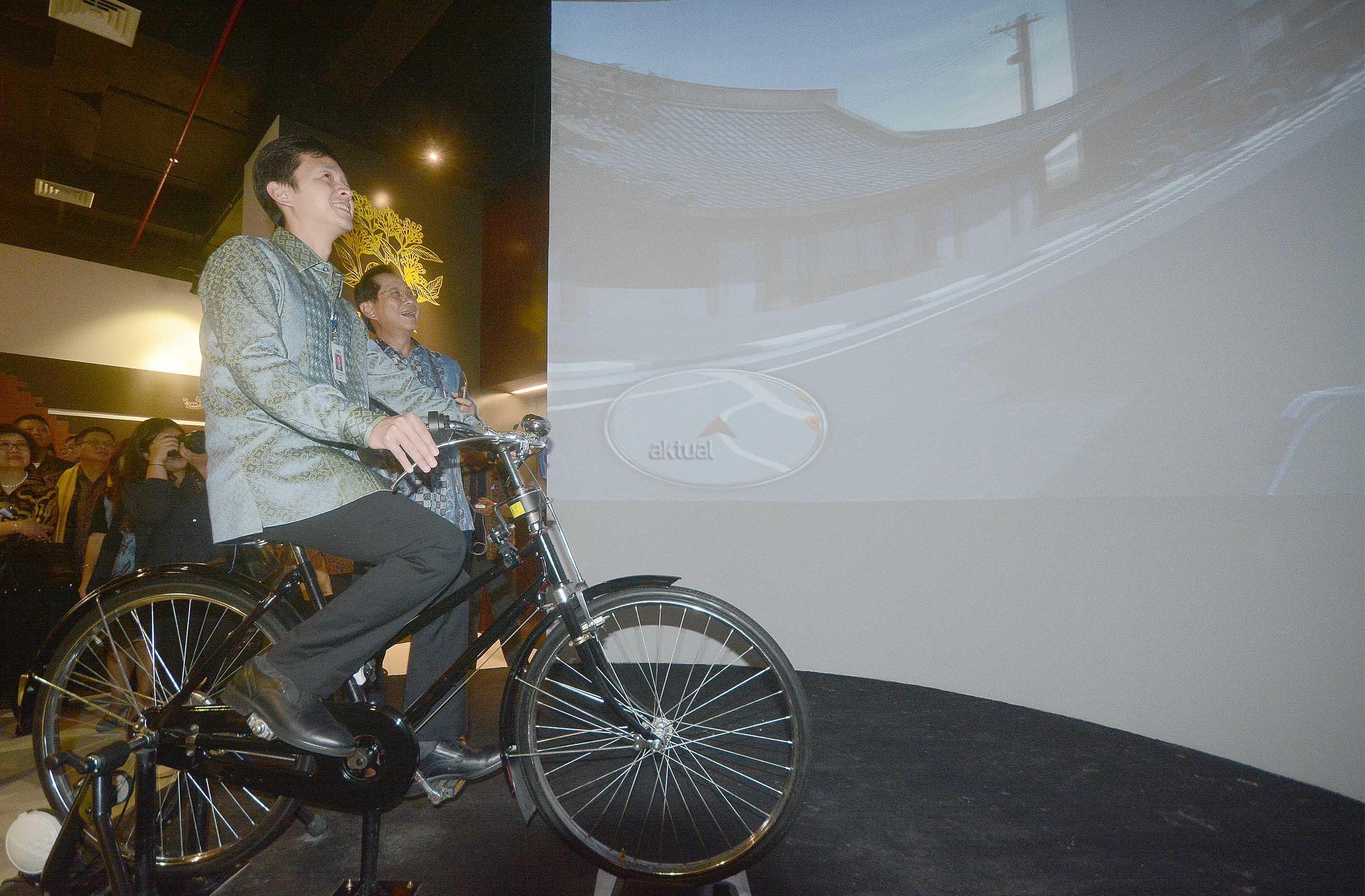 Wakil Presiden Direktur BCA, Armand W Hartono (kiri) disaksikan Presiden Direktur BCA, Jahja Setiaatmadja (kedua kiri), mengayuh sepeda pada peresmian BCA Learning Institute dan Galeri BCA di Sentul, Bogor, Jawa Barat, Senin (23/1). BCA Learning Institute dan Galeri BCA ini diharapkan dapat memfasilitas upaya BCA untuk menjadi yang terdepan dalam hal Research and Development (R&D) dan menumbuhkan motivasi calon karyawan akan besarnya tanggung jawab yang akan diemban kelak membangun BCA yang lebih baik dari para pendahulunya. AKTUAL/Eko S Hilman