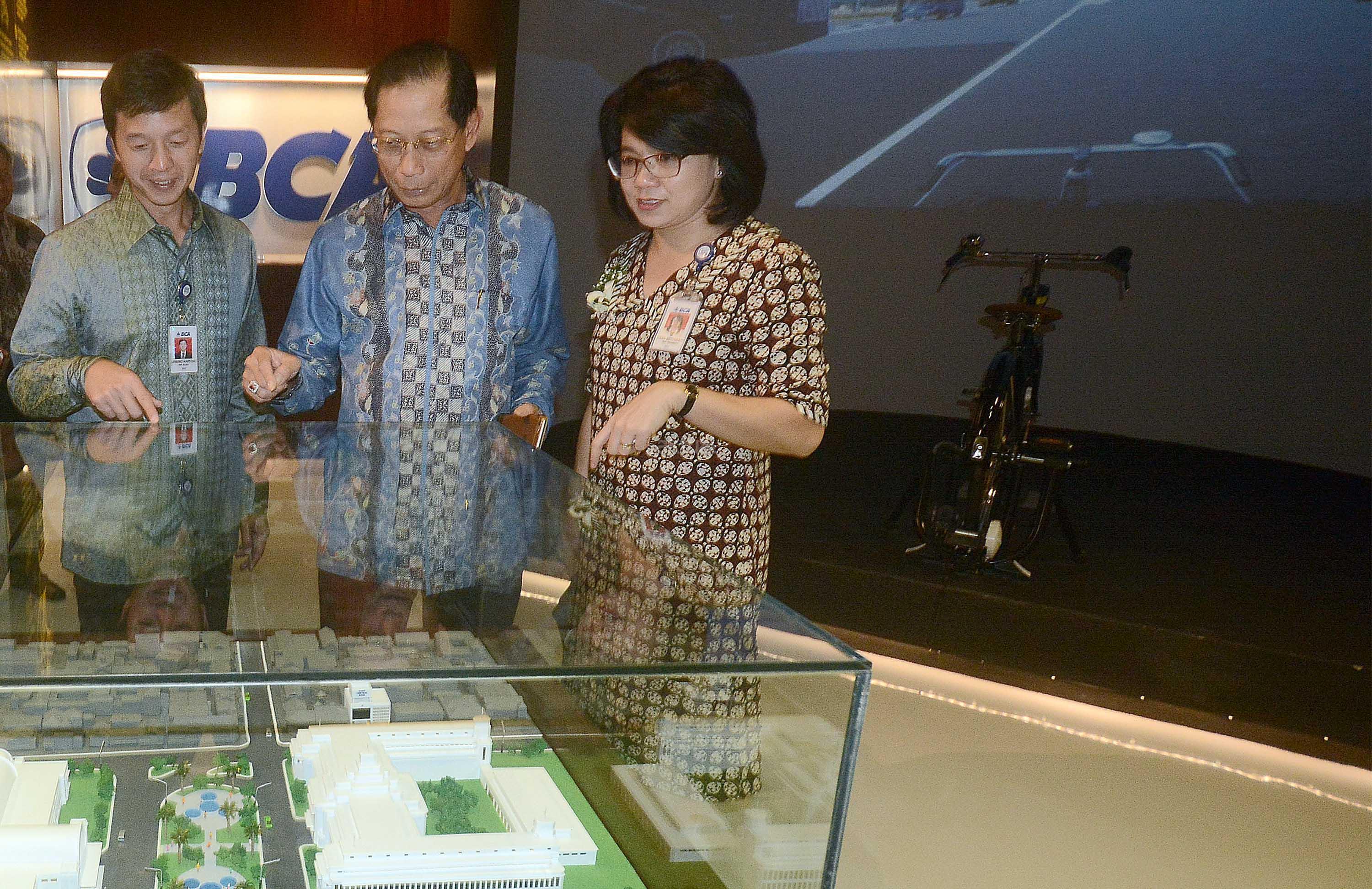 Presiden Direktur PT Bank Central Asia Tbk, Jahja Setiaatmadja (tengah) bersama Wakil Presiden Direktur BCA, Armand W Hartono (kiri) dan Kepala Divisi Pembelajaran & Pengembangan BCA ,Lena Setiawati mengamati maket saat peninjauan BCA Learning Institute dan Galeri BCA saat peresmiaannya di Sentul, Bogor, Jawa Barat, Senin (23/1). BCA Learning Institute dan Galeri BCA ini diharapkan dapat memfasilitas upaya BCA untuk menjadi yang terdepan dalam hal Research and Development (R&D) dan menumbuhkan motivasi calon karyawan akan besarnya tanggung jawab yang akan diemban kelak membangun BCA yang lebih baik dari para pendahulunya. AKTUAL/Eko S Hilman