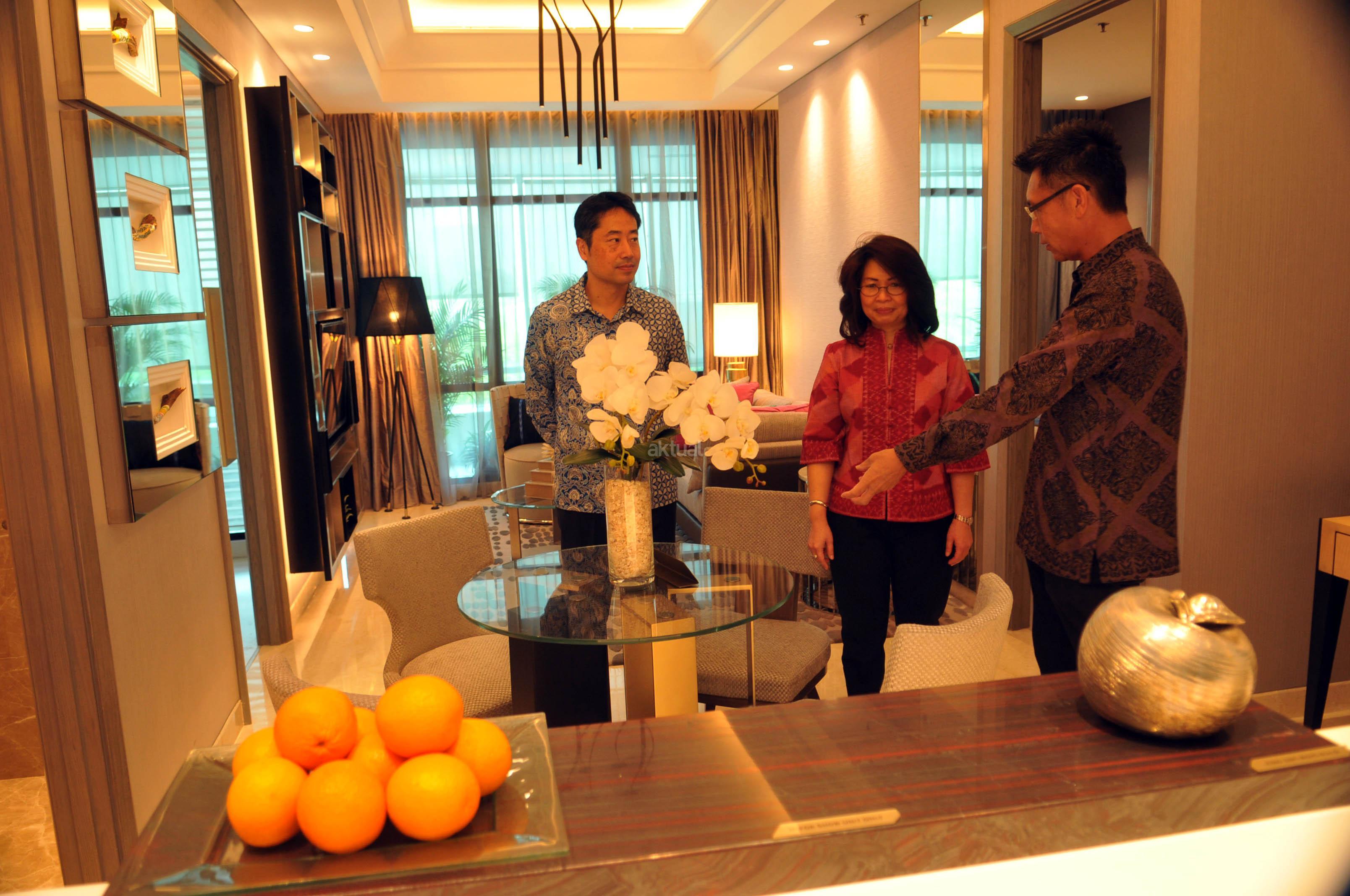 Wakil President Director Itochu Indonesia Osamu Funaki (kanan) bersama Division Head Commercial Sinar Mas Land Agusmeisin (tengah) dan Country Head of Investment Division Shimizu Corporation Satoshi Arai melihat show unit apartemen Aerium usai meresmikan marketing gallery Aerium Apartemen Permata Buana di Jakarta, Sabtu (20/5/2017). AKTUAL/Eko S Hilman