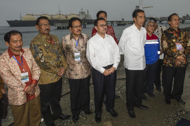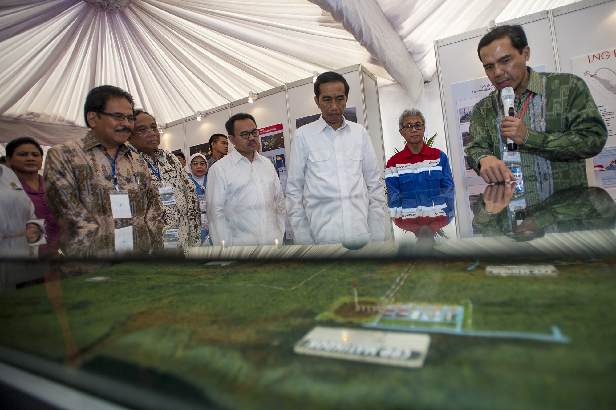 Presiden Joko Widodo (ketiga kanan) didampingi Ibu Negara Iriana Joko Widodo (kiri), Menko Perekonomian Sofyan Djalil (kedua kiri), Menko Maritim Indroyono Soesilo (ketiga kiri), Menteri ESDM Sudirman Said (tengah), Direktur Utama Pertamina Dwi Soetjipto (kedua kanan), menyimak penjelasan Presiden Direktur Donggi-Senoro LNG Gusrizal (kanan) saat peresmian Mega Proyek Pertamina Terintegrasi di Kilang Donggi-Senoro LNG, Banggai, Sulawesi Tengah, Minggu (2/8). Mega proyek yang merupakan proyek hulu hingga hilir minyak dan gas bumi yang diresmikan Presiden Joko Widodo tersebut yaitu fasilitas produksi lapangan gas Senoro SKK Migas JOB Pertamina Medco E&P Tomori Sulawesi, pengapalan perdana kargo PT Donggi-Senoro LNG, pengoperasian lapangan gas GG Pertamina Hulu Energi ONWJ, groundbreaking pabrik Amonia PT Panca Amara Utama. ANTARA FOTO/Ismar Patrizki/kye/ed/NZ/15.