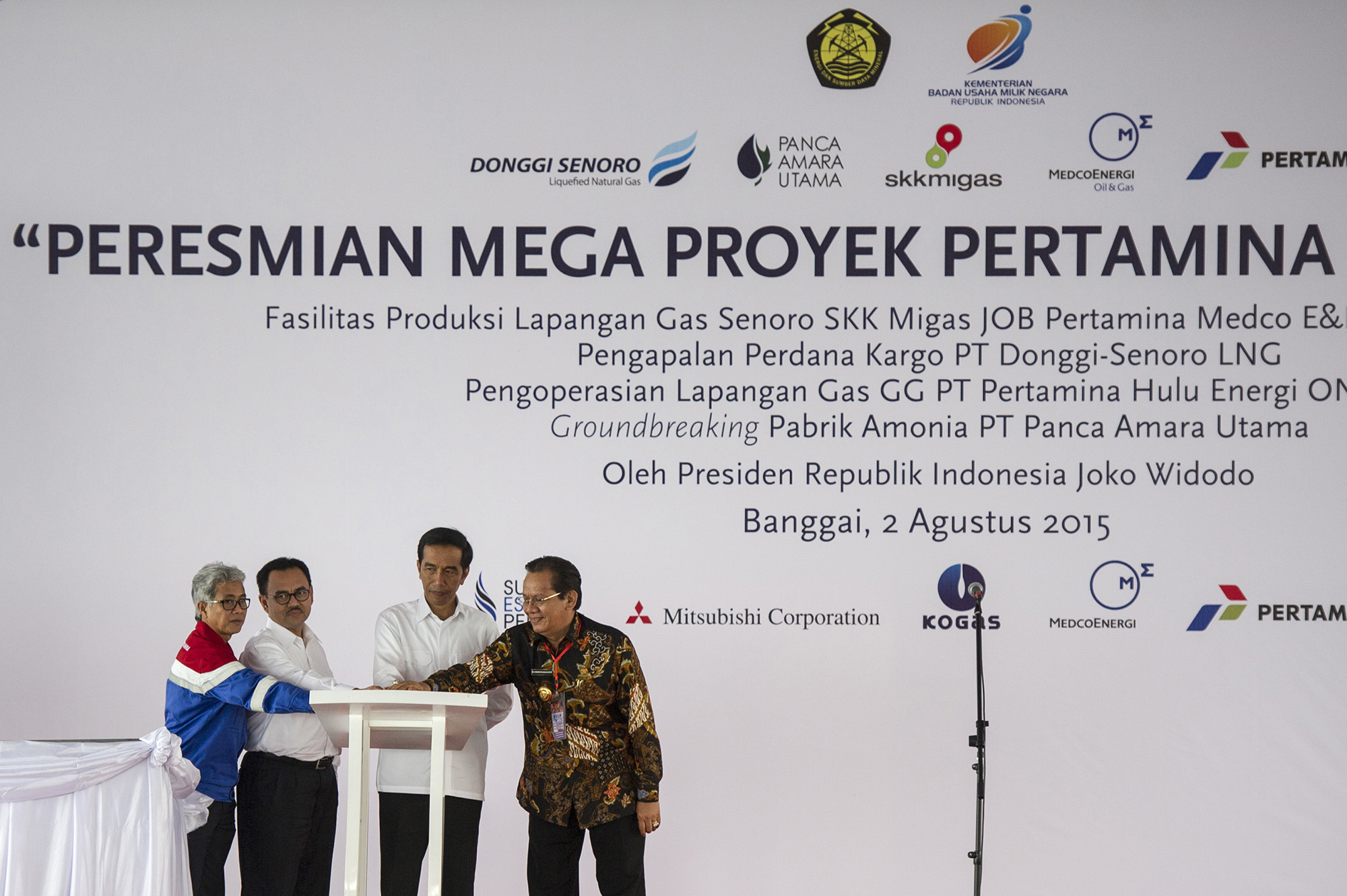 Presiden Joko Widodo (kedua kanan) didampingi Menteri ESDM Sudirman Said (kedua kiri), Direktur Utama Pertamina Dwi Soetjipto (kiri) dan Gubernur Sulawesi Tengah Longki Djanggola (kanan) secara simbolik meresmikan Mega Proyek Pertamina Terintegrasi di Kilang Donggi-Senoro LNG, Banggai, Sulawesi Tengah, Minggu (2/8). Mega proyek yang merupakan proyek hulu hingga hilir minyak dan gas bumi yang diresmikan Presiden Joko Widodo tersebut yaitu fasilitas produksi lapangan gas Senoro SKK Migas JOB Pertamina Medco E&P Tomori Sulawesi, pengapalan perdana kargo PT Donggi-Senoro LNG, pengoperasian lapangan gas GG Pertamina Hulu Energi ONWJ, groundbreaking pabrik Amonia PT Panca Amara Utama. ANTARA FOTO/Ismar Patrizki/kye/ed/NZ/15.