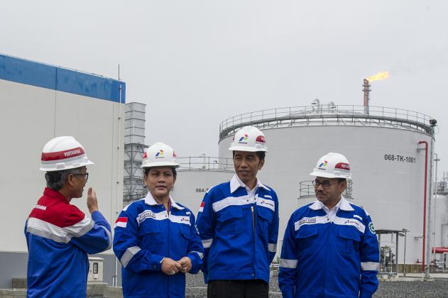 Presiden Joko Widodo (kedua kanan) didampingi Ibu Negara Iriana Joko Widodo (kedua kiri), dan Menteri ESDM Sudirman Said (kanan) berbincang dengan Direktur Utama Pertamina Dwi Soetjipto (kiri) saat mengunjungi Kilang Donggi-Senoro LNG seusai meresmikan Mega Proyek Pertamina Terintegrasi di Banggai, Sulawesi Tengah, Minggu (2/8). Mega proyek yang merupakan proyek hulu hingga hilir minyak dan gas bumi tersebut yaitu fasilitas produksi lapangan gas Senoro SKK Migas JOB Pertamina Medco E&P Tomori Sulawesi, pengapalan perdana kargo PT Donggi-Senoro LNG, pengoperasian lapangan gas GG Pertamina Hulu Energi ONWJ, groundbreaking pabrik Amonia PT Panca Amara Utama. ANTARA FOTO/Ismar Patrizki/ed/NZ/15.