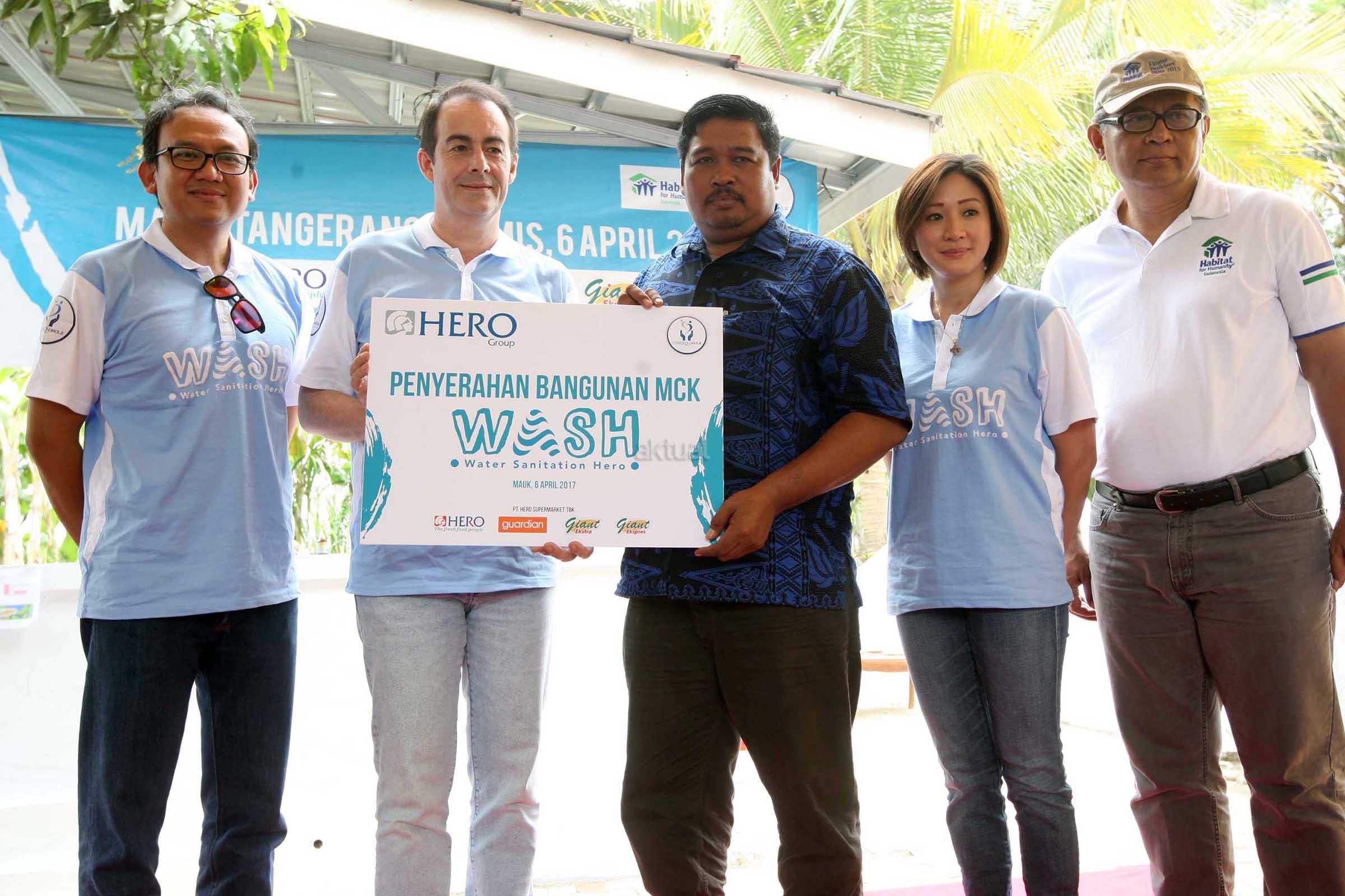 President Director PT Hero Supermarket Tbk, Stephane Deutsch (kedua dari kiri) didampingi Legal Director PT Hero Supermarket Tbk, Hadrianus Wahyu (kiri), Senior General Manager CSR & Corporate Communication , Natalia Lusnita dan Senior Manager Strategic Projects & Program Supports Habitat for Humanity Indonesia, Eddy Sianipar menyerahkan secara simbolis fasilitas sanitasi kepada Kepala Desa dan Lurah Kedung Dalam, Jaenuddin (tengah) di Kampung Tegal Desa Kedung Dalam, Kecamatan Mauk, Tangerang, Banten, Kamis (6/4). Sebagai bentuk kepedulian Hero Group terhadap permasalahan di beberapa wilayah di Indonesia dan dalam rangka memperingati hari Air Sedunia di resmikan juga program WASH (Water Sanitation Hero) yang ditandai dengan kegiatan melakukan pengecatan gambar mural bersama jajaran direksi dan perwakilan karyawan untuk mempercantik area fasilitas MCK (mandi cuci kakus). AKTUAL/Eko S Hilman