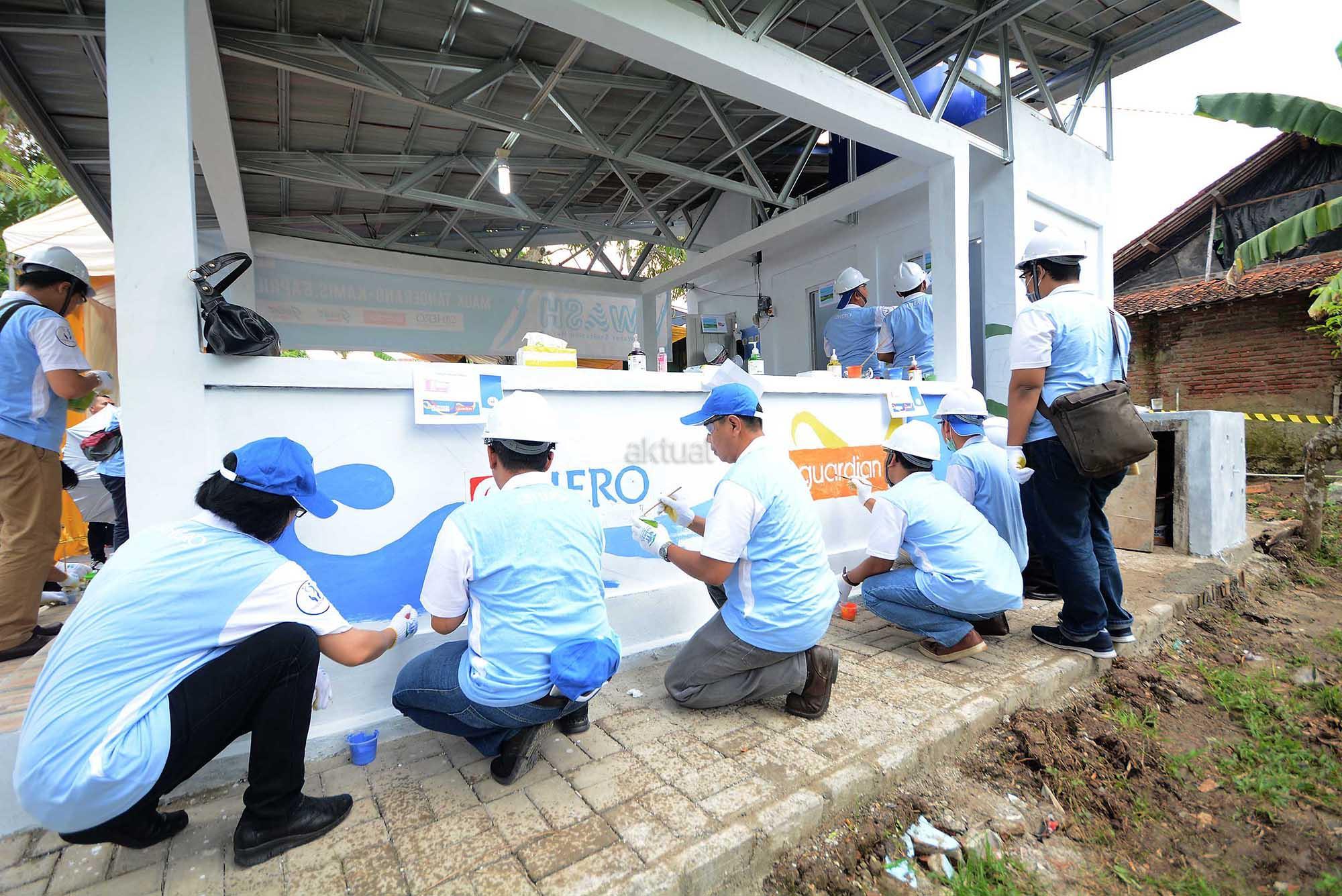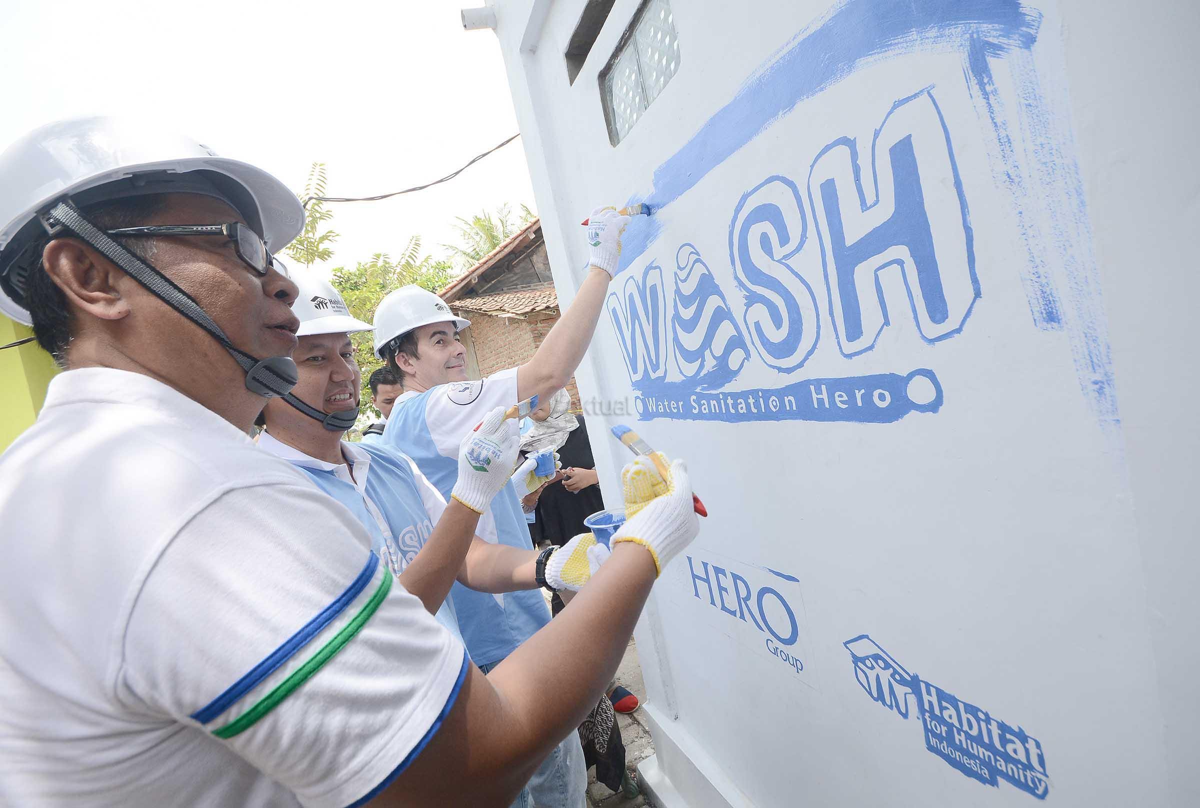 Sejumlah volunteer melakukan penyelesain mural tembok fasilitas MCK disela peresmian program WASH (Water Sanitation Hero)di Kampung Tegal Desa Kedung Dalam, Kecamatan Mauk, Tangerang, Banten, Kamis (6/4). Sebagai bentuk kepedulian Hero Group terhadap permasalahan di beberapa wilayah di Indonesia dan dalam rangka memperingati hari Air Sedunia, Hero Group juga menyerahkan ketersediaan fasilitas Sanitasi yang baik bagi masyrakat khususnya di wilayah Tangerang dan Bogor. Pada kesempatan yang sama juga dilakukan pemeriksaan dan pengobatan gratis bagi sekitar 200 orang warga Mauk. AKTUAL/Eko S Hilman