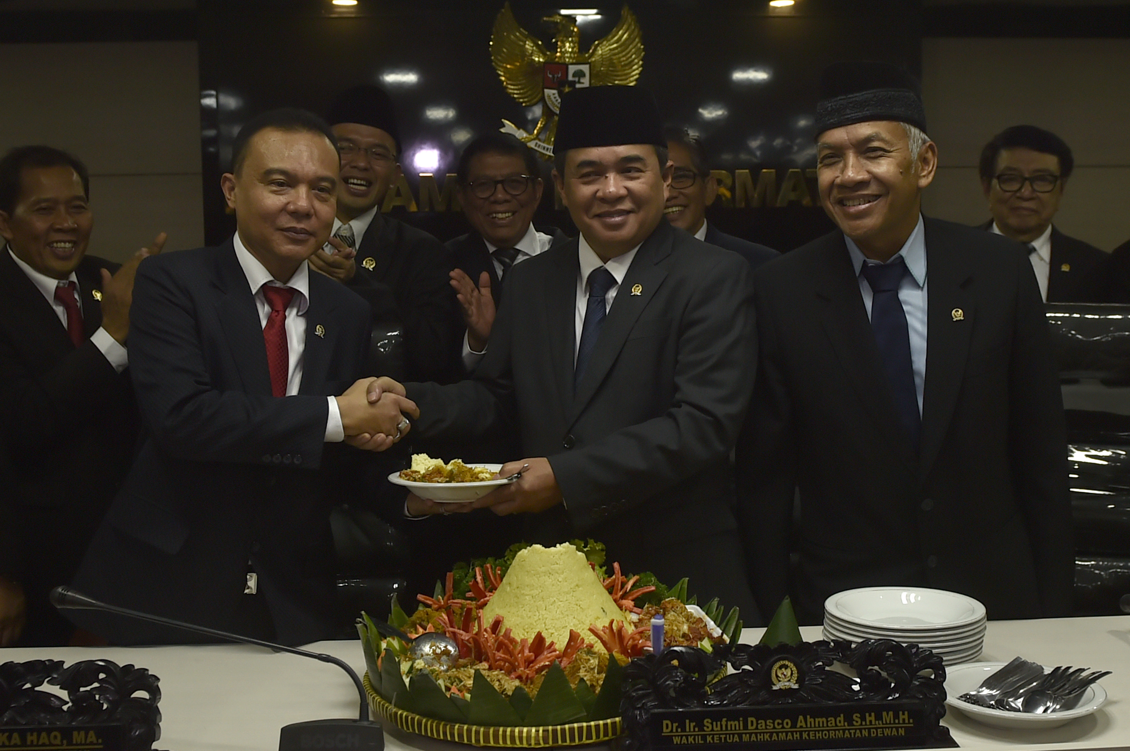 Ketua DPR Ade Komarudin (kedua kanan) didampingi Wakil Ketua Agus Hermanto (kanan) menyerahkan potongan tumpeng kepada Ketua Mahkamah Kehormatan Dewan (MKD) Sufmi Dasco Ahmad (kiri) pada peresmian ruang kerja MKD di Komplek Parlemen Senayan, Jakarta, Kamis (28/7). MKD menempati ruang baru yang lebih representatif guna menunjang tugas anggota. ANTARA FOTO/Puspa Perwitasari/ama/16