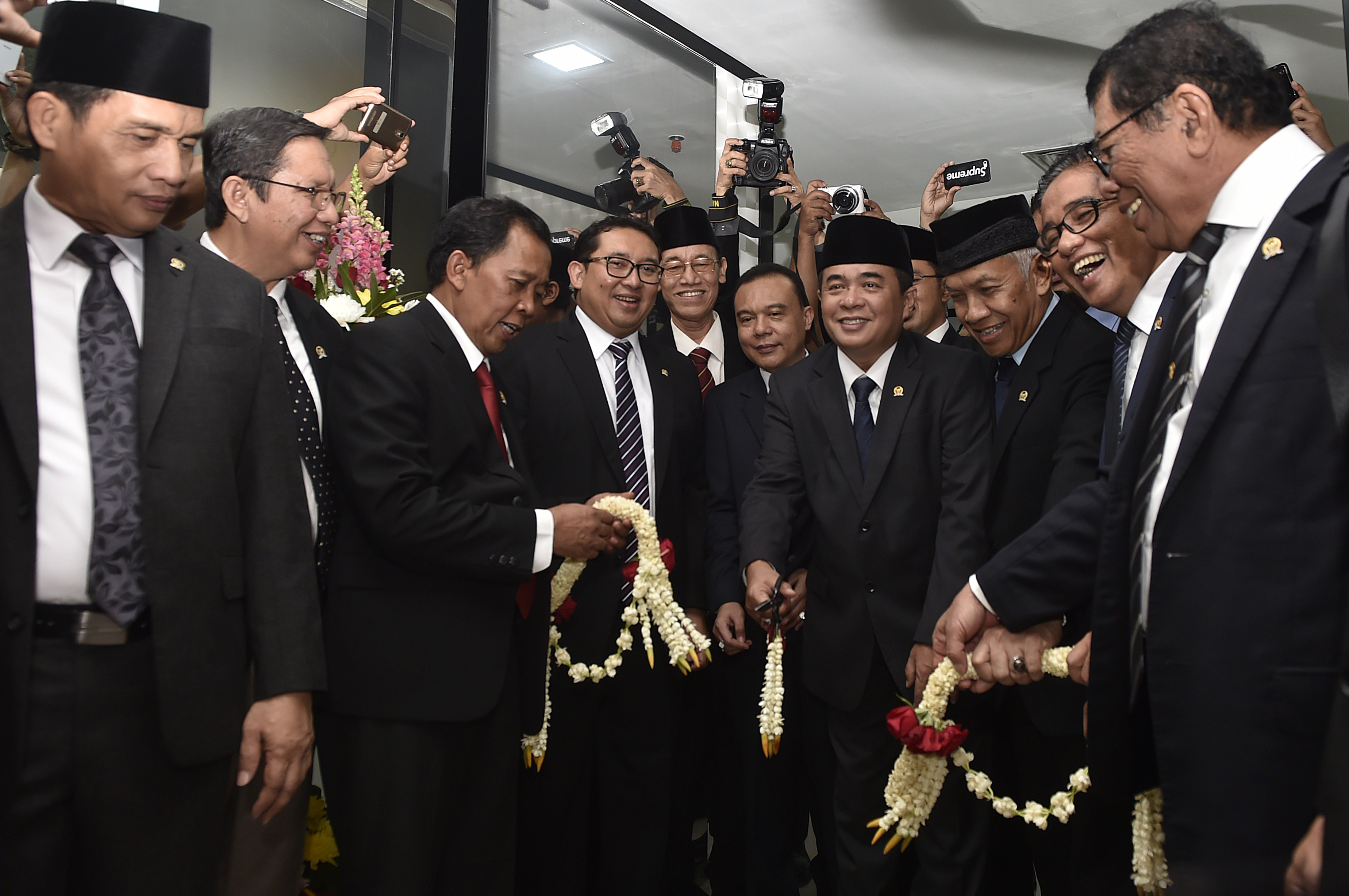 Ketua DPR Ade Komarudin (keempat kanan) didampingi Wakil Ketua Agus Hermanto (ketiga kanan), Fadli Zon (keempat kiri) meresmikan ruang kerja MKD di Komplek Parlemen Senayan, Jakarta, Kamis (28/7). MKD menempati ruang baru yang lebih representatif guna menunjang tugas anggota. ANTARA FOTO/Puspa Perwitasari/ama/16
