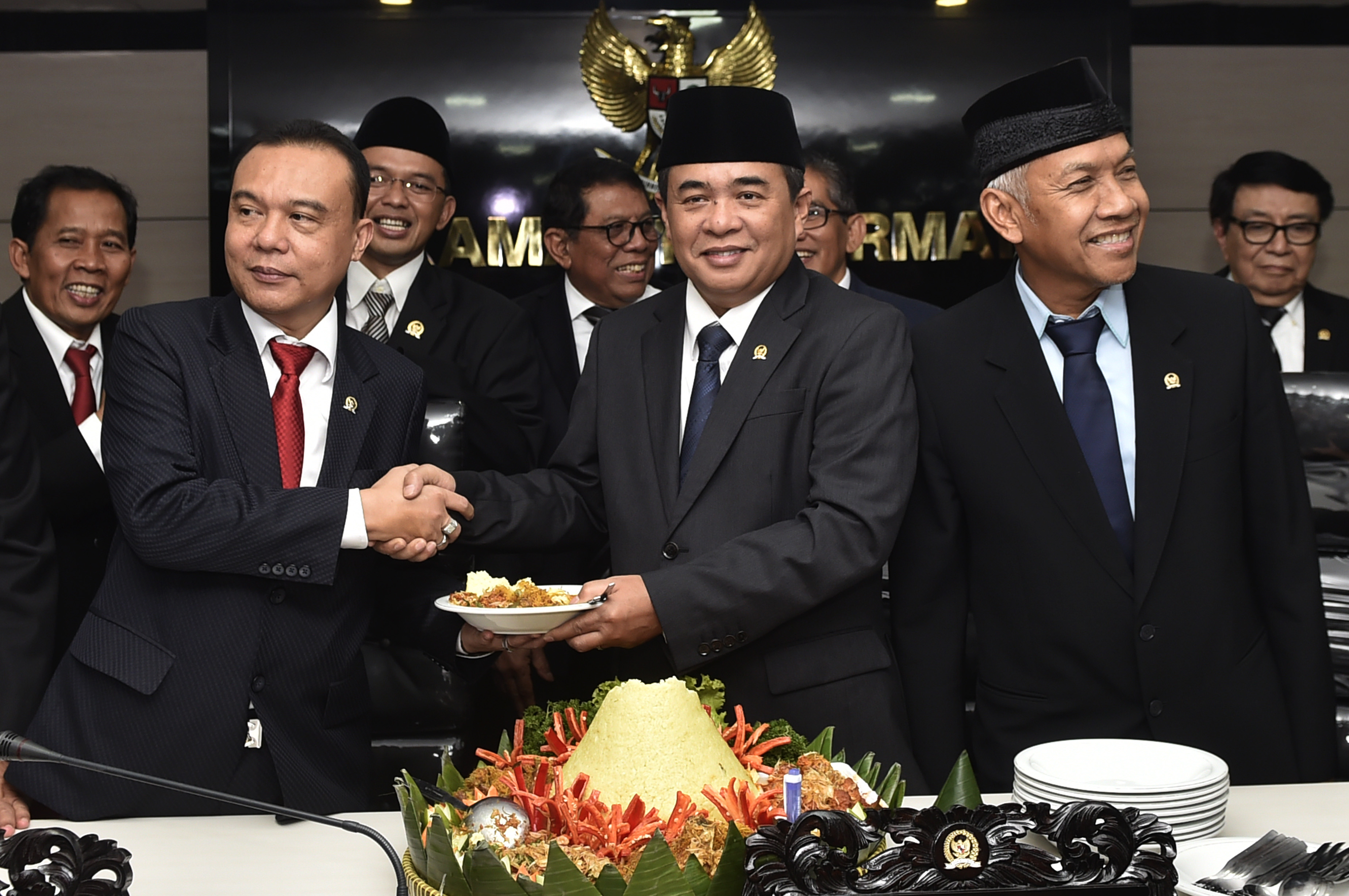 Ketua DPR Ade Komarudin (tengah) didampingi Wakil Ketua Agus Hermanto (kanan) menyerahkan potongan tumpeng kepada Ketua Mahkamah Kehormatan Dewan (MKD) Sufmi Dasco Ahmad (kiri) pada peresmian ruang kerja MKD di Komplek Parlemen Senayan, Jakarta, Kamis (28/7). MKD menempati ruang baru yang lebih representatif guna menunjang tugas anggota. ANTARA FOTO/Puspa Perwitasari/ama/16