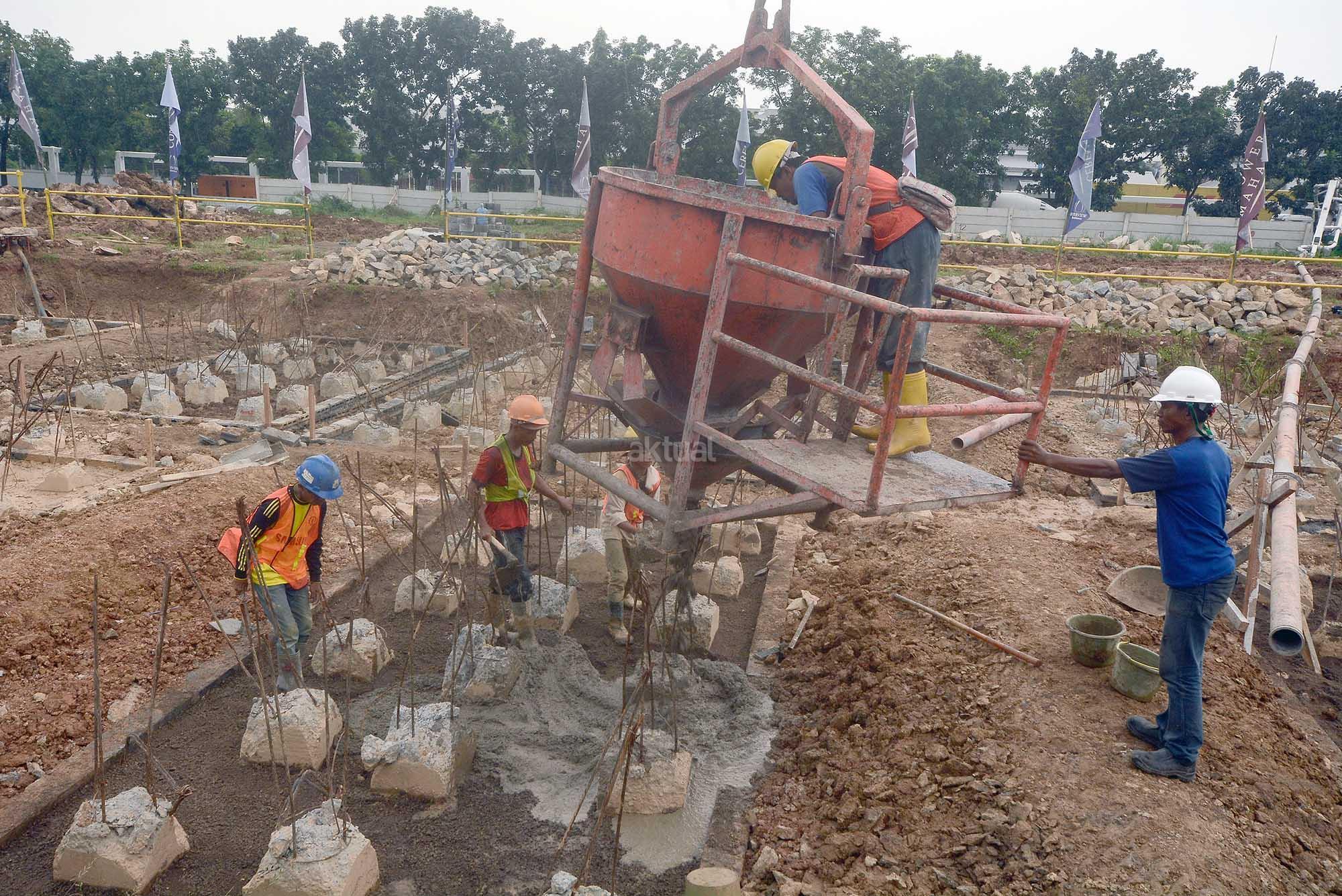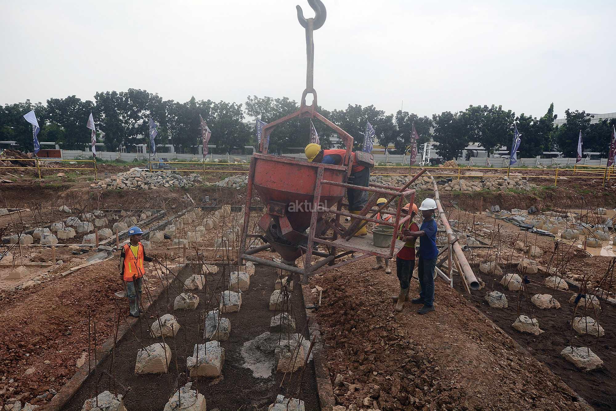 Pekerja melakukan pengecoran pertama proyek tower pertama Riverview Residence di Kawasan Jababeka, Cikarang, Jawa Barat, Rabu (30/11). Proyek ini dibangun di atas lahan seluas 2,5 hektare yang rencananya akan hadir dengan 4 tower yaitu, Tower Mahakam, Tower Bengawan, Tower Kapuas dan Tower Barito. Apartemen Riverview Residence nantinya akan memiliki sejumlah fasilitas pendukung bagi para penghuni, antara lain sarana olahraga, ATM center dan area komersial untuk memudahkan pemenuhan kebutuhan sehari hari.