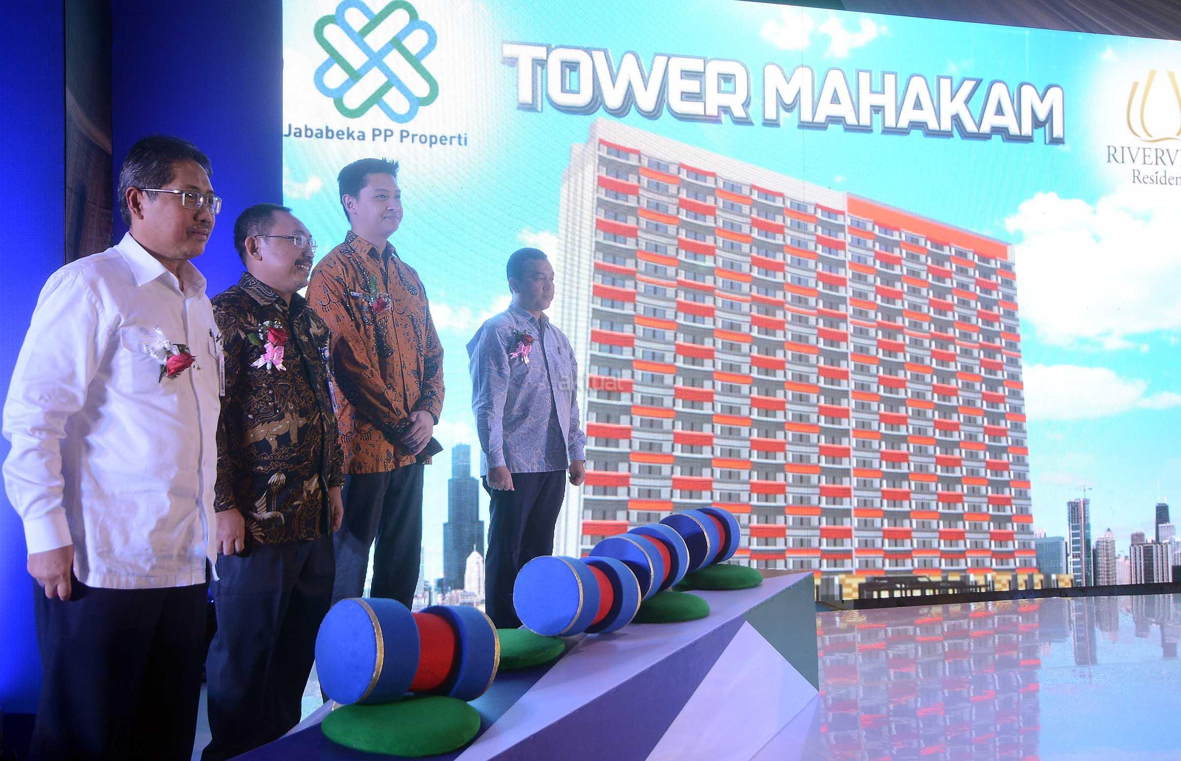 Dari kiri ke kanan, Dirjen Penyediaan Perumahan Kementrian PUPR Syarif Burhanudin, Direktur Operasi PT Jababeka PP Properti Harris Amin Singgih, Direktur PT Jababeka Sutedja S Darmono serta Direktur Utama PT PP Properti Tbk Taufik Hidayat saat melakukan prosesi peresmian dimulainyan proyek tower pertama Riverview Residence di Kawasan Jababeka, Cikarang, Jawa Barat, Rabu (30/11). Proyek ini dibangun di atas lahan seluas 2,5 hektare yang rencananya akan hadir dengan 4 tower yaitu, Tower Mahakam, Tower Bengawan, Tower Kapuas dan Tower Barito. AKTUAL/Eko S Hilman