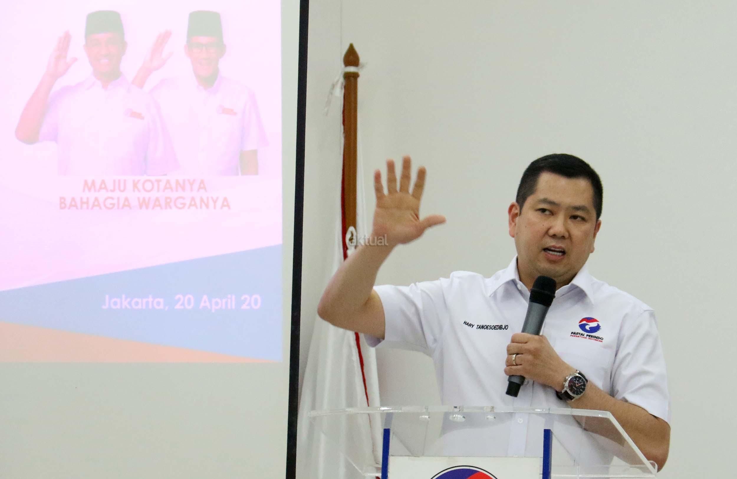 Ketua Umum Partai Perindo Hary Tanoesoedibjo berpidato di DPP Partai Perindo, Jalan Diponegoro, Menteng, Jakarta Pusat, Kamis (20/4/2017). Partai Perindo menggelar syukuran keunggulan Anies-Sandi dari Ahok-Djarot, dalam hitung cepat semua lembaga survei terkait Pilkada DKI Jakarta putaran kedua. AKTUAL/Munzir