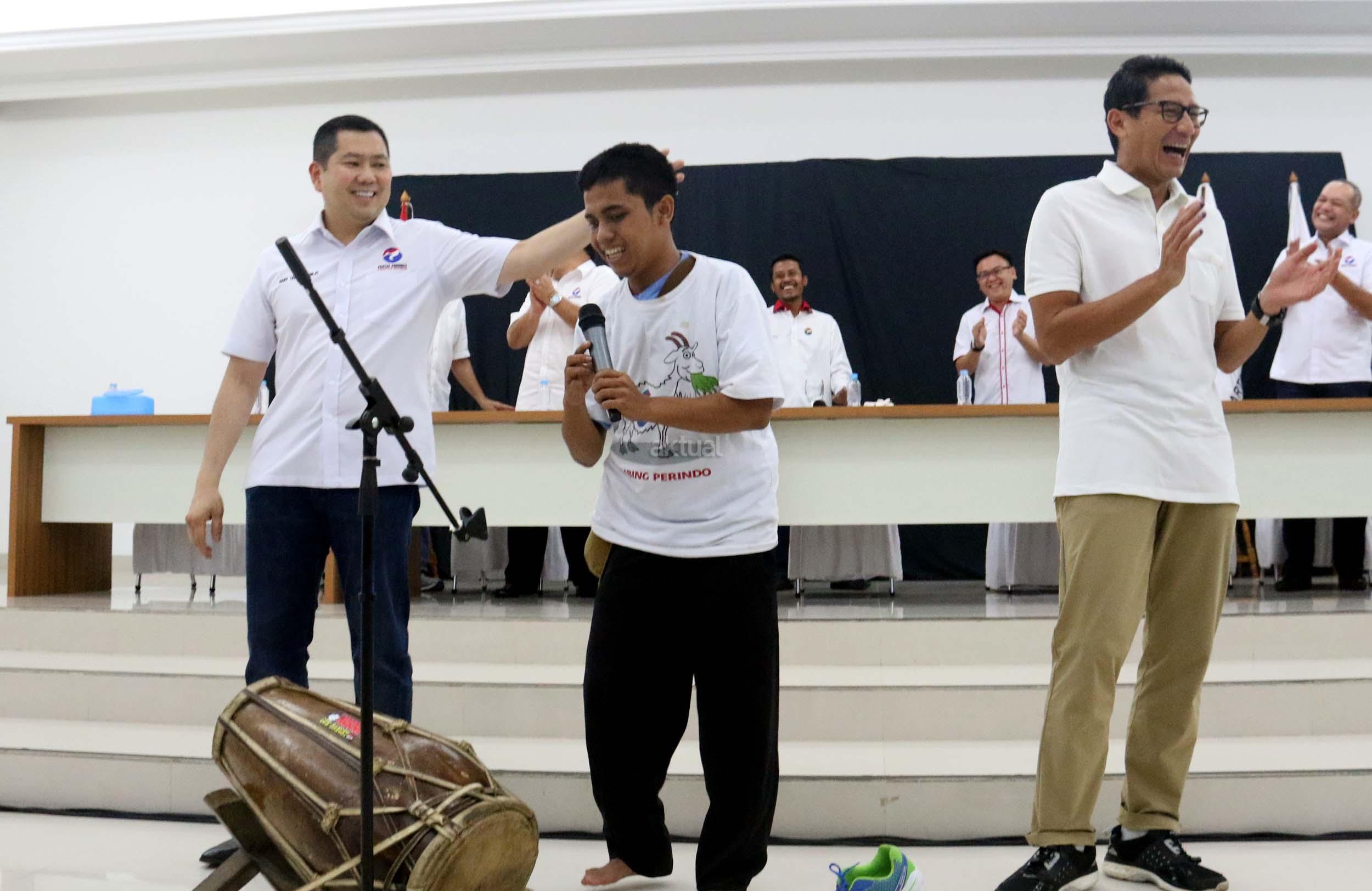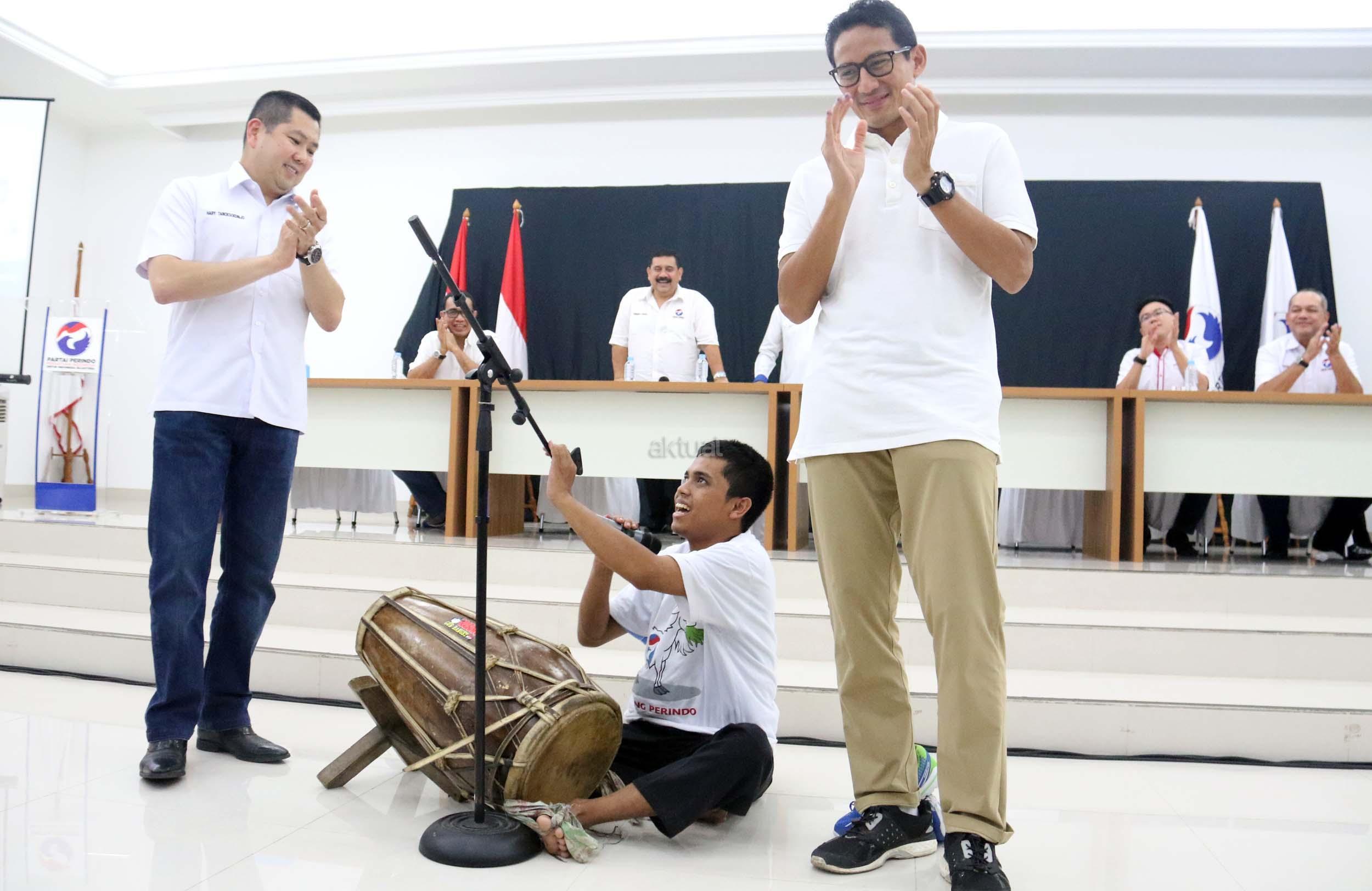 Ketua Umum Partai Perindo Hary Tanoesoedibjo (kiri) bersama dengan Cawagub DKI Jakarta Sandiaga Uno (kanan) menyaksikan peyandang disabilitas Yana memainkan alat musik gendang di DPP Partai Perindo, Jalan Diponegoro, Menteng, Jakarta Pusat, Kamis (20/4/2017). Partai Perindo menggelar syukuran keunggulan Anies-Sandi dari Ahok-Djarot, dalam hitung cepat semua lembaga survei terkait Pilkada DKI Jakarta putaran kedua. AKTUAL/Munzir