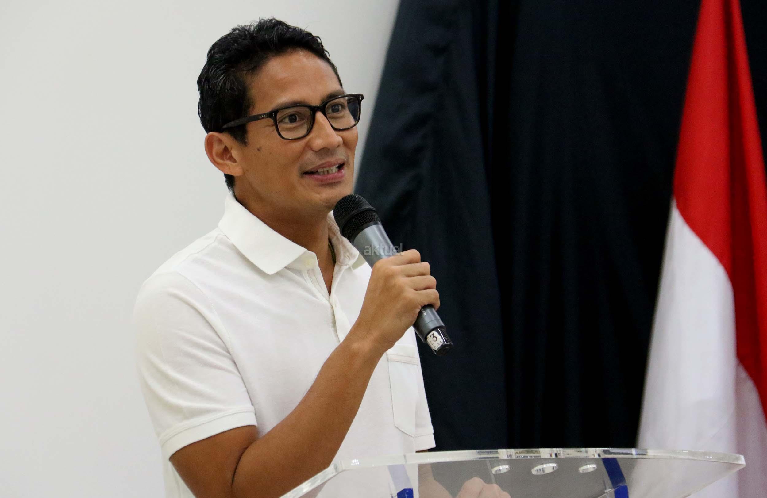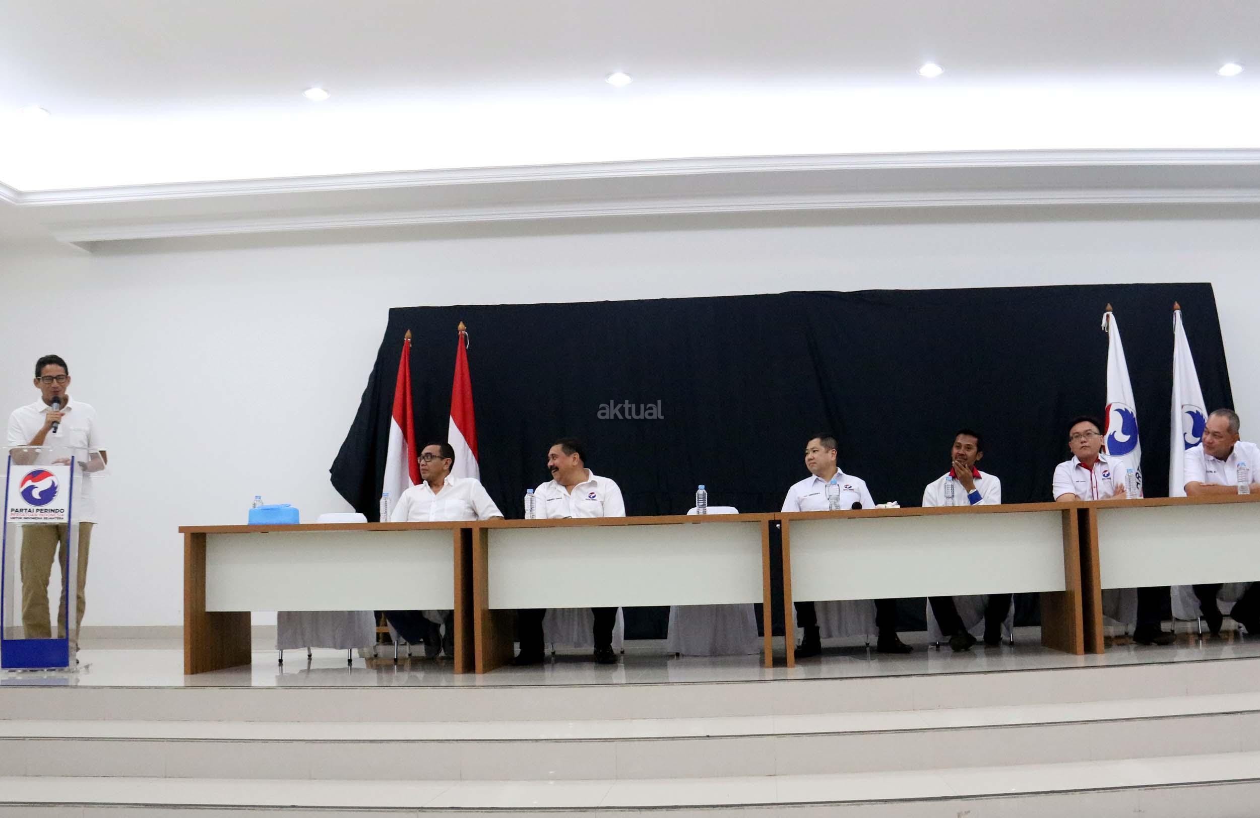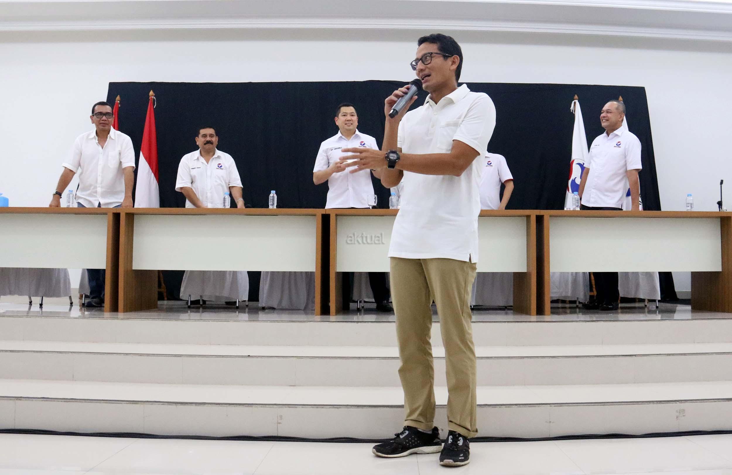 Cawagub DKI Jakarta Sandiaga Uno berpidato di DPP Partai Perindo, Jalan Diponegoro, Menteng, Jakarta Pusat, Kamis (20/4/2017). Partai Perindo menggelar syukuran keunggulan Anies-Sandi dari Ahok-Djarot, dalam hitung cepat semua lembaga survei terkait Pilkada DKI Jakarta putaran kedua. AKTUAL/Munzir