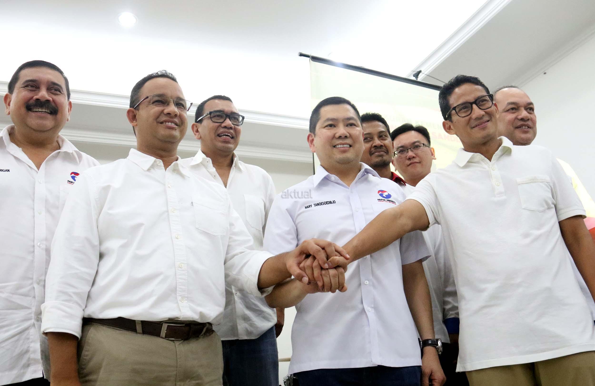 Ketua Umum Partai Perindo Hary Tanoesoedibjo bersama Cagub dan Cawagub DKI Jakarta, Anies Baswedan-Sandiaga Uno di DPP Partai Perindo, Jalan Diponegoro, Menteng, Jakarta Pusat, Kamis (20/4/2017). Partai Perindo menggelar syukuran keunggulan Anies-Sandi dari Ahok-Djarot, dalam hitung cepat semua lembaga survei terkait Pilkada DKI Jakarta putaran kedua. AKTUAL/Munzir