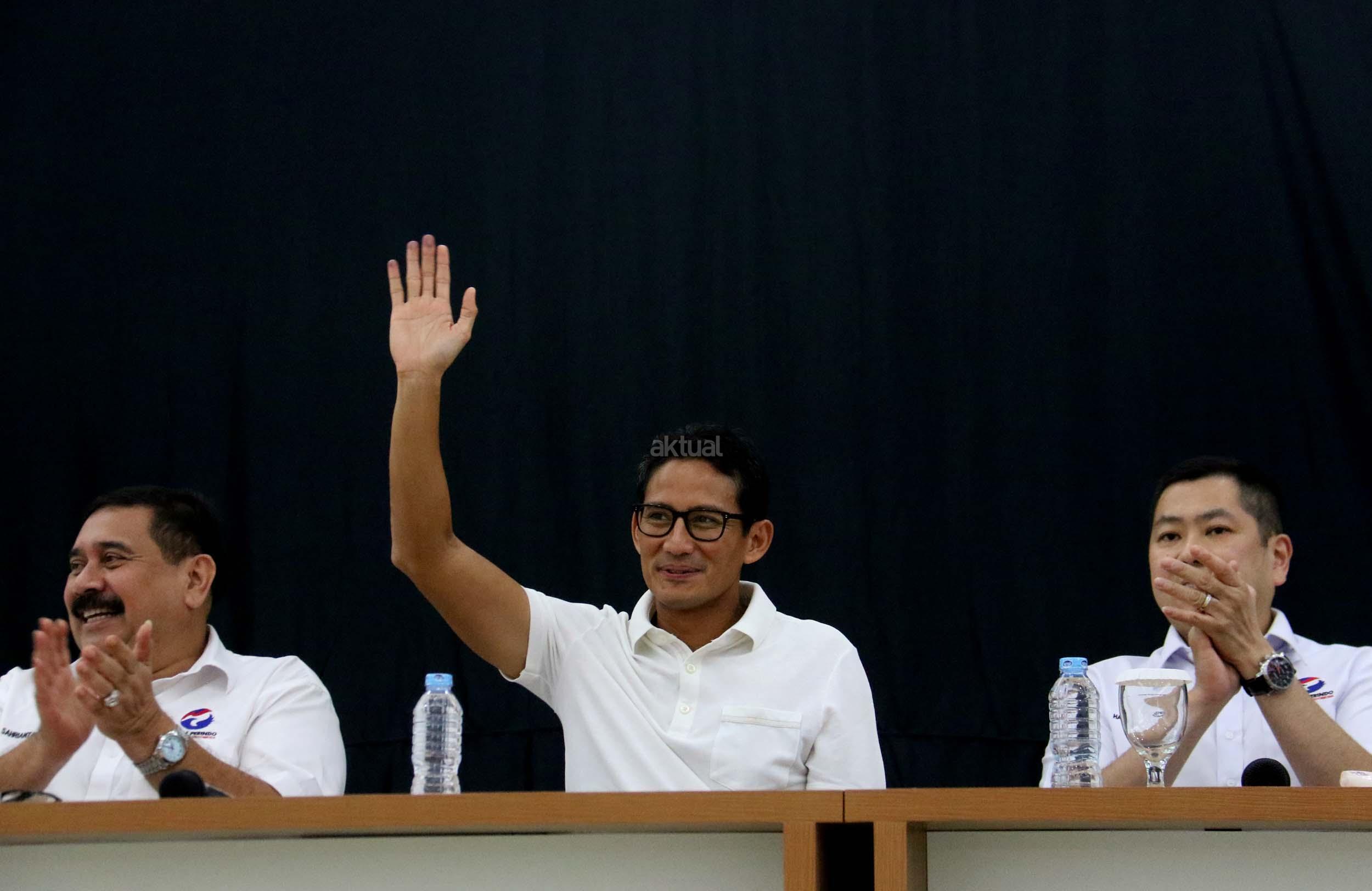 Cawagub DKI Jakarta Sandiaga Uno di DPP Partai Perindo, Jalan Diponegoro, Menteng, Jakarta Pusat, Kamis (20/4/2017). Partai Perindo menggelar syukuran keunggulan Anies-Sandi dari Ahok-Djarot, dalam hitung cepat semua lembaga survei terkait Pilkada DKI Jakarta putaran kedua. AKTUAL/Munzir