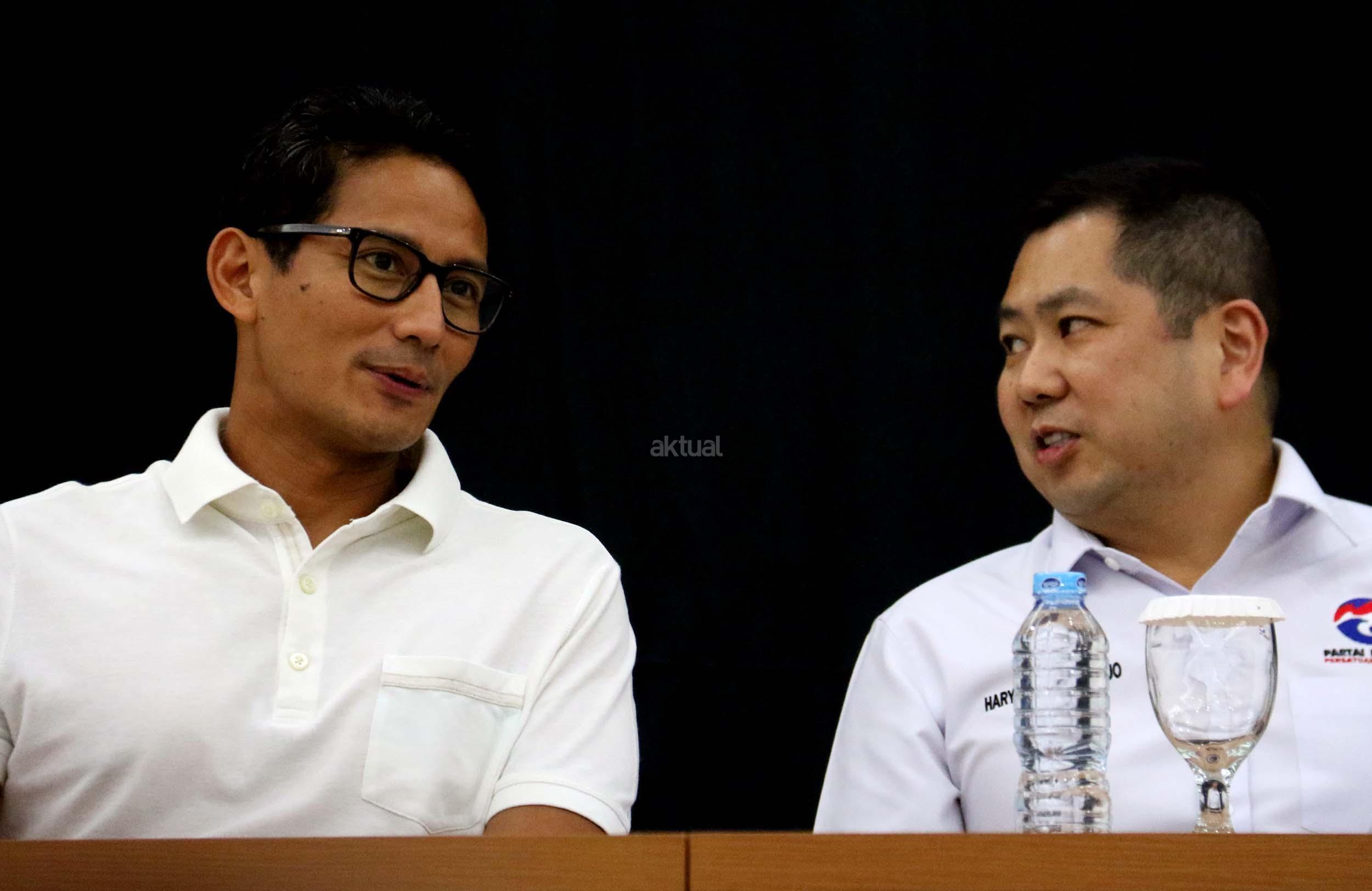 Ketua Umum Partai Perindo Hary Tanoesoedibjo (kanan) berdialog dengan Cawagub DKI Jakarta Sandiaga Uno (kiri) di DPP Partai Perindo, Jalan Diponegoro, Menteng, Jakarta Pusat, Kamis (20/4/2017). Partai Perindo menggelar syukuran keunggulan Anies-Sandi dari Ahok-Djarot, dalam hitung cepat semua lembaga survei terkait Pilkada DKI Jakarta putaran kedua. AKTUAL/Munzir