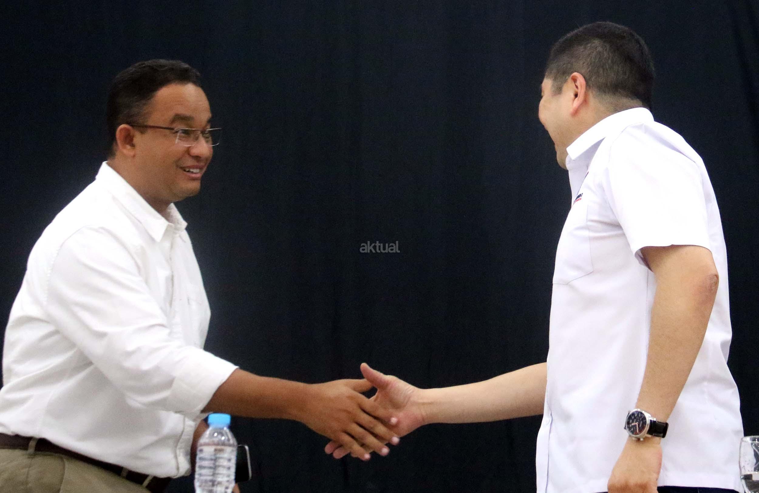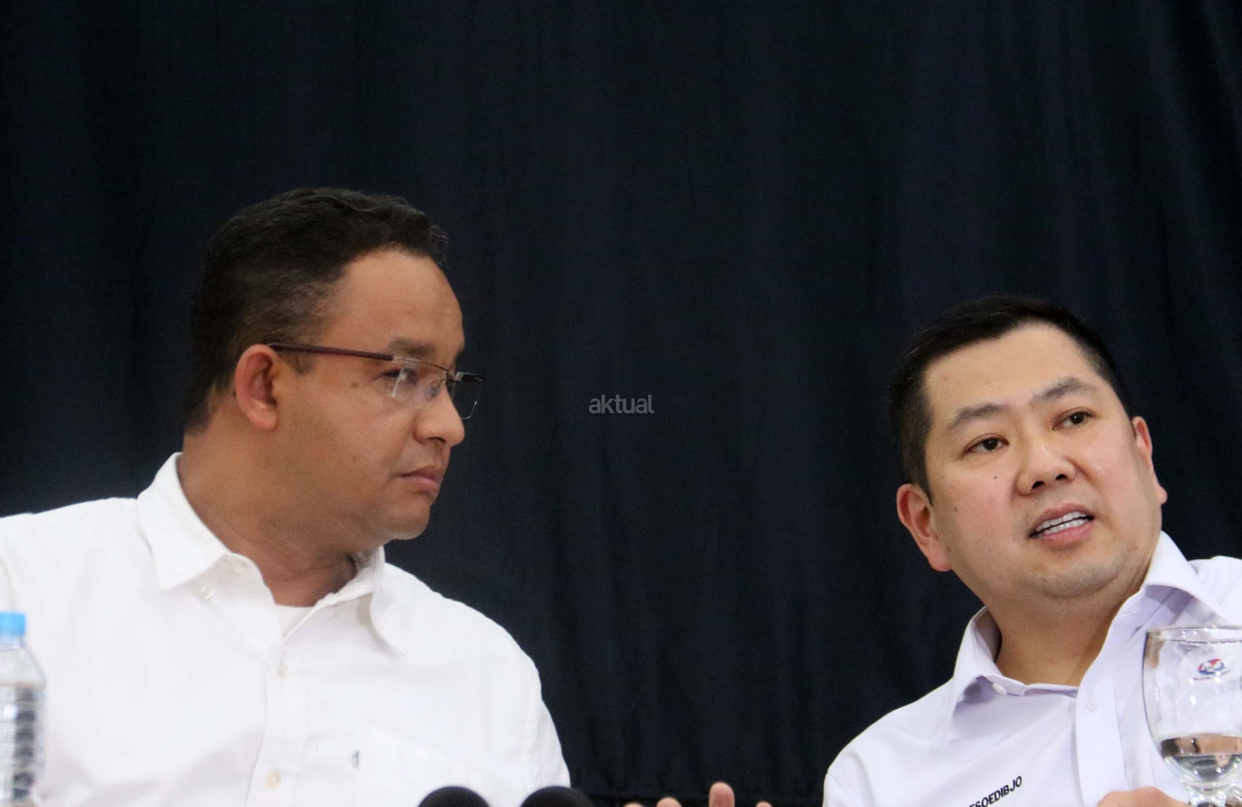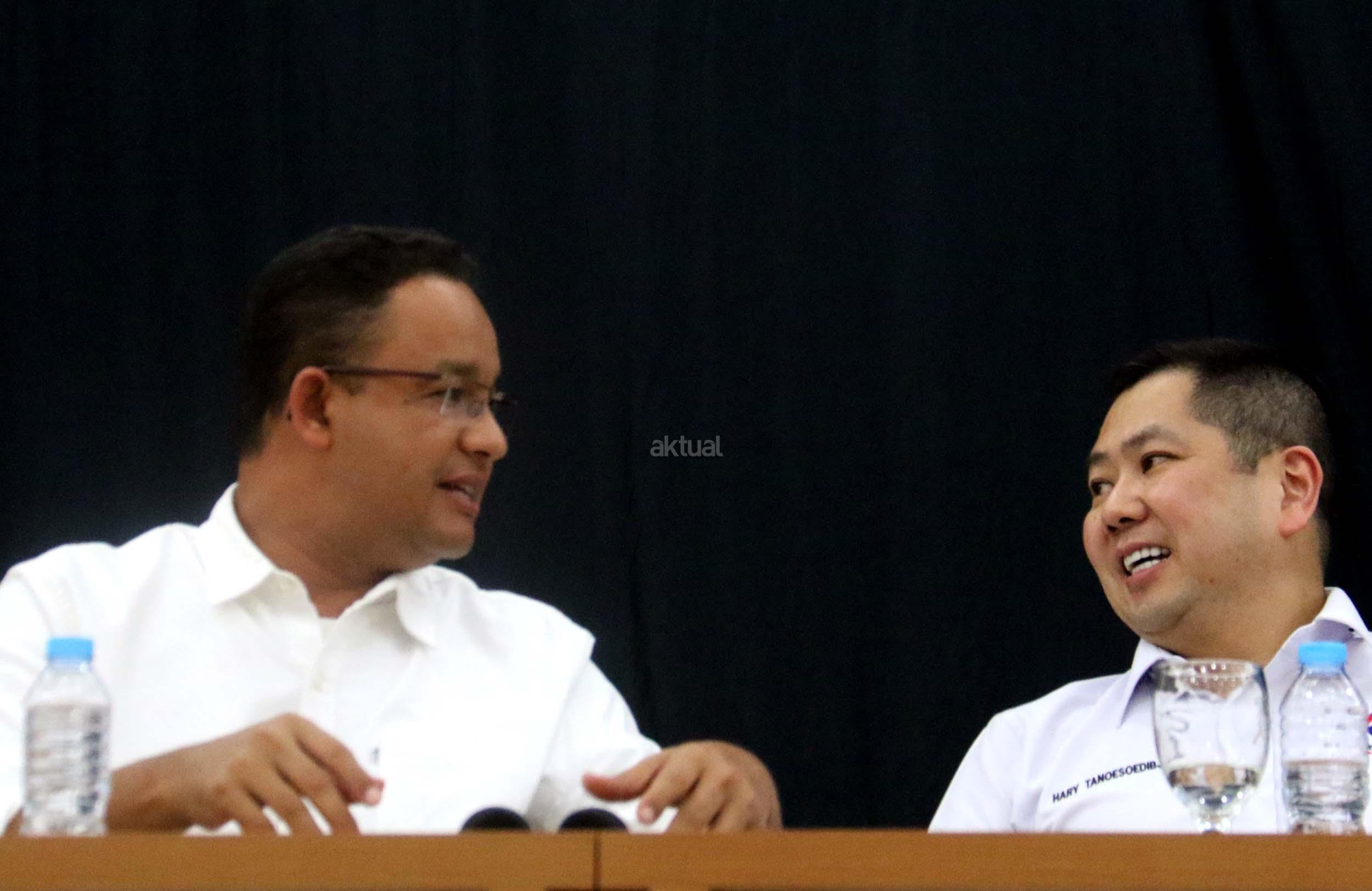 Ketua Umum Partai Perindo Hary Tanoesoedibjo (kanan) berdialog dengan Cagub DKI Jakarta Anies Baswedan (kiri) di DPP Partai Perindo, Jalan Diponegoro, Menteng, Jakarta Pusat, Kamis (20/4/2017). Partai Perindo menggelar syukuran keunggulan Anies-Sandi dari Ahok-Djarot, dalam hitung cepat semua lembaga survei terkait Pilkada DKI Jakarta putaran kedua. AKTUAL/Munzir