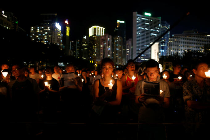 Ribuan warga mengikuti malam nyala lilin untuk memperingati 27 tahun kekerasan terhadap gerakan pro-demokrasi di Lapangan Tiananmen Beijing pada 1989, di Victoria Park, Hong Kong, Sabtu (4/6). ANTARA FOTO/REUTERS/Bobby Yip/djo/16