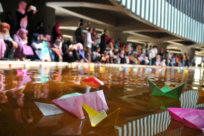 Sejumlah warga, mahasiswa dan pelajar melepas kapal kertas saat memperiungati lima tahun bencana tsunami Jepang di Museum Tsunami Aeh di Banda Aceh, Jumat (11/3). Peringatan tsunami Jepang di Aceh yang dilaksanakan setiap tahun oleh Forum Persahabatan Indonesia-Jepang itu merupakan kebersamaan kedua negara, khususnya Aceh dengan Jepang untuk mempererat solidaritas dan kerjasama kemanusian dalam menangani musibah gempa dan tsunami. ANTARA FOTO/Ampelsa/pd/16