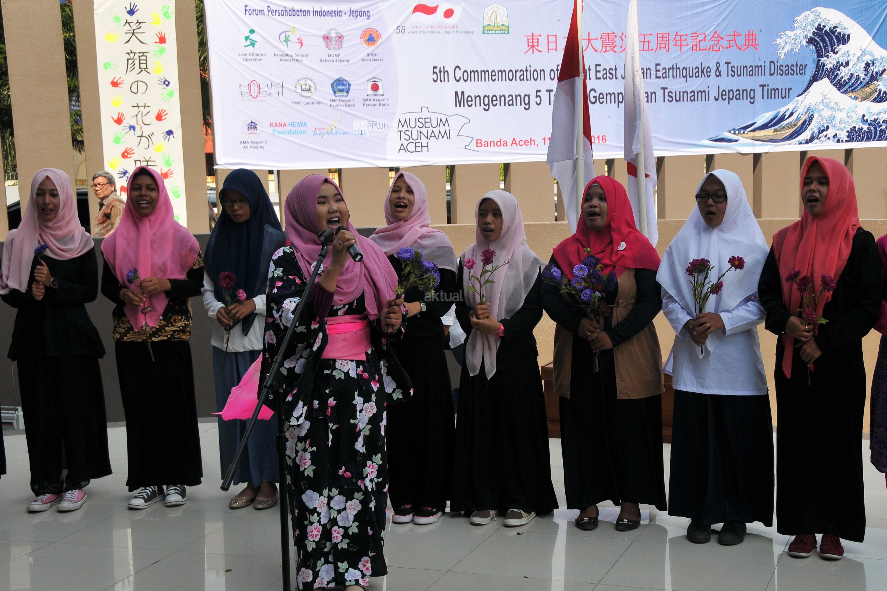 Pelajar Aceh bersama mahasiswa menyanyikan lagu Jepang, Omoiyari dan Hana Wa saat memperiungati lima tahun bencana tsunami Jepang di Museum Tsunami Aeh di Banda Aceh, Jumat (11/3). Peringatan tsunami Jepang di Aceh yang dilaksanakan setiap tahun oleh Forum Persahabatan Indonesia-Jepang itu merupakan kebersamaan kedua negara, khususnya Aceh dengan Jepang untuk mempererat solidaritas dan kerjasama kemanusian dalam menangani musibah gempa dan tsunami. ANTARA FOTO/Ampelsa/pd/16