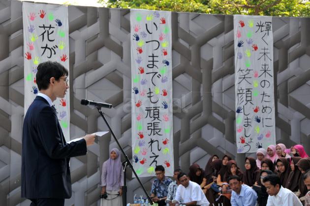 Kosulat Jenderal Jepang di Medan, Takayuki Kawaii memberikan kata sambutan pada peringatan lima tahun bencana tsunami Jepang di Museum Tsunami Aeh di Banda Aceh, Jumat (11/3). Peringatan tsunami Jepang di Aceh yang dilaksanakan setiap tahun oleh Forum Persahabatan Indonesia-Jepang itu merupakan kebersamaan kedua negara, khususnya Aceh dengan Jepang untuk mempererat solidaritas dan kerjasama kemanusian dalam menangani musibah gempa dan tsunami. ANTARA FOTO/Ampelsa/pd/16