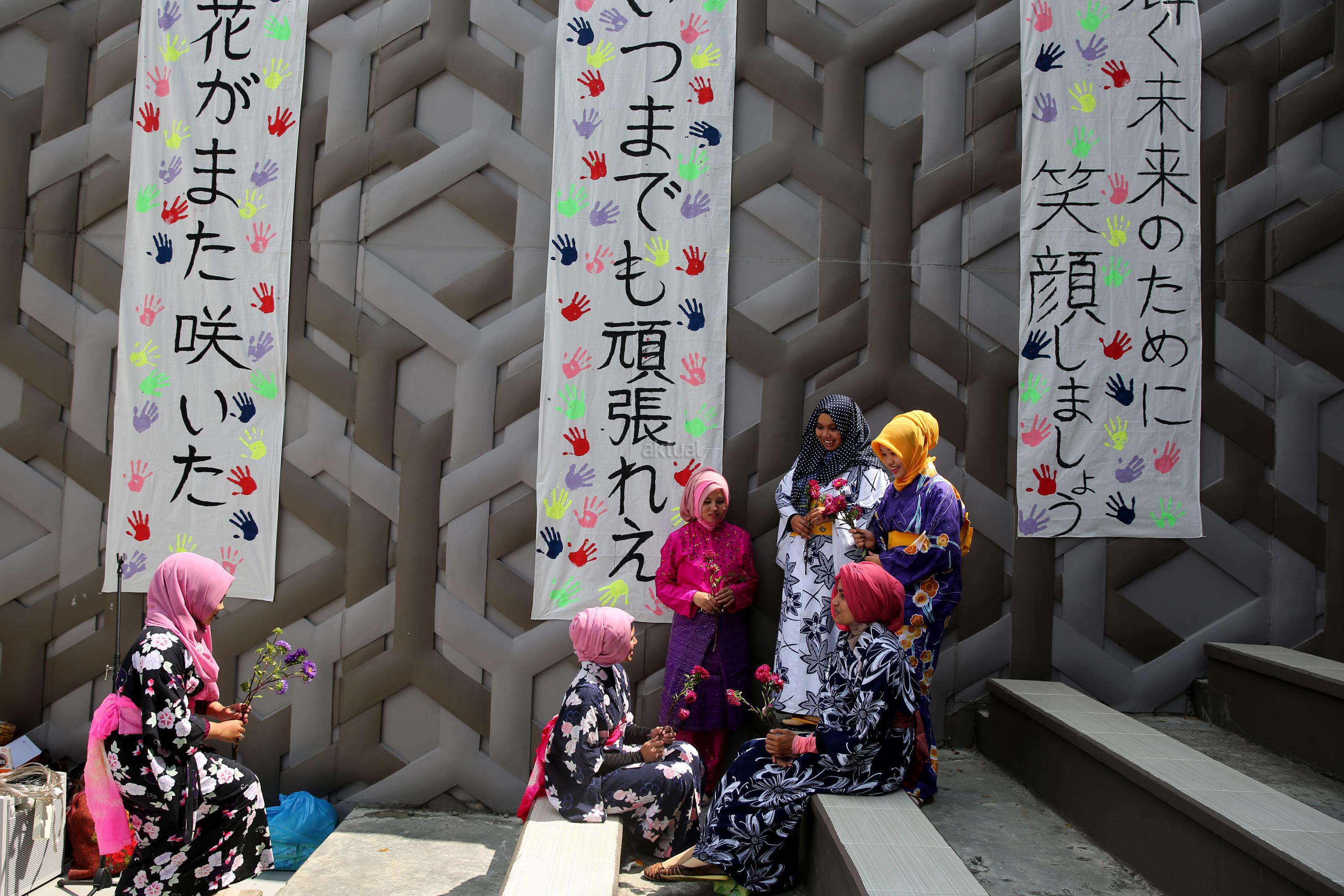 Pelajar mengenakan pakaian tradisional Jepang (kimono) saat mengikuti peringatan lima tahun gempa dan tsunami Jepang di Banda Aceh, Aceh, Jumat (11/3). Peringatan lima tahun bencana gempa dan tsunami Jepang yang dilaksanakan Kogetsu School serta Kogetsu School Association sebagai wujud kepedulian dan memberikan semangat agar bangkit kembali pascabencana alam yang melanda Jepang Timur lima tahun lalu. ANTARA FOTO/Irwansyah Putra/kye/16.