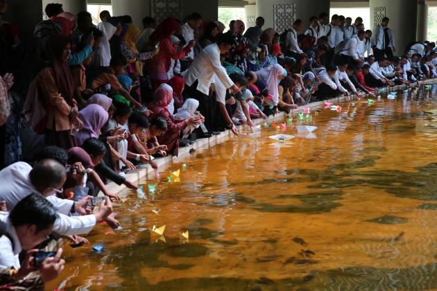 Pelajar dan warga melepas kapal kertas sebagai simbol melupakan masa lalu pada peringatan lima tahun bencana gempa dan tsunami Jepang di Banda Aceh, Aceh, Jumat (11/3). Peringatan lima tahun bencana gempa dan tsunami Jepang yang dilaksanakan Kogetsu School serta Kogetsu School Association sebagai wujud kepedulian dan memberikan semangat agar bangkit kembali pascabencana alam yang melanda Jepang Timur lima tahun lalu. ANTARA FOTO/Irwansyah Putra/kye/16.