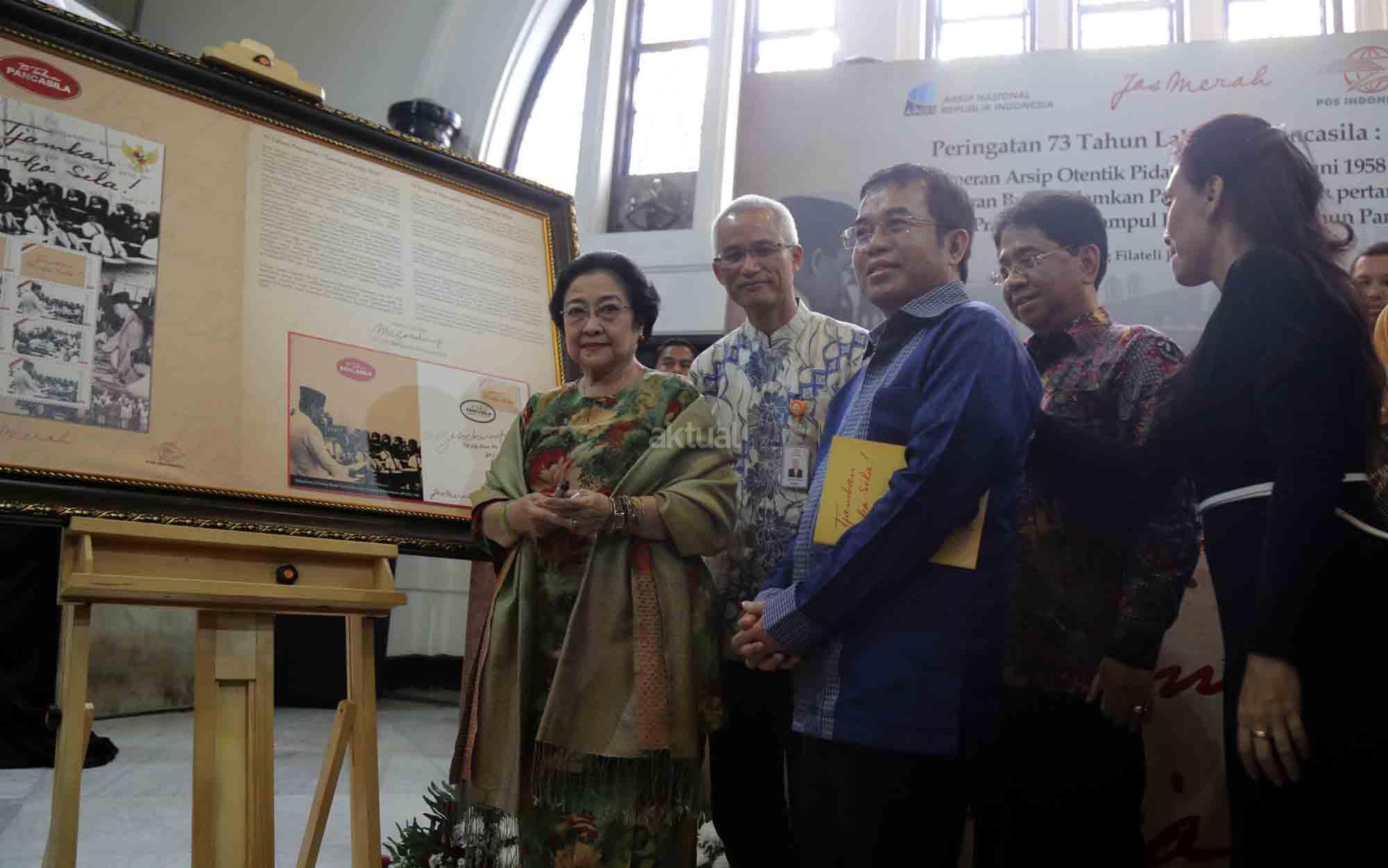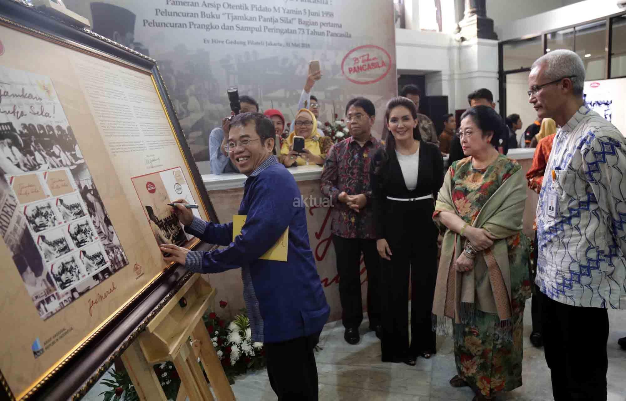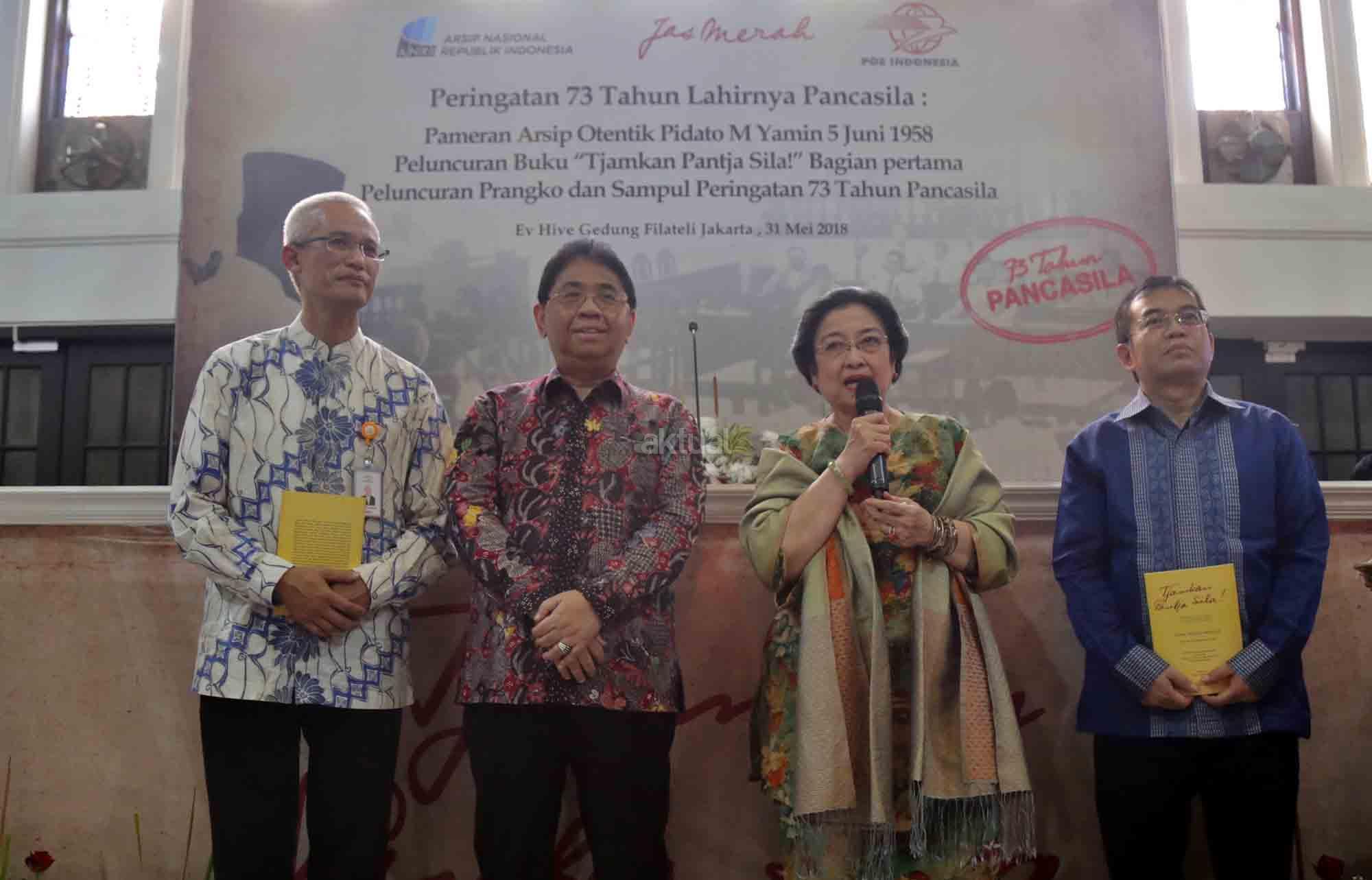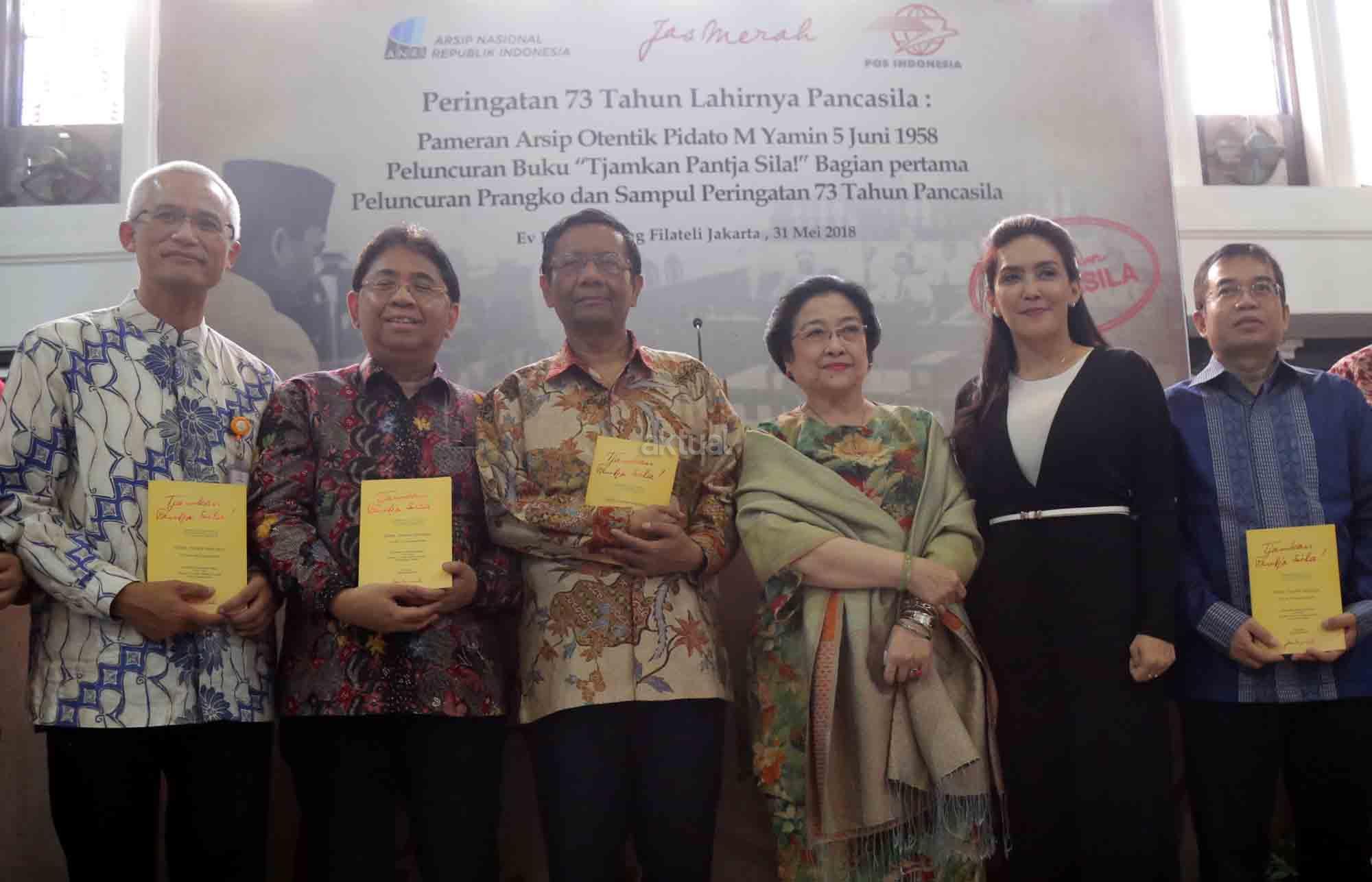 Presiden ke-5 RI sekaligus Ketua Dewan Pengarah Badan Pembinaan Ideologi Pancasila (BPIP) Megawati Soekarnoputri didampingi Anggota Dewan Pengarah BPIP Mahfud MD, Ketua BPIP Yudi Latif, Duta Arsip Nasional sekaligus politikus PDIP Rieke Diah Pitaloka, Dirut PT POS Gilarsi Wahyu Setijono dan Kepala Arsip Nasional RI Mustari Irawan saat menghadiri Peringatan 73 Tahun Lahirnya Pancasila dan peluncuran buku di Museum Filateli, Jakarta, Kamis (31/5/18). Dalam Acara tersebut PT Pos Indonesia (Persero) bekerjasama dengan Arsip Nasional Republik Indonesia (ANRI) meluncurkan Prangko Bung Karno di Sidang BPUPK serta Sampul Hari Pertama Peringatan 73 Tahun Lahirnya Pancasila. Dalam acara peringatan Pancasila tersebut juga diluncurkan buku ‘Tjamkan Pantja Sila’: Sistem Filsaafat Pancasila, yang merupakan tulisan tangan Bung Karno tentang makna dan gagasan Ideologi Pancasila. AKTUAL/Tino Oktaviano