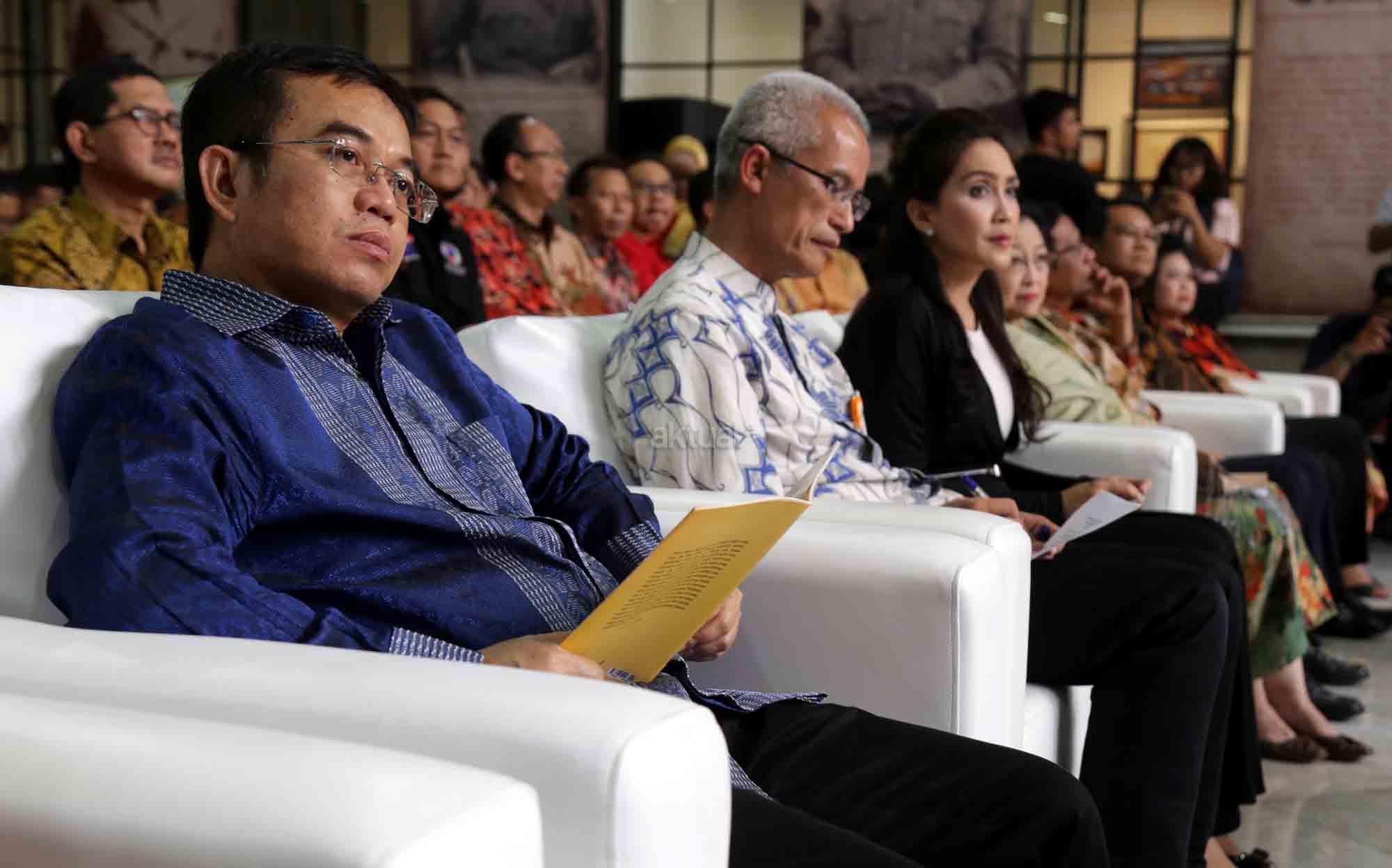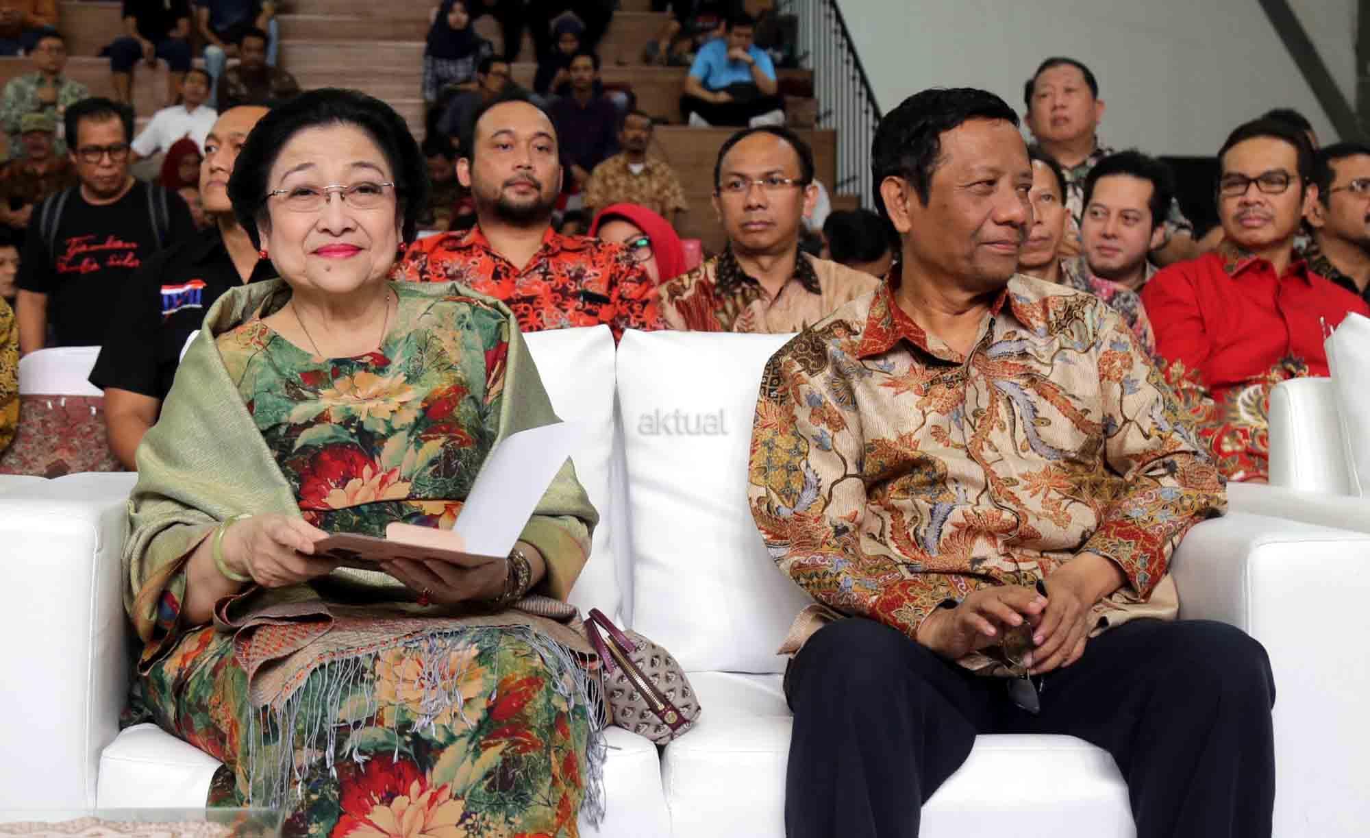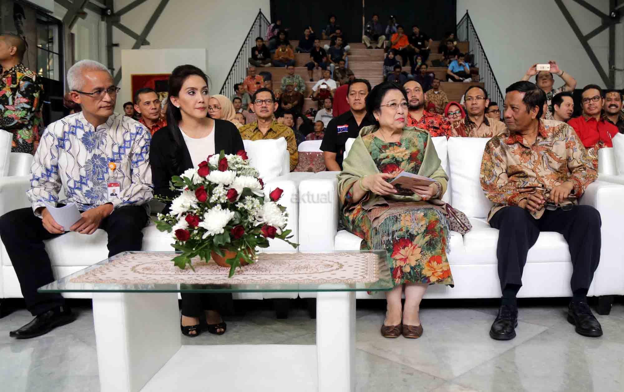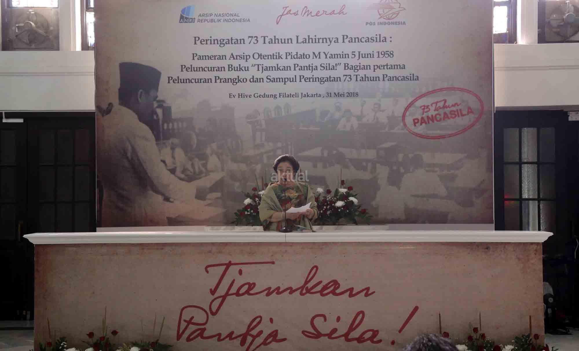 Presiden ke-5 RI sekaligus Ketua Dewan Pengarah Badan Pembinaan Ideologi Pancasila (BPIP) Megawati Soekarnoputri didampingi Anggota Dewan Pengarah BPIP Mahfud MD, Ketua BPIP Yudi Latif, Duta Arsip Nasional sekaligus politikus PDIP Rieke Diah Pitaloka, Dirut PT POS Gilarsi Wahyu Setijono dan Kepala Arsip Nasional RI Mustari Irawan saat menghadiri Peringatan 73 Tahun Lahirnya Pancasila dan peluncuran buku di Museum Filateli, Jakarta, Kamis (31/5/18). Dalam Acara tersebut PT Pos Indonesia (Persero) bekerjasama dengan Arsip Nasional Republik Indonesia (ANRI) meluncurkan Prangko Bung Karno di Sidang BPUPK serta Sampul Hari Pertama Peringatan 73 Tahun Lahirnya Pancasila. Dalam acara peringatan Pancasila tersebut juga diluncurkan buku ‘Tjamkan Pantja Sila’: Sistem Filsaafat Pancasila, yang merupakan tulisan tangan Bung Karno tentang makna dan gagasan Ideologi Pancasila. AKTUAL/Tino Oktaviano