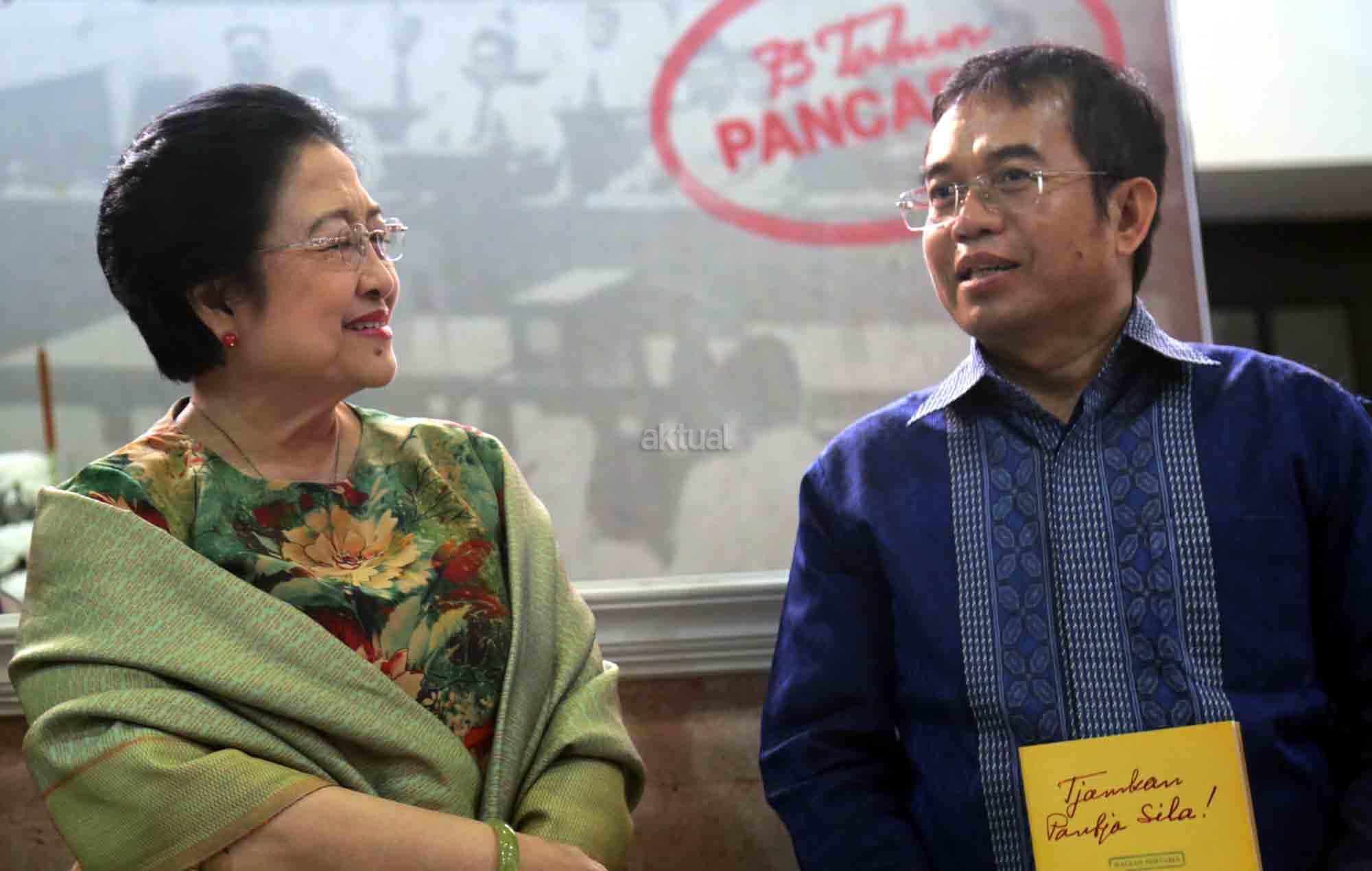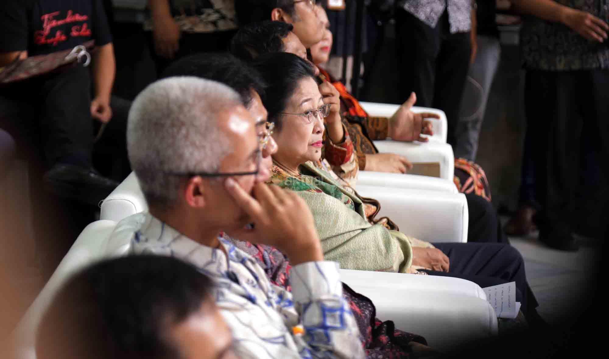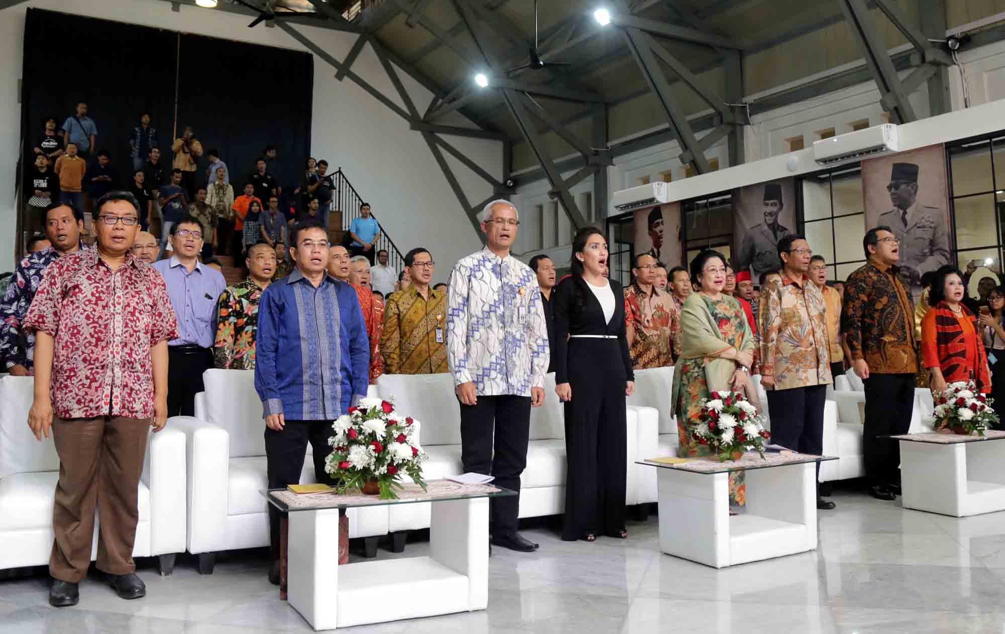 Presiden ke-5 RI sekaligus Ketua Dewan Pengarah Badan Pembinaan Ideologi Pancasila (BPIP) Megawati Soekarnoputri didampingi Anggota Dewan Pengarah BPIP Mahfud MD, Ketua BPIP Yudi Latif, Duta Arsip Nasional sekaligus politikus PDIP Rieke Diah Pitaloka, disambut Duta Arsip Nasional sekaligus politikus PDIP Rieke Diah Pitaloka dan Dirut PT POS Gilarsi Wahyu Setijono saat menghadiri Peringatan 73 Tahun Lahirnya Pancasila dan peluncuran buku di Museum Filateli, Jakarta, Kamis (31/5/18). Dalam Acara tersebut PT Pos Indonesia (Persero) bekerjasama dengan Arsip Nasional Republik Indonesia (ANRI) meluncurkan Prangko Bung Karno di Sidang BPUPK serta Sampul Hari Pertama Peringatan 73 Tahun Lahirnya Pancasila. Dalam acara peringatan Pancasila tersebut juga diluncurkan buku ‘Tjamkan Pantja Sila’: Sistem Filsaafat Pancasila, yang merupakan tulisan tangan Bung Karno tentang makna dan gagasan Ideologi Pancasila. AKTUAL/Tino Oktaviano