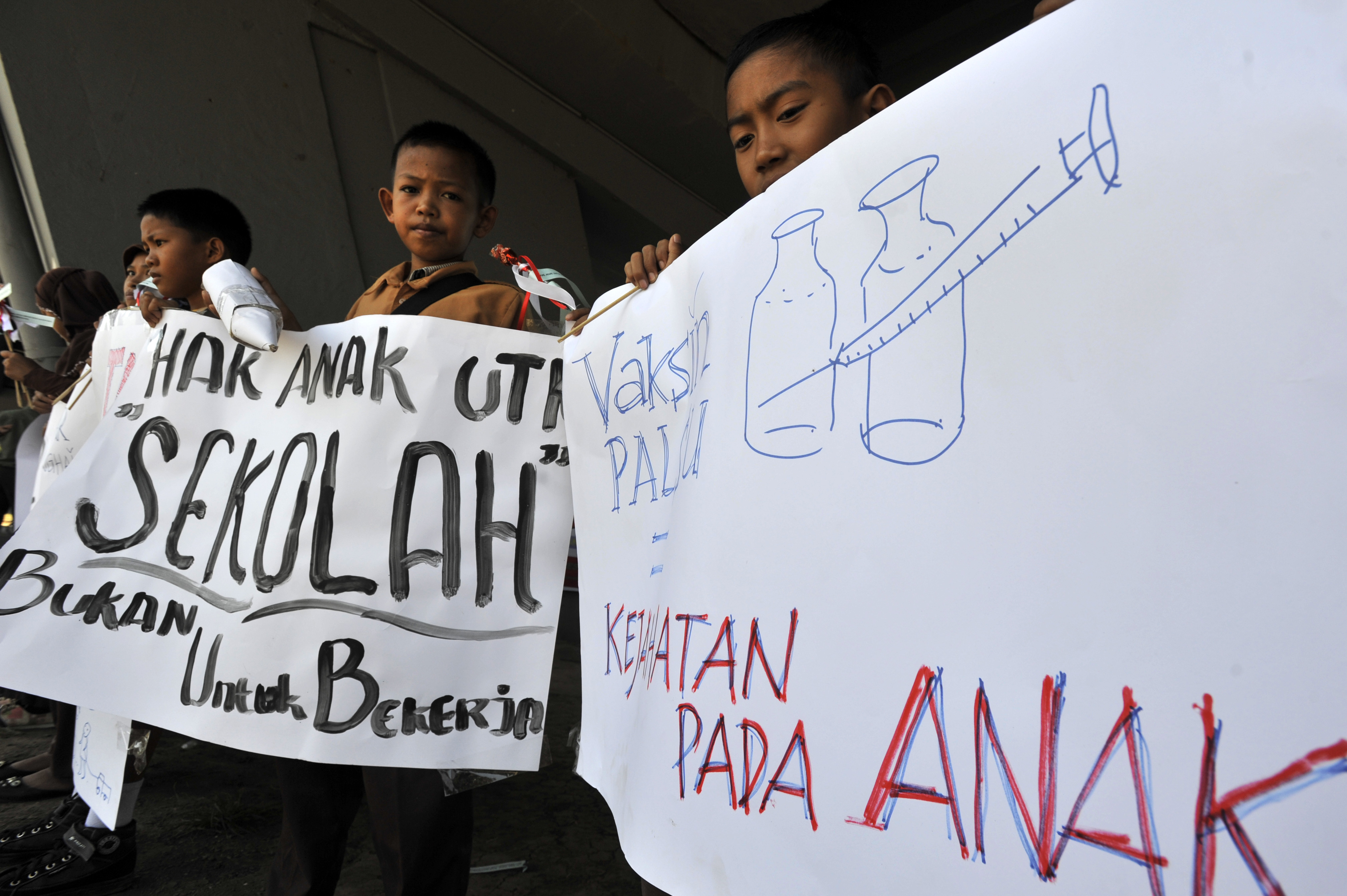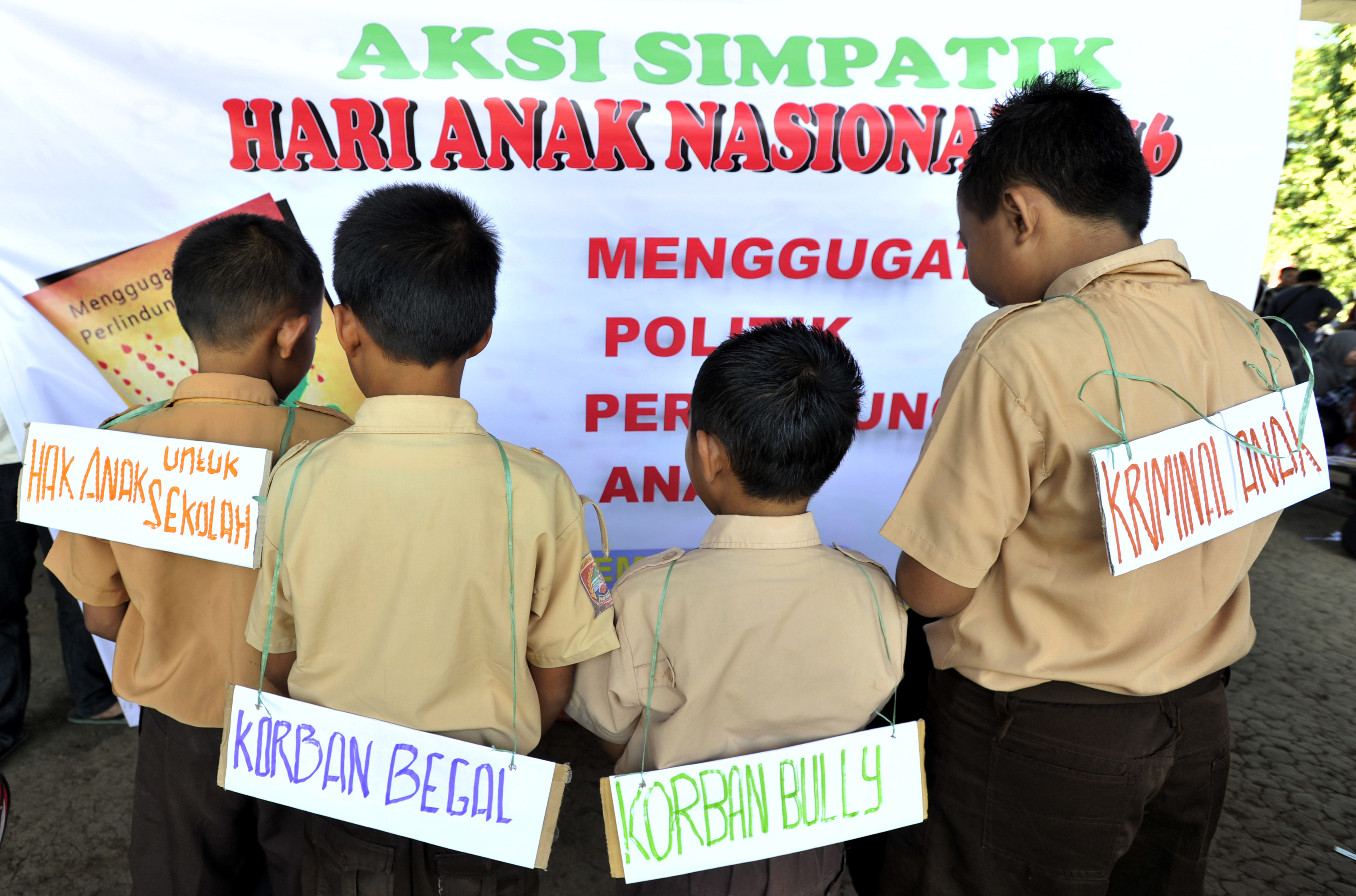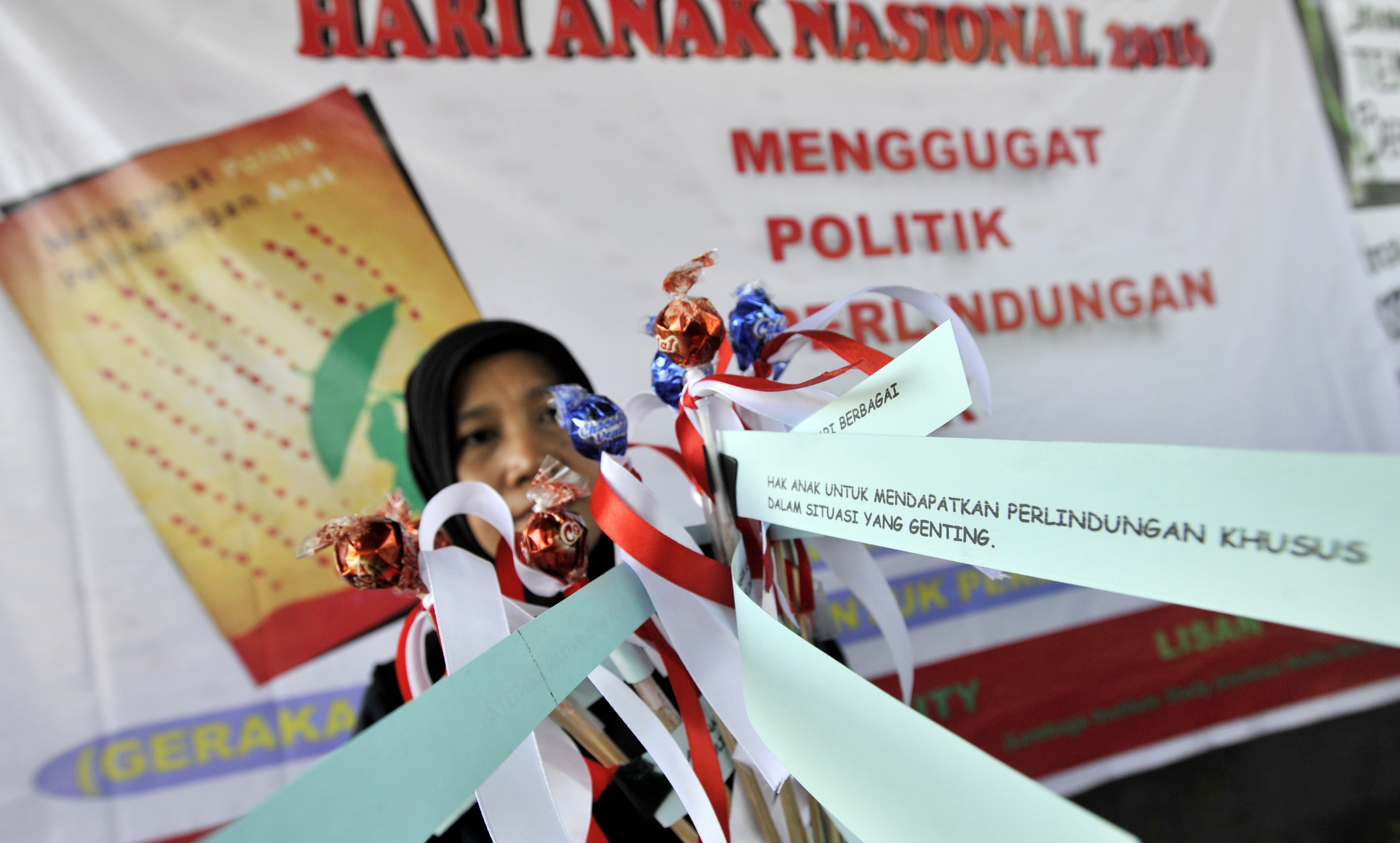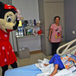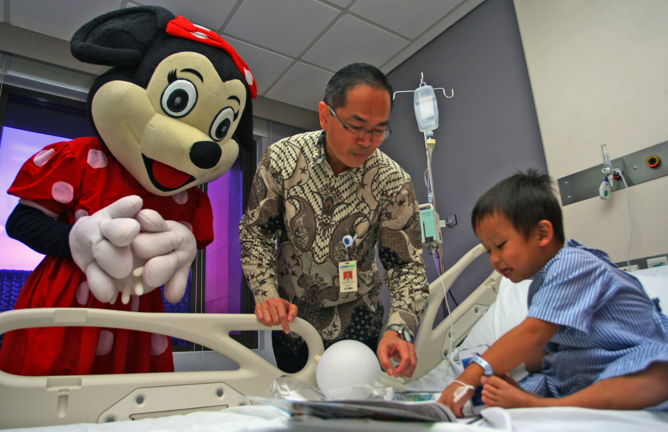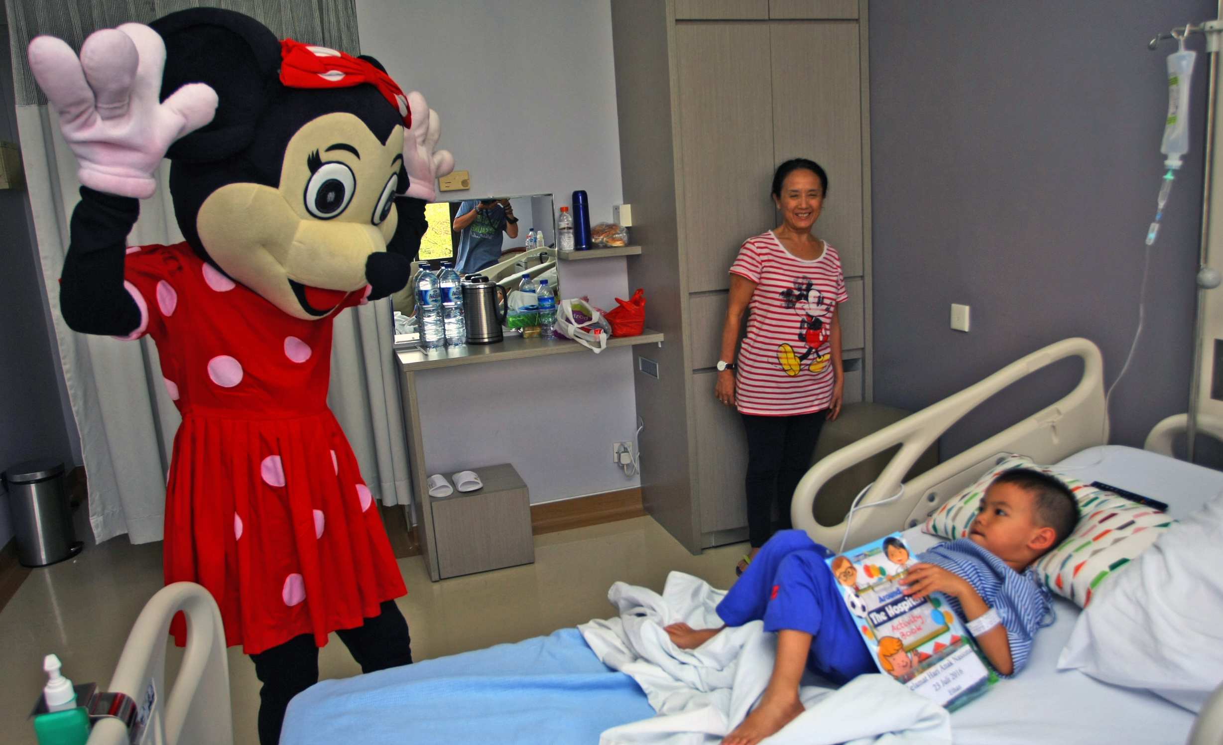 Badut Minnie Mouse menghibur seorang anak yang tengah mendapatkan perawatan di Siloam Hospital Karawaci, Tangerang, Banten, Sabtu (23/7). Dalam memperingati Hari Anak Nasional yang jatuh setiap tanggal 23 Juli manajemen rumah sakit Siloam memberikan hiburan dan hadiah bagi sejumlah anak yang sedang dirawat di rumah sakit tersebut. ANTARA FOTO/Muhammad Iqbal/ama/16
