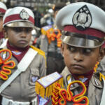 Sejumlah polisi cilik asal Papua Barat berbaris saat memperingati puncak Hari Anak Nasional (HAN) di Lapangan Sangkareang, Mataram, NTB, Sabtu (23/7). Peringatan HAN yang pertama kali digelar di luar Istana Negara tersebut bertemakan “Akhiri Kekerasan Pada Anak” dan dihadiri oleh 3000 anak dari seluruh Indonesia. ANTARA FOTO/Ahmad Subaidi/ama/16.
