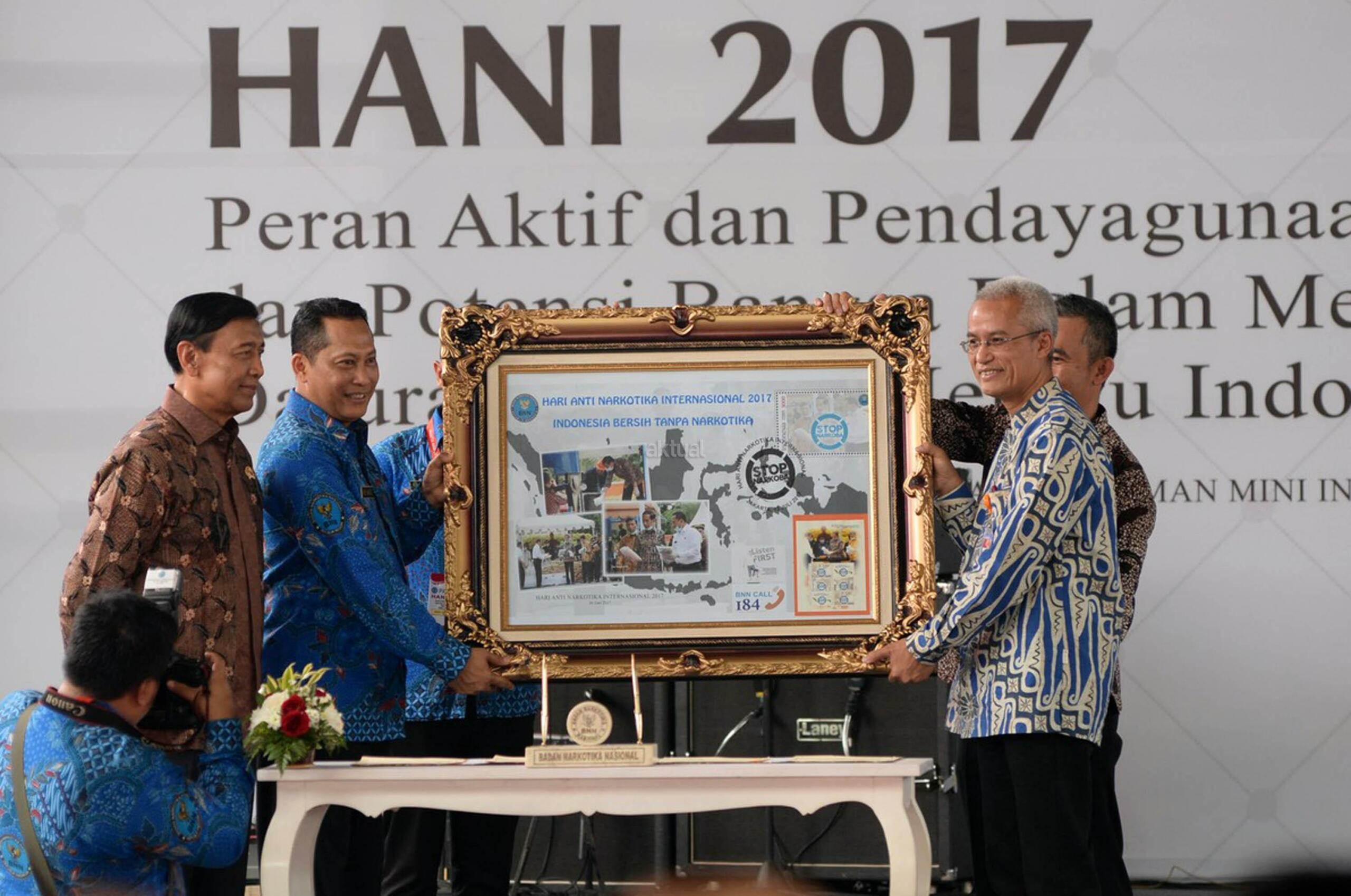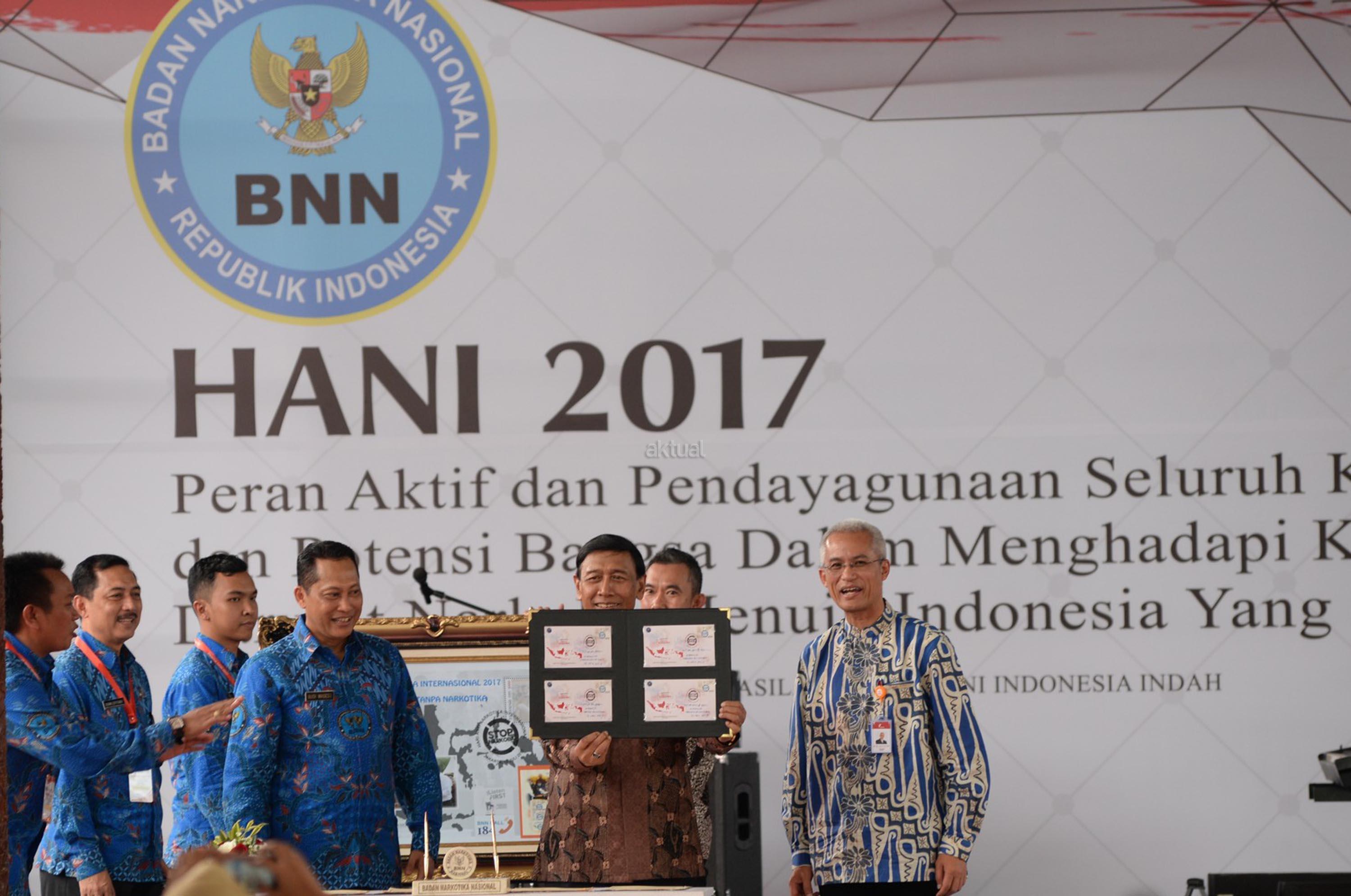 Menko Polhukam Wiranto (tengah) menunjukan prangko edisi HANI 2017 dalam puncak peringatan Hari Anti-Narkoba Internasional (HANI) di Plaza Tugu Api Pancasila, Taman Mini Indonesia Indah, Jakarta, Kamis (13/7/2017). Acara HANI tahun ini mengambil tema “Peran Aktif dan Pendayagunaan Seluruh Komponen dan Potensi Bangsa Dalam Menghadapi Keadaan Darurat Narkoba Menuju Indonesia Yang Sehat”. Selain itu juga Acara Hani 2017 dihadiri oleh Panglima TNI Gatot Nurmantyo, Ketua DPD Oesman Sapta, Menkopolhukam Wiranto, sertaKepala daerah dan tokoh agama dan masyarakat, Lembaga Swadaya Masyarakat (LSM), serta pelajar dan mahasiswa. AKTUAL/Munzir