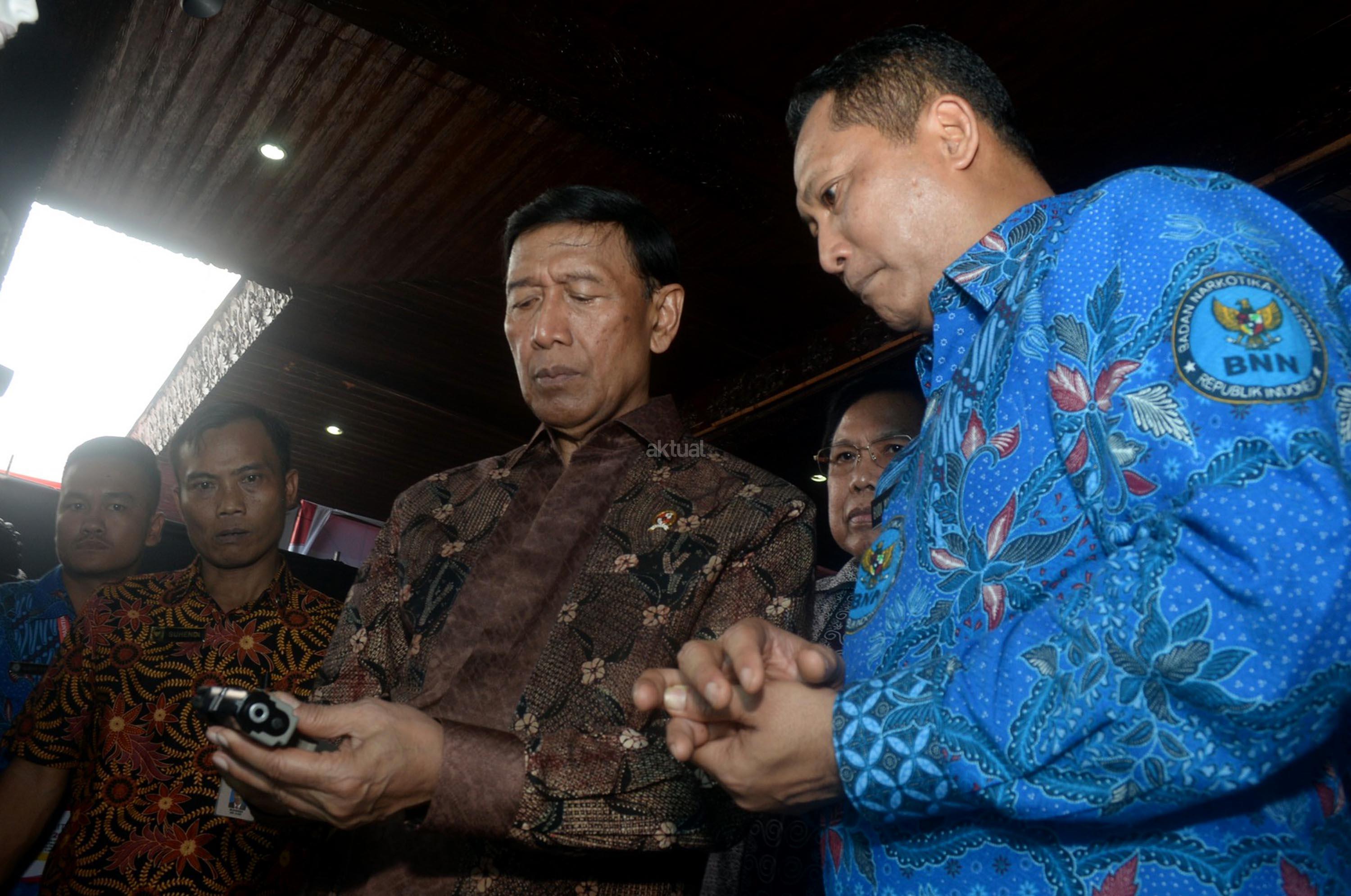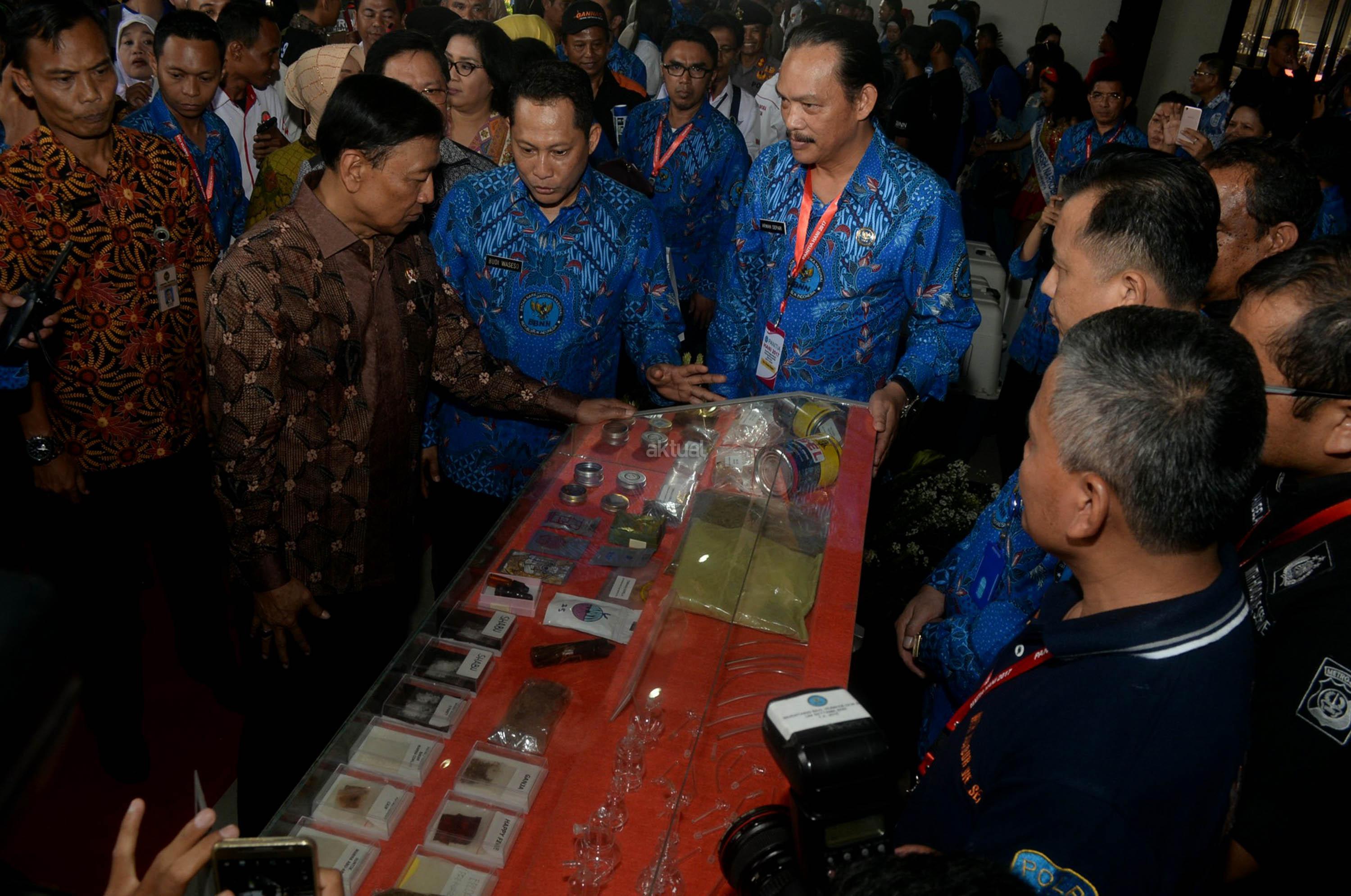 Menkopolhukam Wiranto meninjau sejumlah stand antinarkoba yang didirikan oleh para pelajar dan aktifis anti narkoba di Plaza Tugu Api Pancasila Taman Mini Indonesia Indah (TMII), Jakarta Timur, Kamis (13/7/2017). Peringatan HANI 2017 bertema, “Listen First: Listening to Children and Youth is The First Step to Help Them Grow Healthy and Safe”. AKTUAL/Munzir