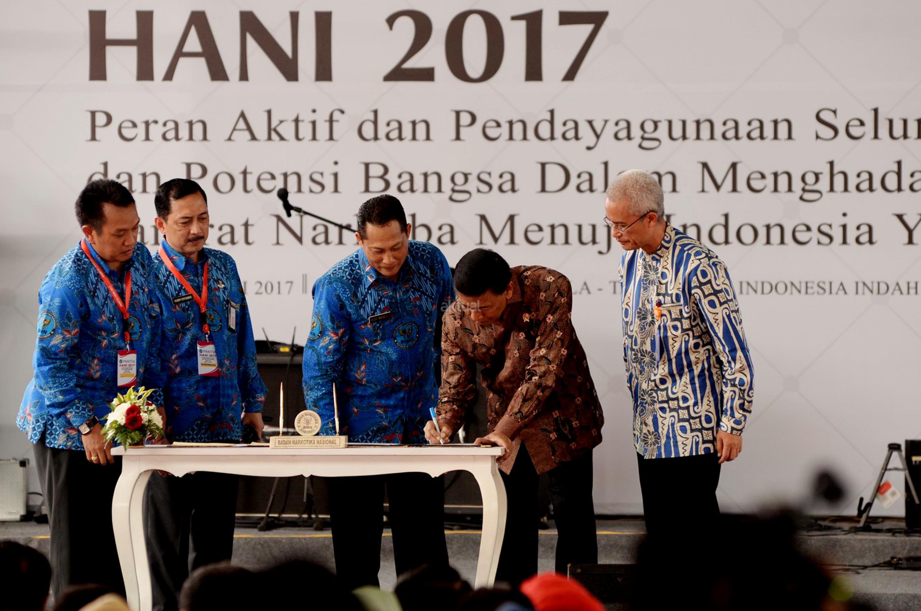 Menko Polhukam Wiranto menandatangai prangko edisi HANI 2017 dalam puncak peringatan Hari Anti-Narkoba Internasional (HANI) di Plaza Tugu Api Pancasila, Taman Mini Indonesia Indah, Jakarta, Kamis (13/7/2017).Acara HANI tahun ini mengambil tema “Peran Aktif dan Pendayagunaan Seluruh Komponen dan Potensi Bangsa Dalam Menghadapi Keadaan Darurat Narkoba Menuju Indonesia Yang Sehat”. Selain itu juga Acara Hani 2017 dihadiri oleh Panglima TNI Gatot Nurmantyo, Ketua DPD Oesman Sapta, Menkopolhukam Wiranto, sertaKepala daerah dan tokoh agama dan masyarakat, Lembaga Swadaya Masyarakat (LSM), serta pelajar dan mahasiswa. AKTUAL/Munzir